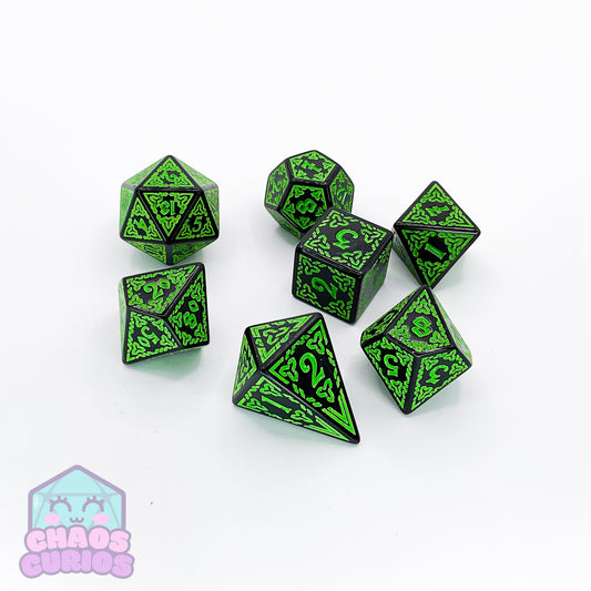 Green Black Glyph 7-piece Dice Set - Quadrilateral/Kite D4