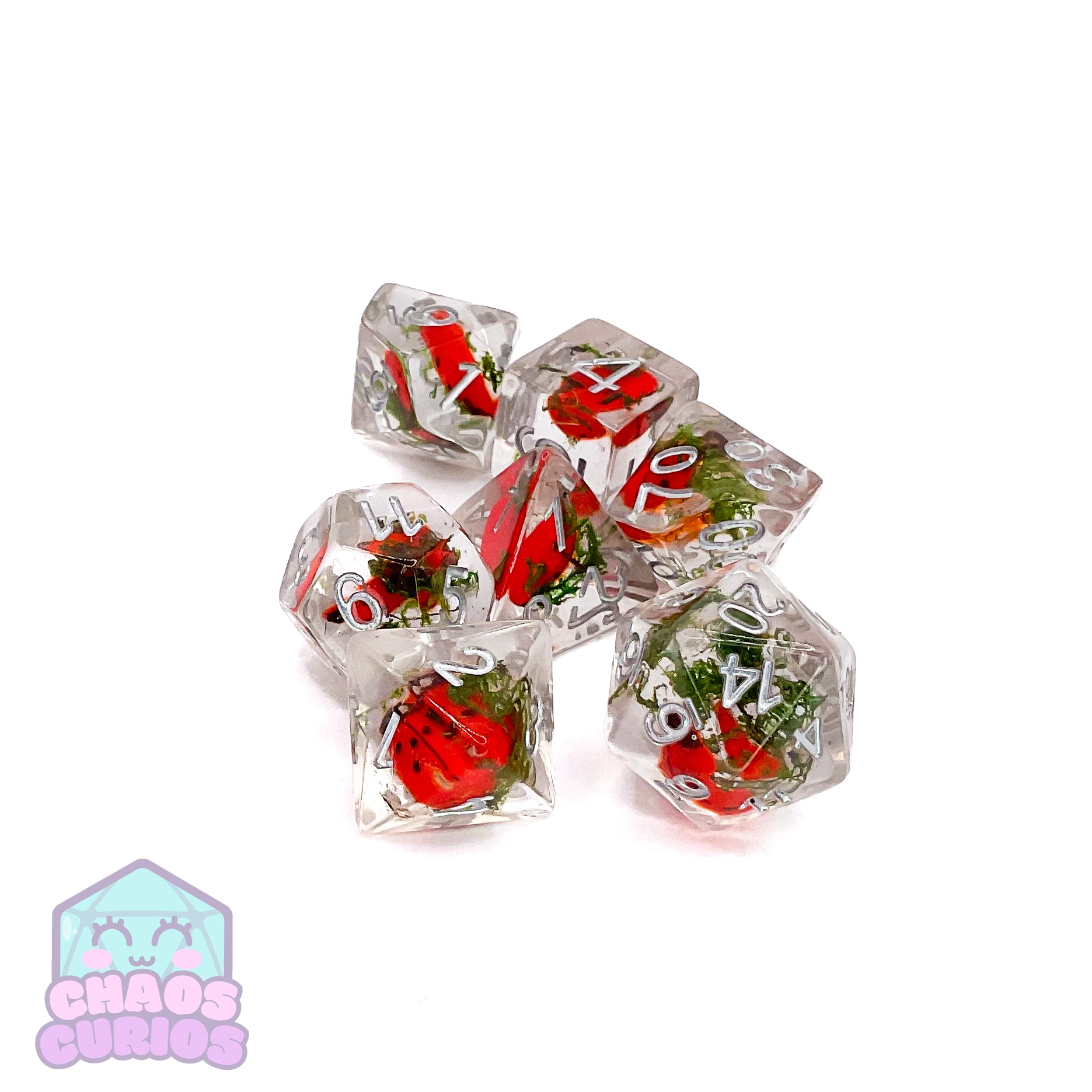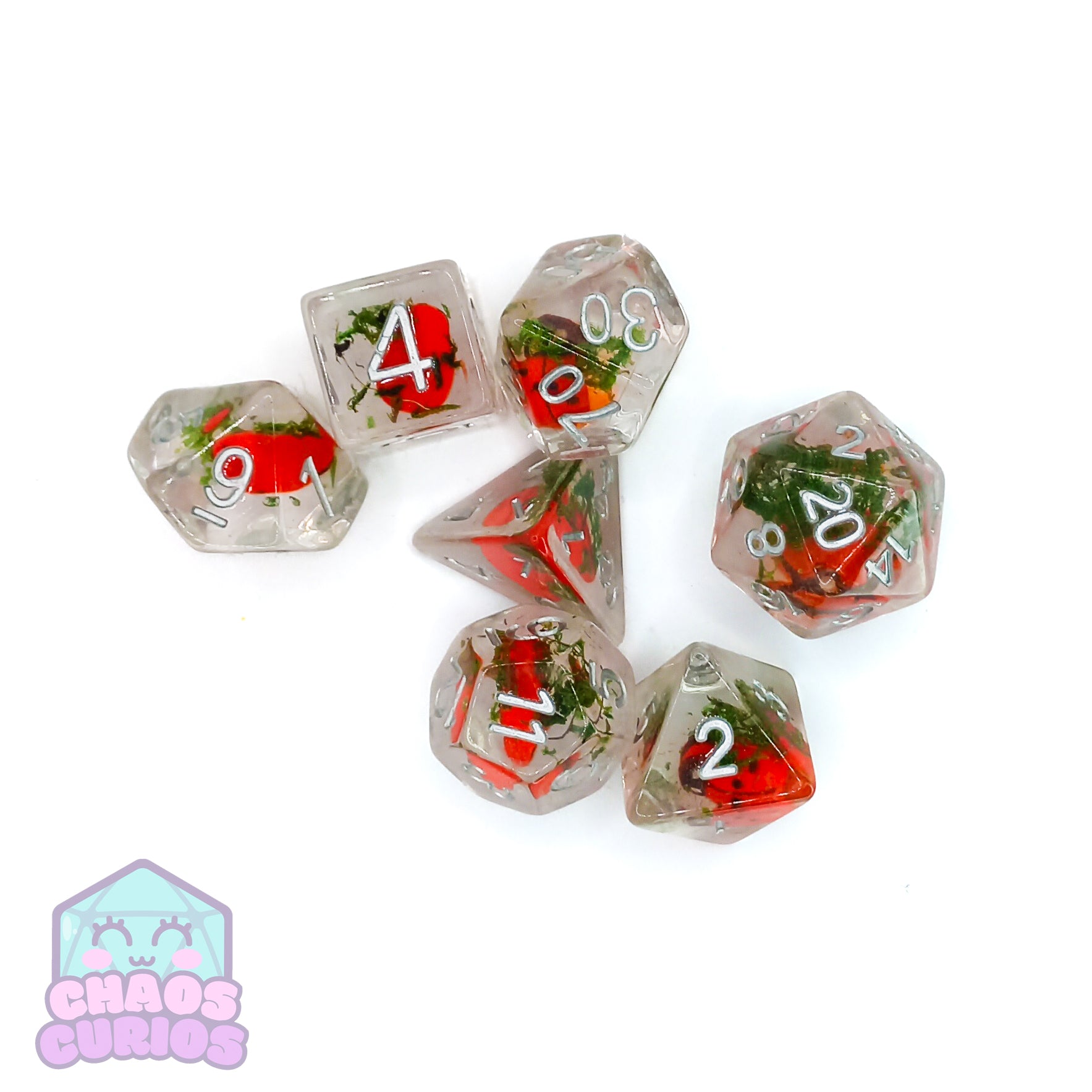 7-piece Resin dice set for use with a variety of role playing games. D20, D12, D10, D100, D8, D6 and D4.