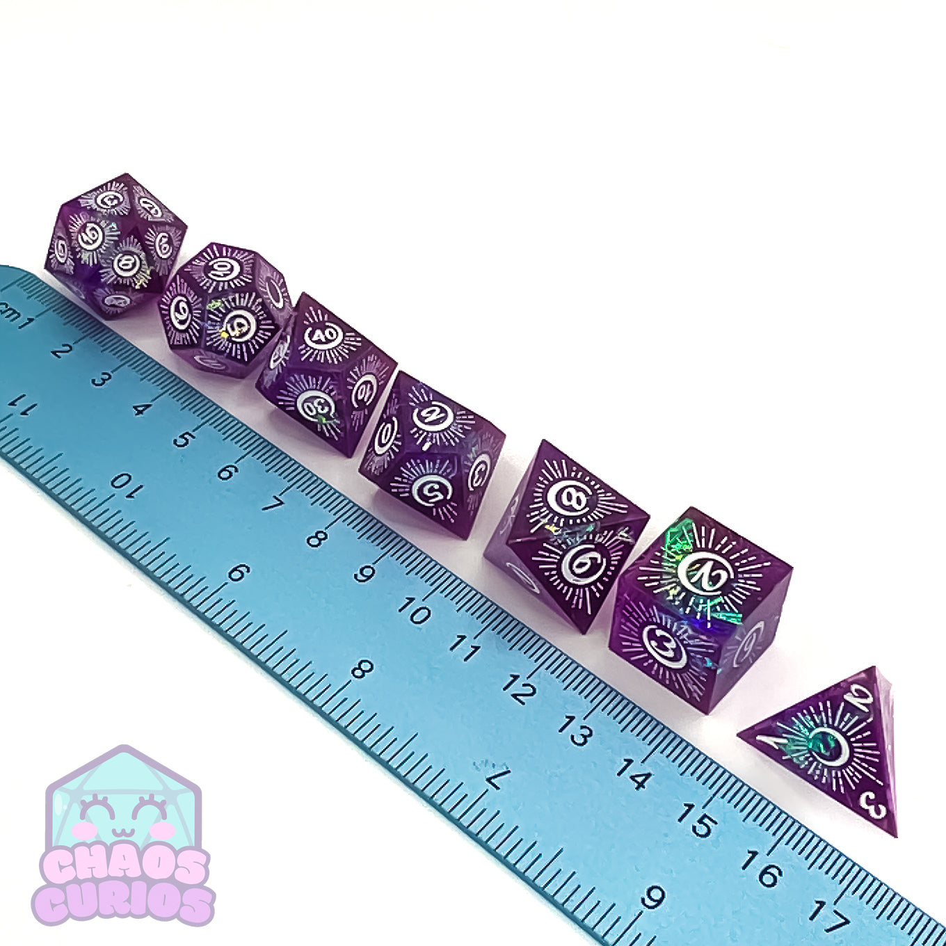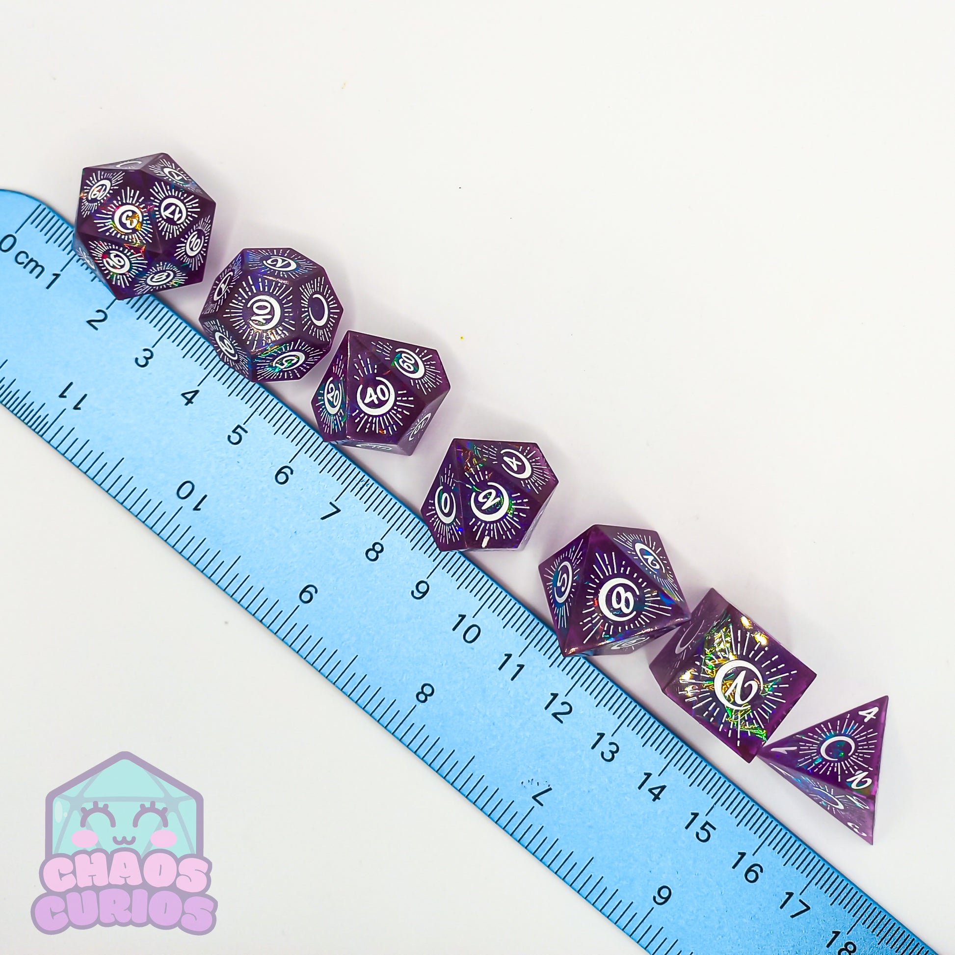 7-piece Sharp Edged Resin dice set for use with a variety of role playing games. D20, D12, D10, D100, D8, D6 and D4.