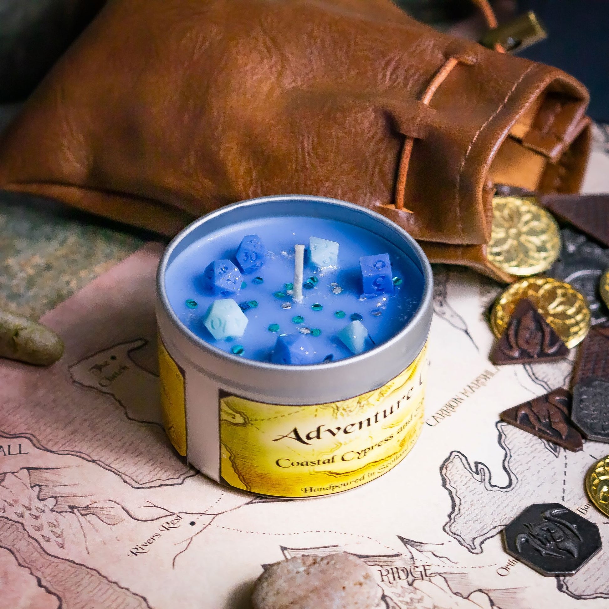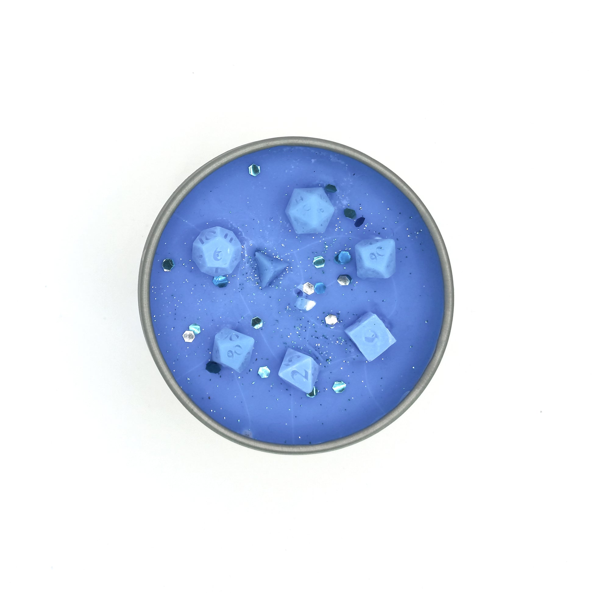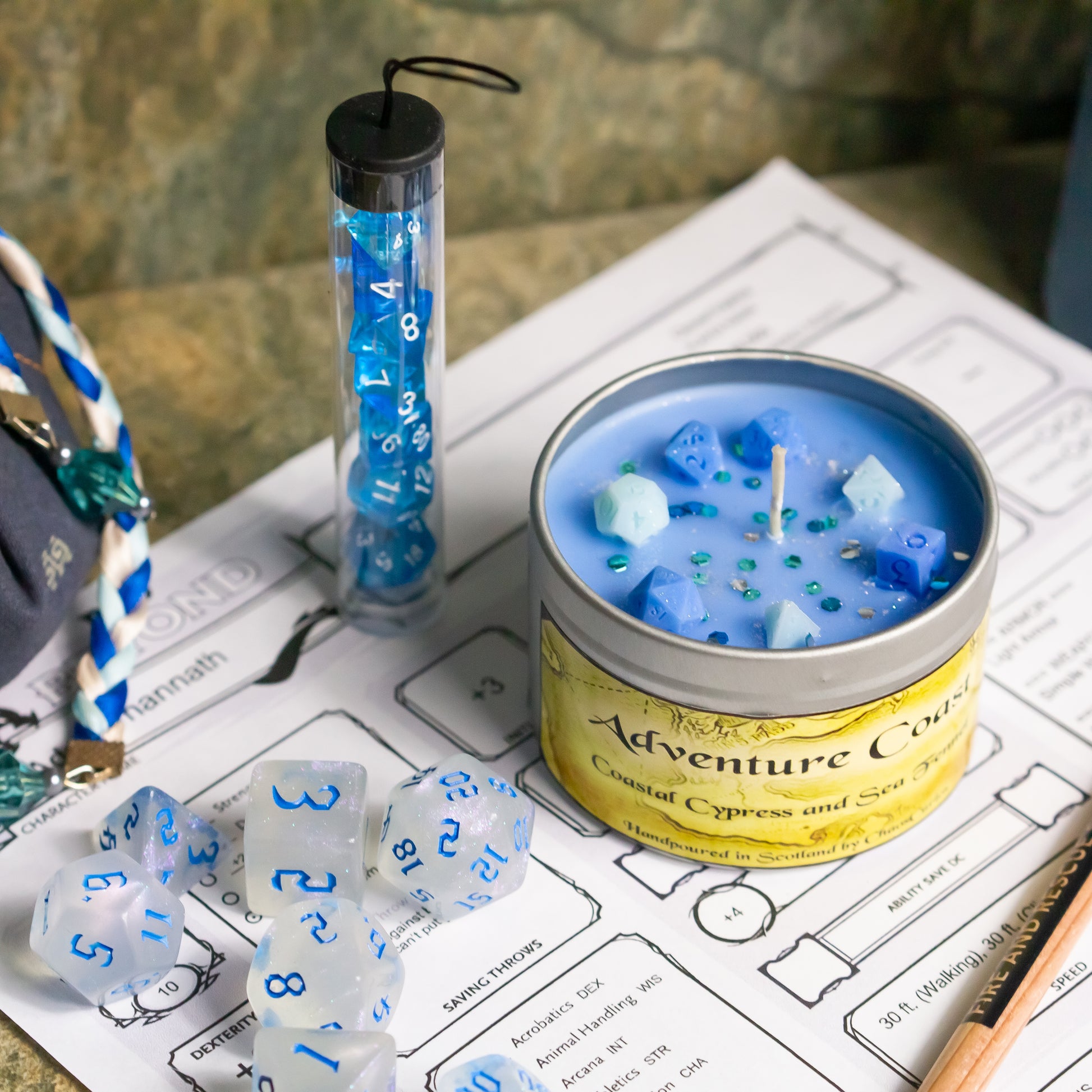 A beautiful candle scented with Coastal Cypress and Sea Fennel, with Dice shaped wax melts atop complete with either a wool or wooden wick and eco glitters. A perfect gift for any DnD player or Roleplayer!