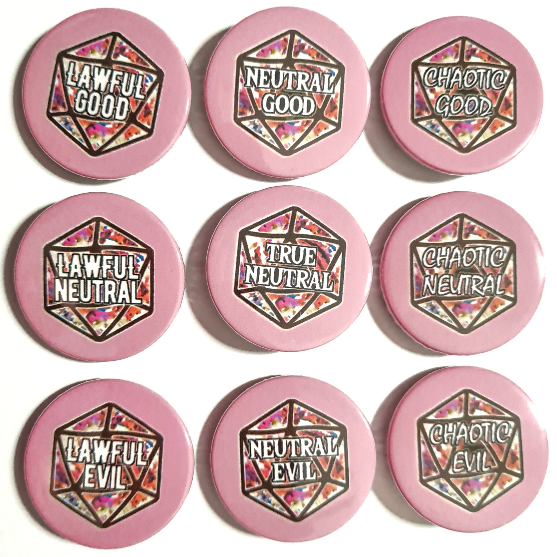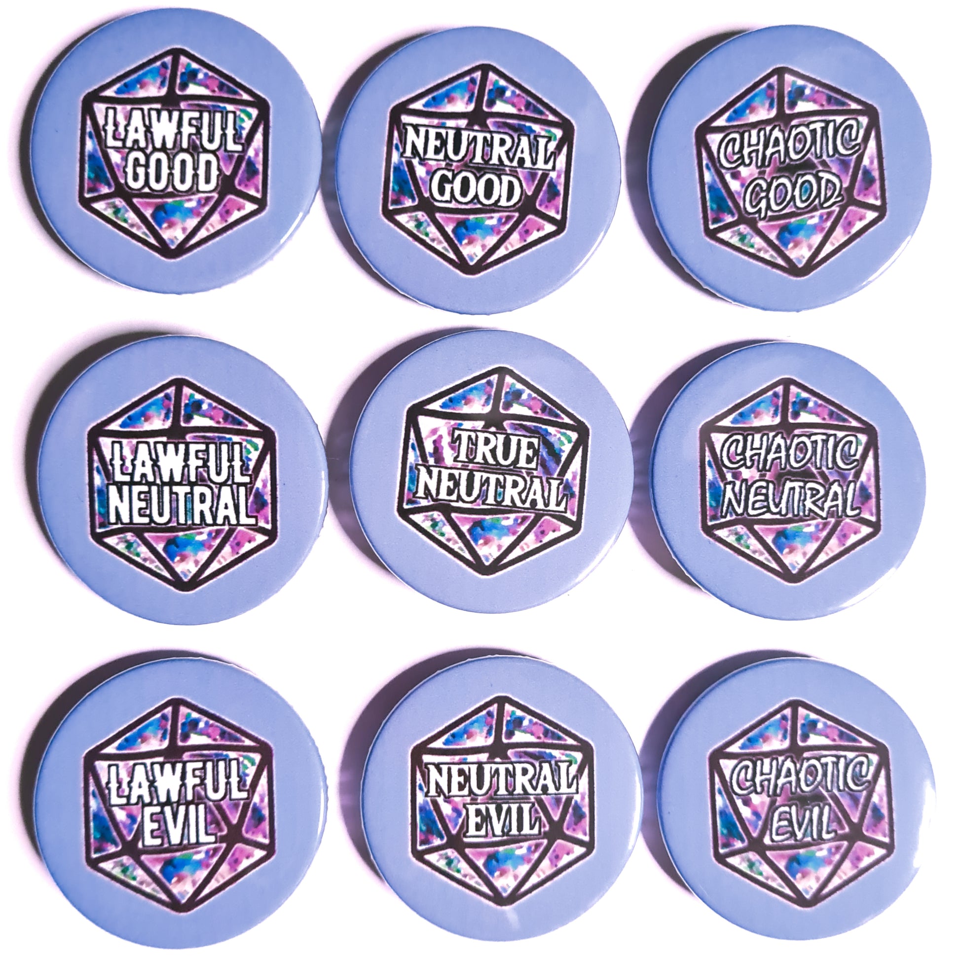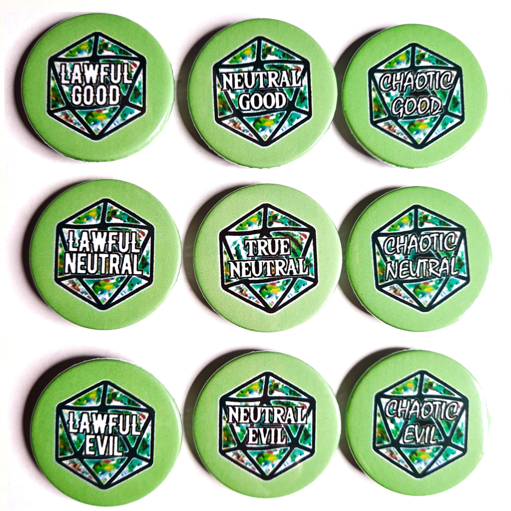 Are you Lawful Evil or Chaotic Neutral? Show your unique alignment with this stylish badge, available in many colours! Just the thing to give your wardrobe a bit of DnD flair.