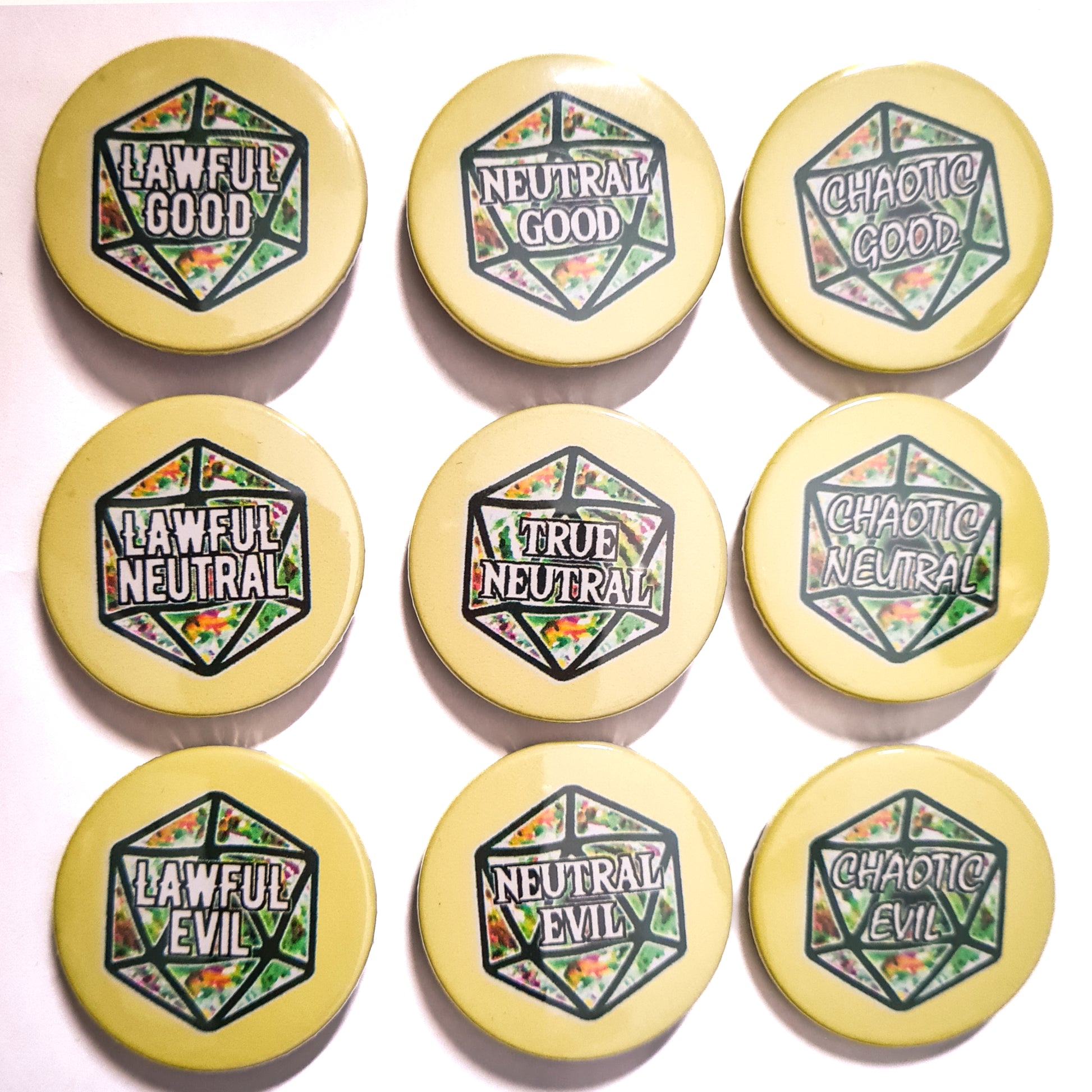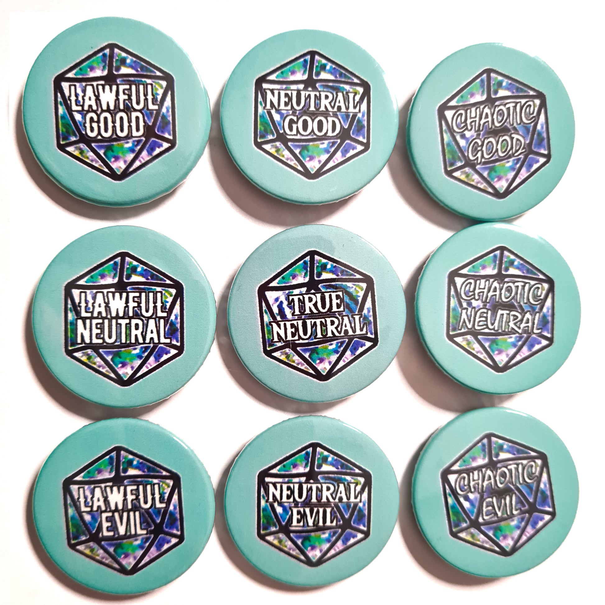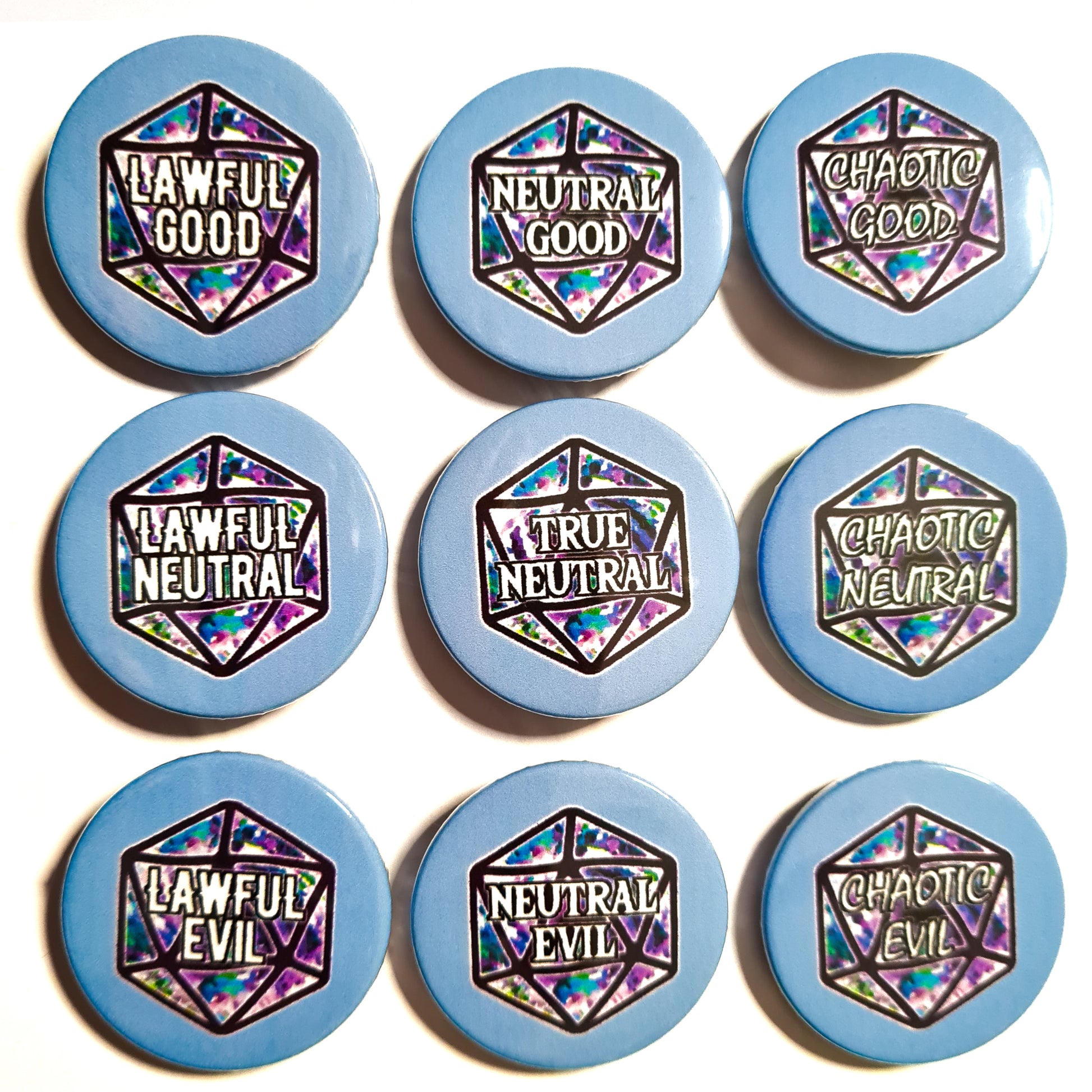 Are you Lawful Evil or Chaotic Neutral? Show your unique alignment with this stylish badge, available in many colours! Just the thing to give your wardrobe a bit of DnD flair.