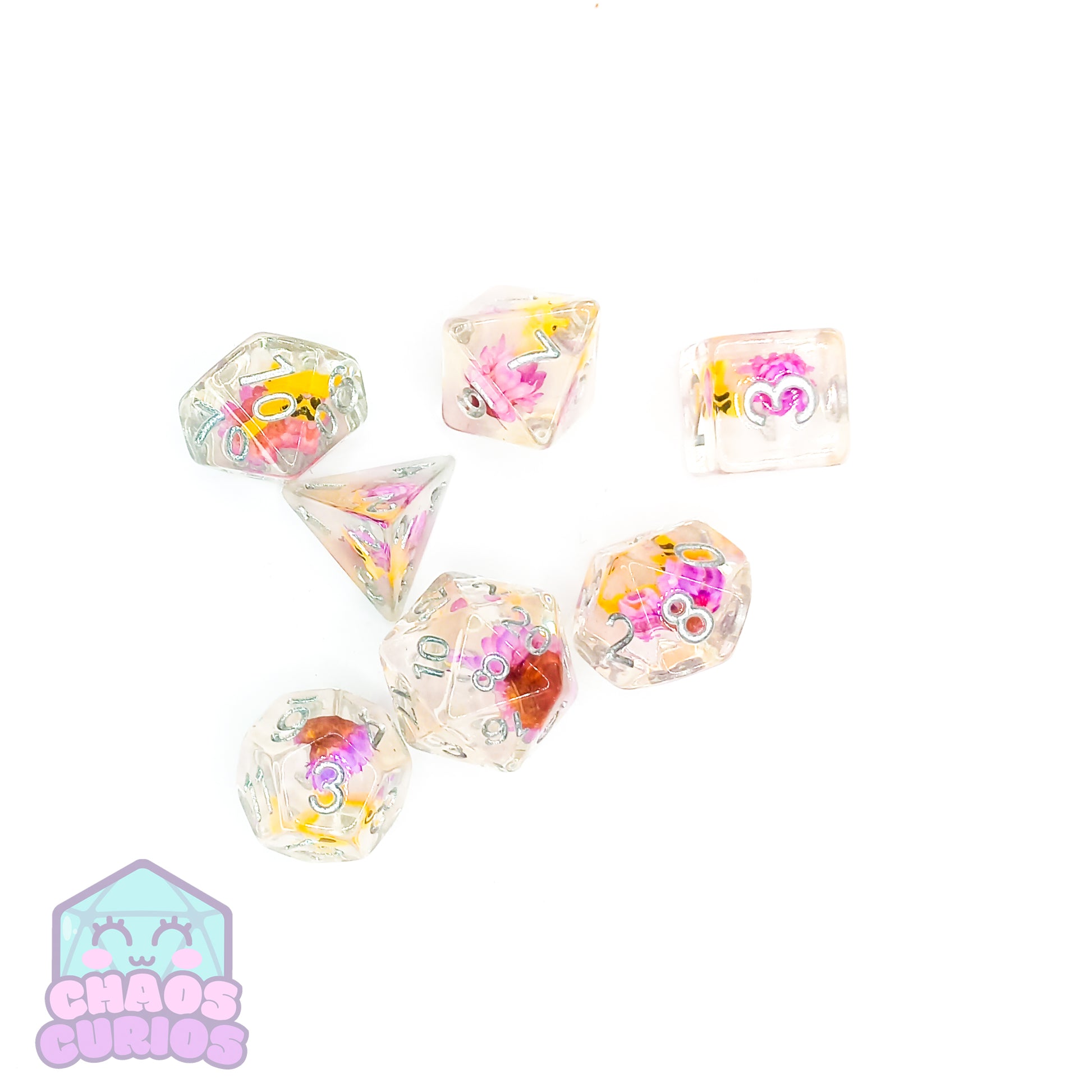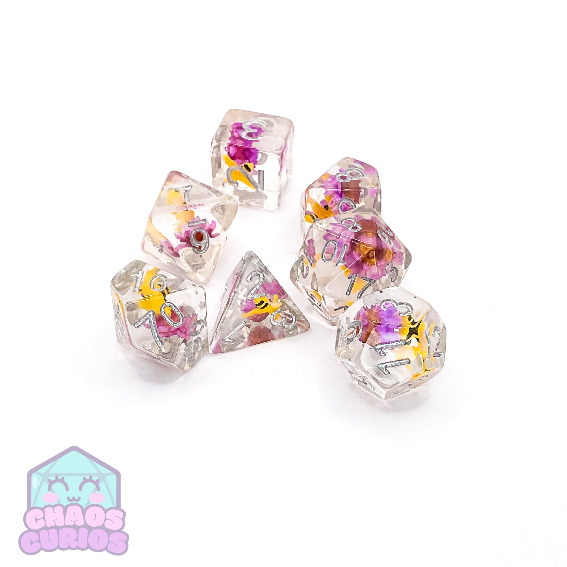 7-piece Resin dice set for use with a variety of role playing games. D20, D12, D10, D100, D8, D6 and D4.