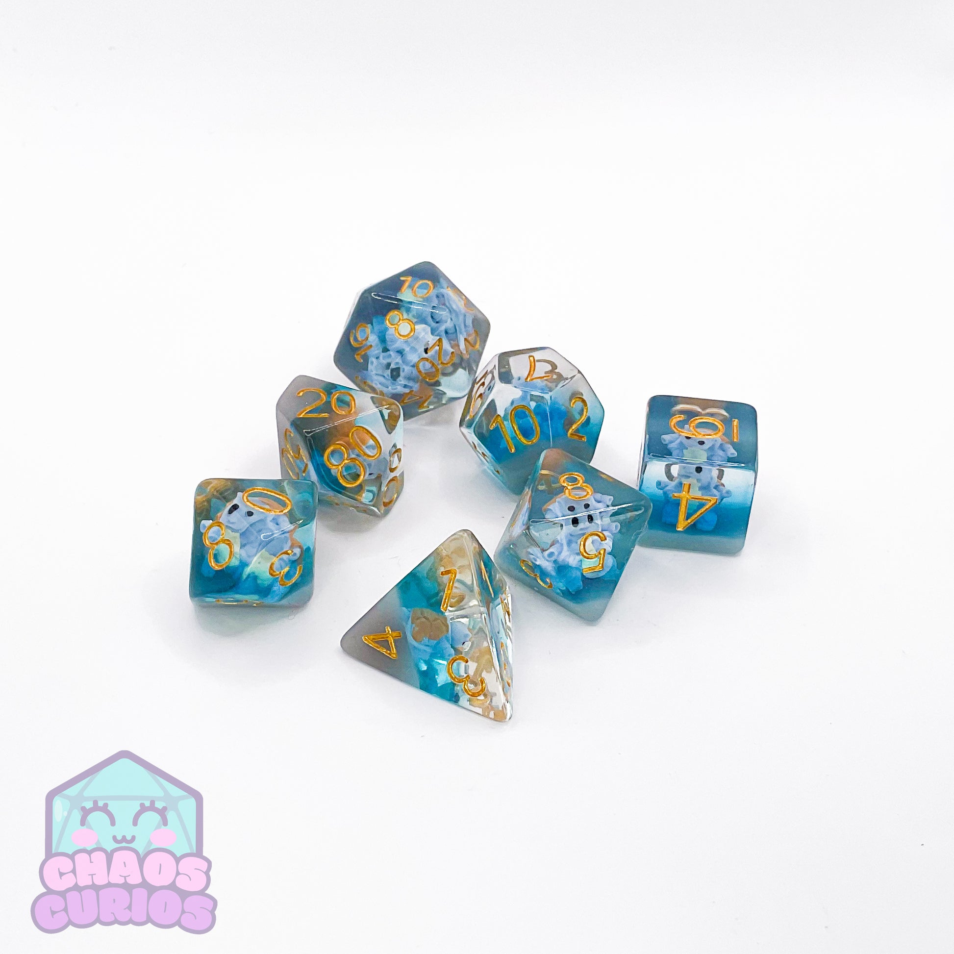 7-piece Resin dice set for use with a variety of role playing games. D20, D12, D10, D100, D8, D6 and D4.