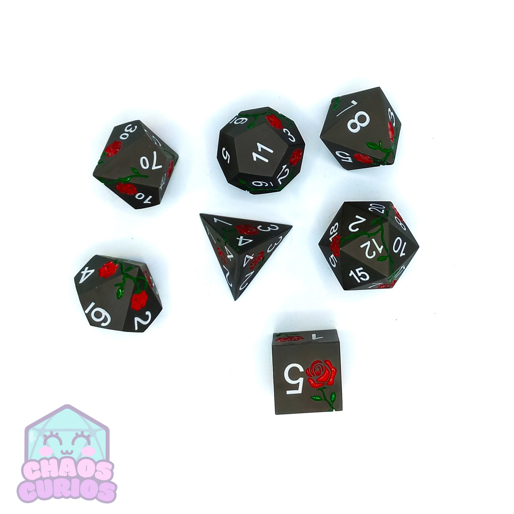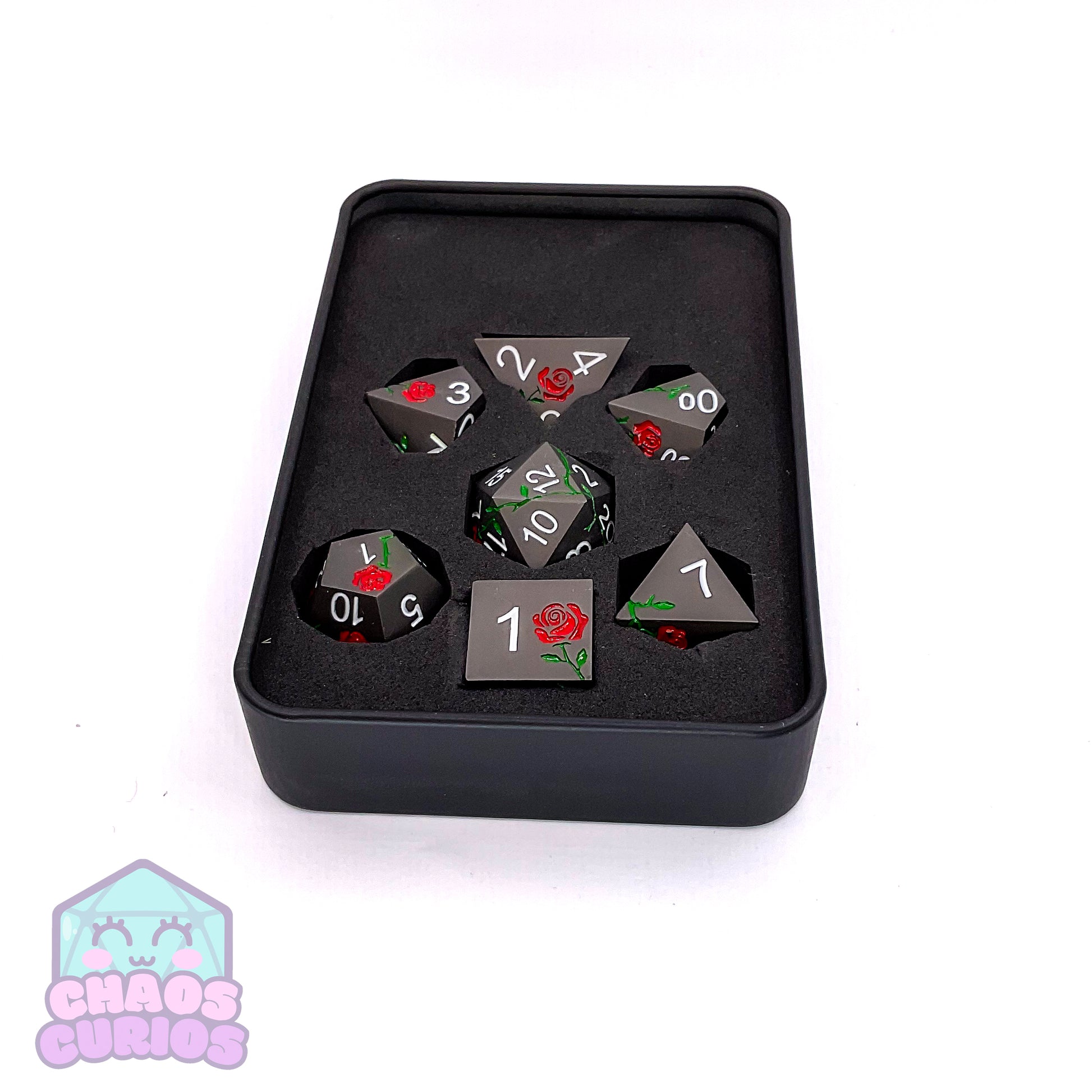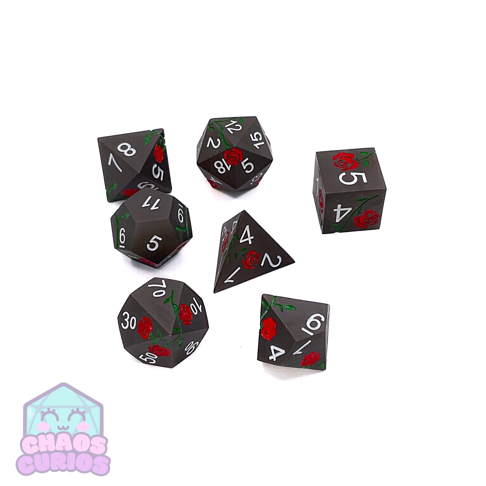 7-piece Metal dice set for use with a variety of role playing games. D20, D12, D10, D100, D8, D6 and D4.
