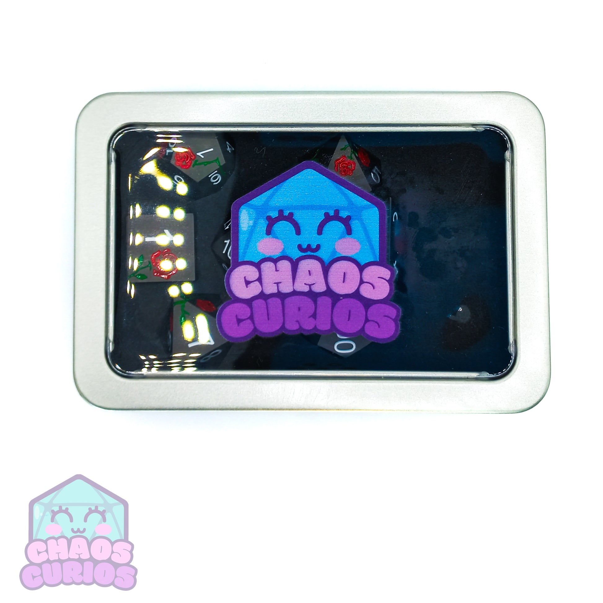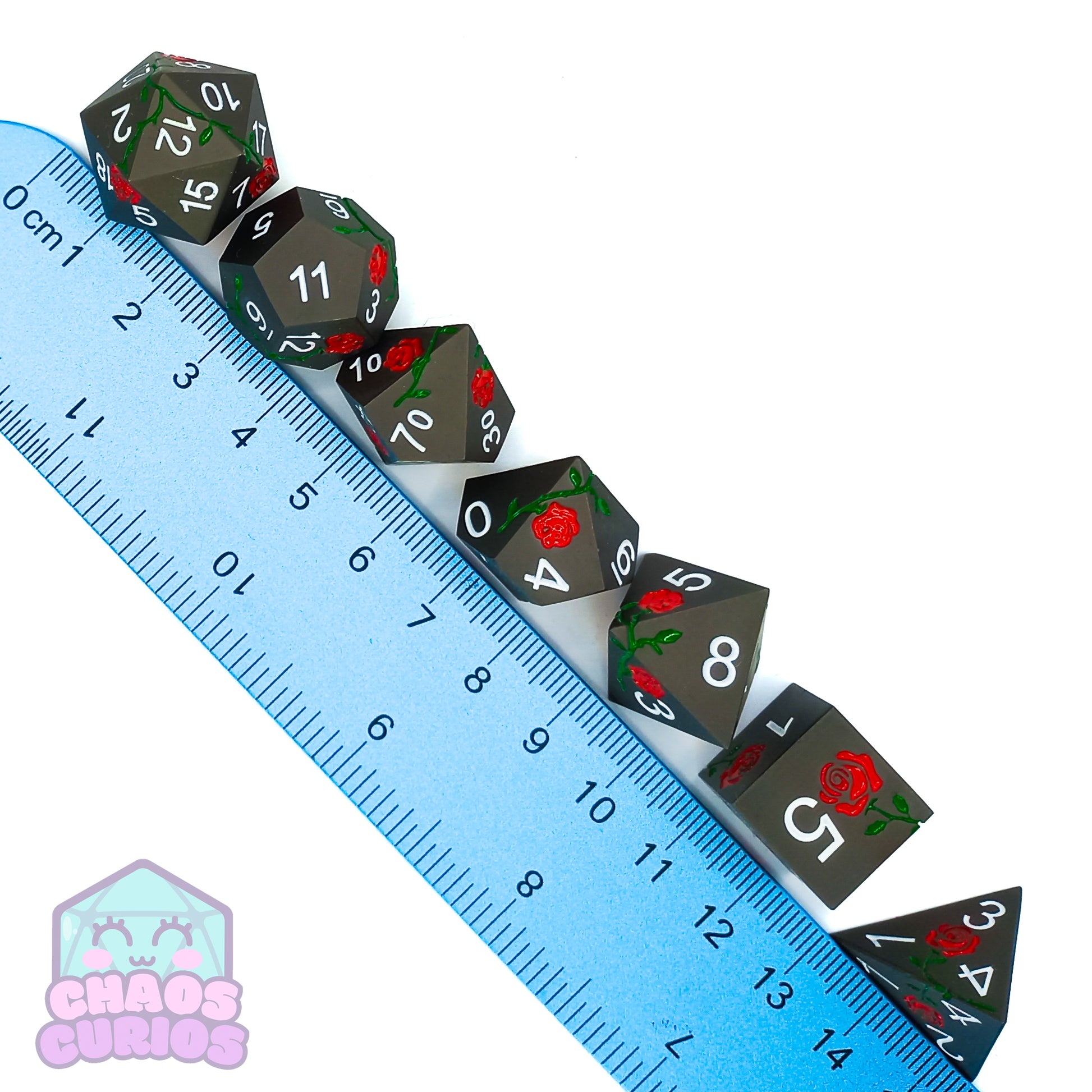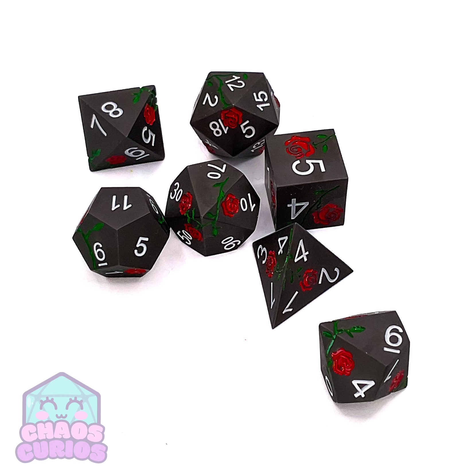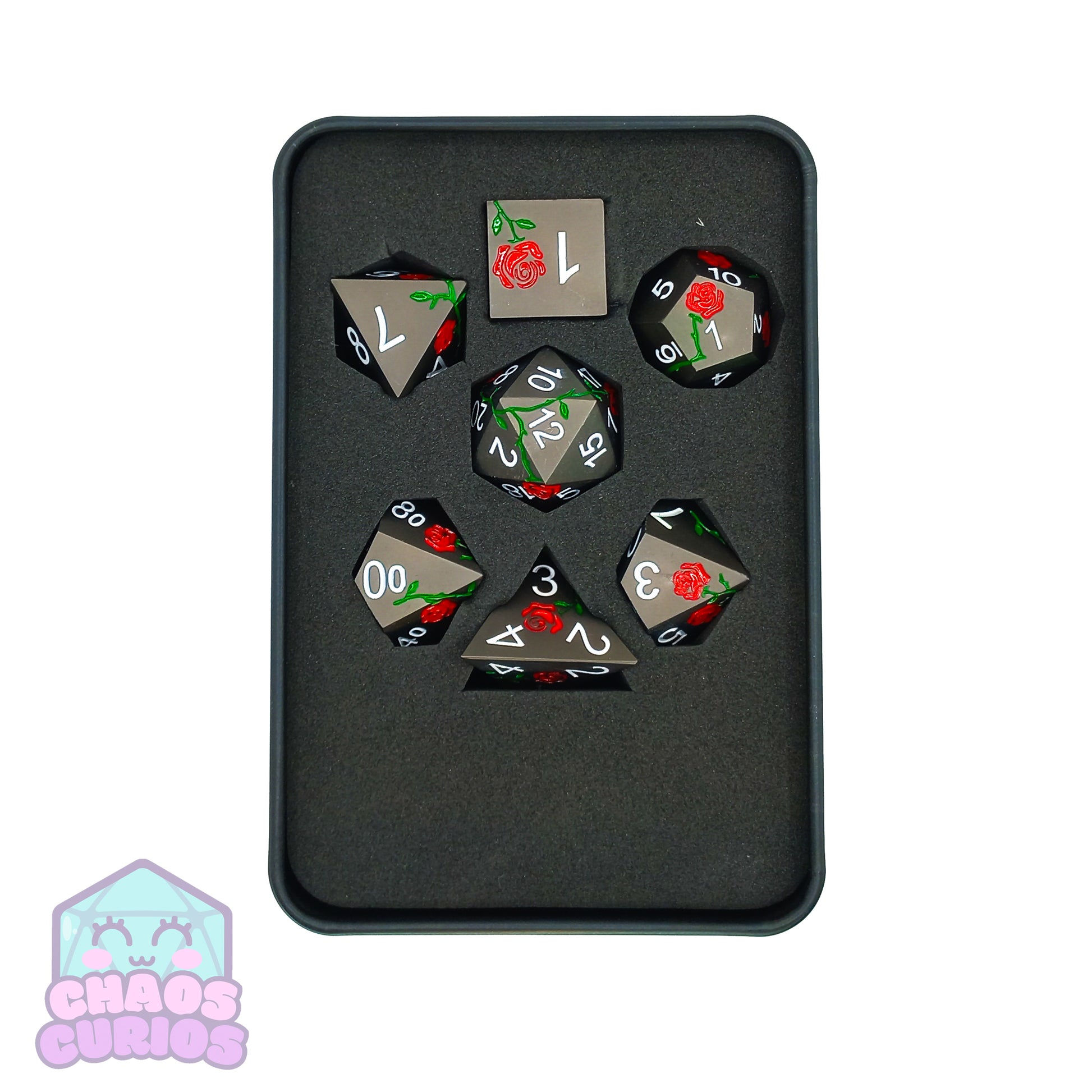7-piece Metal dice set for use with a variety of role playing games. D20, D12, D10, D100, D8, D6 and D4.
