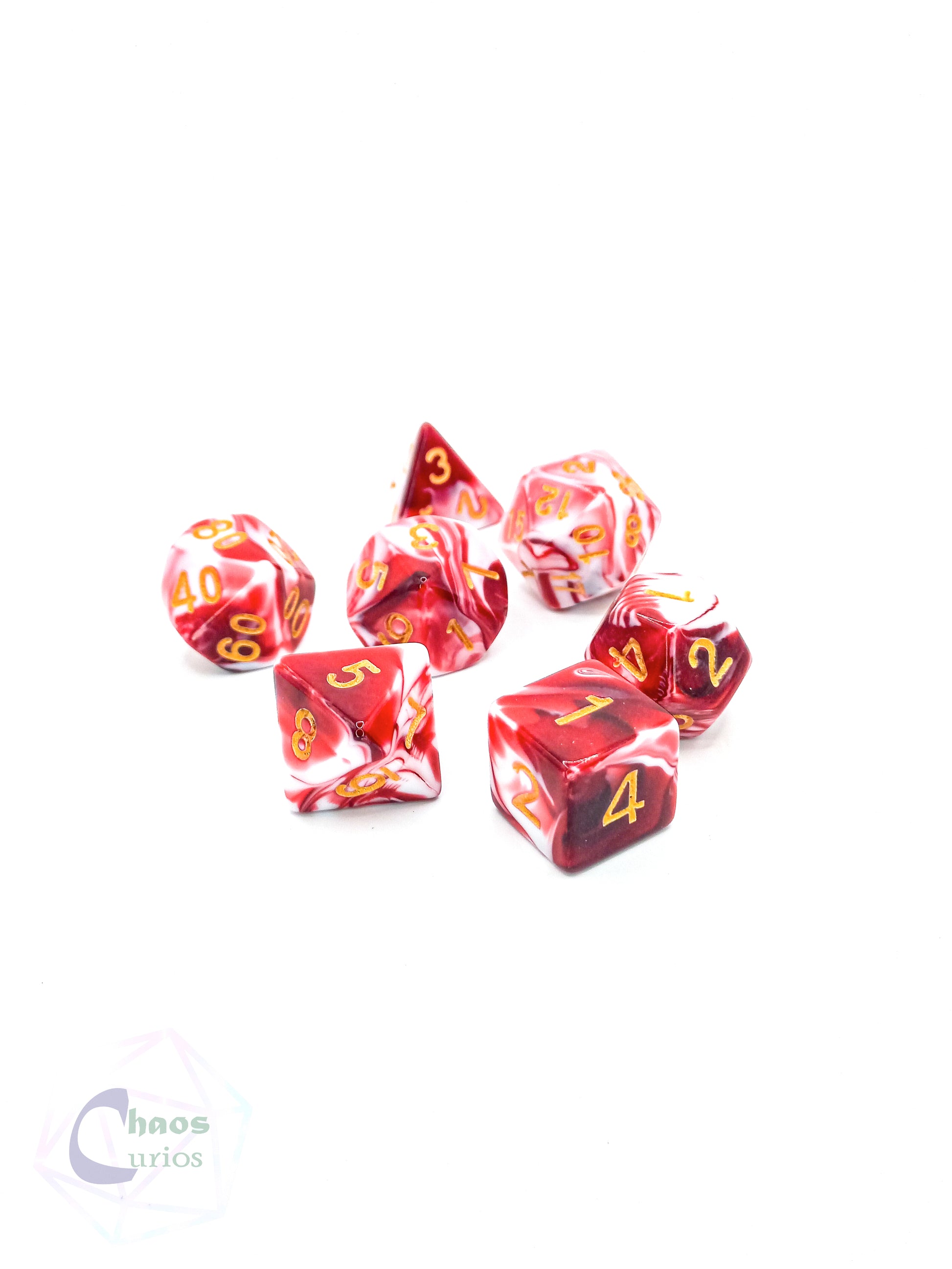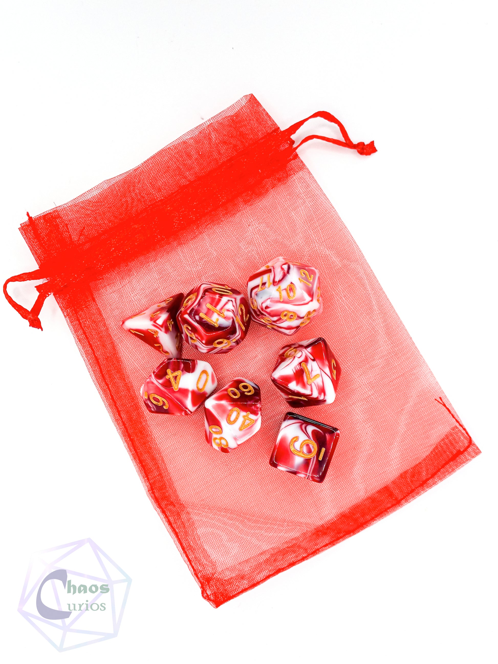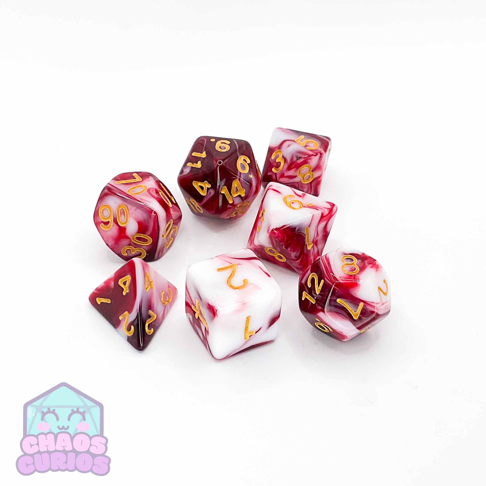 You don't need to be a vampire to appreciate this Bloody Romance 7-piece Dice Set! With its beautiful, blood-red swirl design, this set is perfect for your next dark and mysterious gaming night.