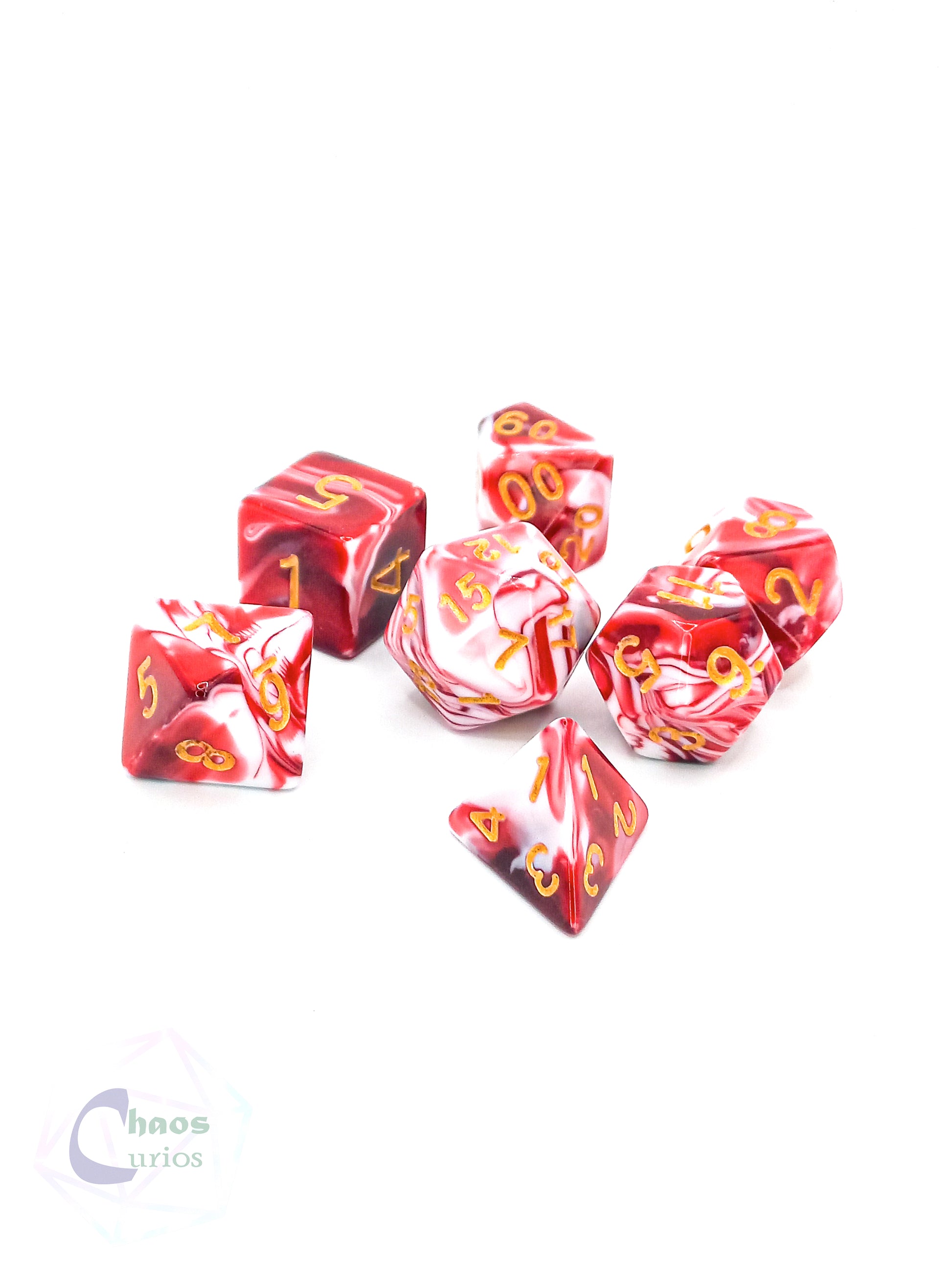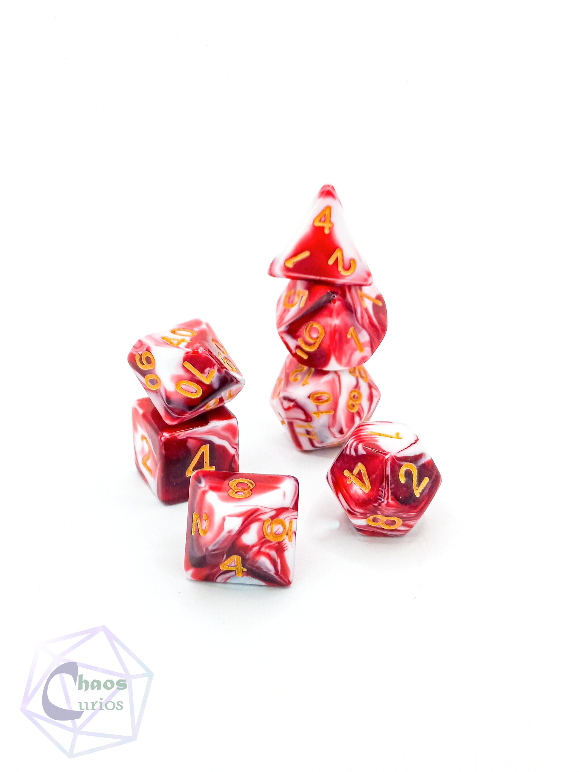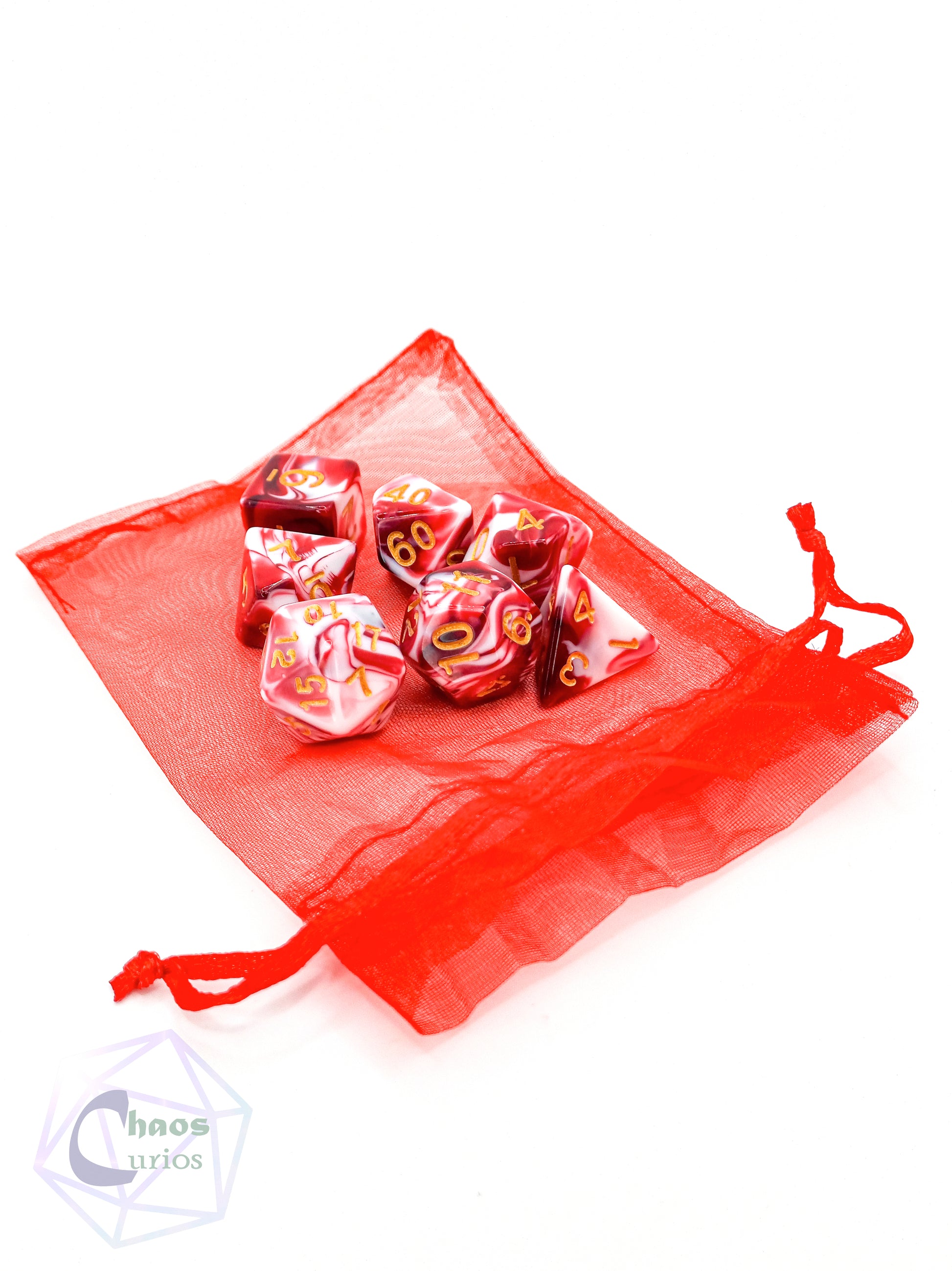 You don't need to be a vampire to appreciate this Bloody Romance 7-piece Dice Set! With its beautiful, blood-red swirl design, this set is perfect for your next dark and mysterious gaming night.