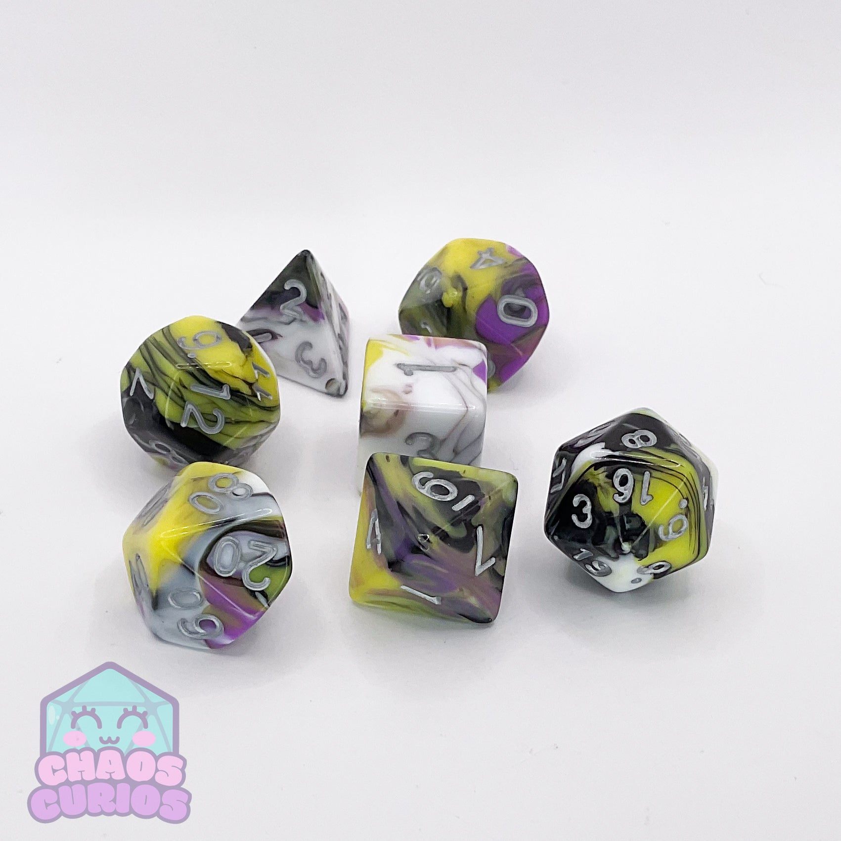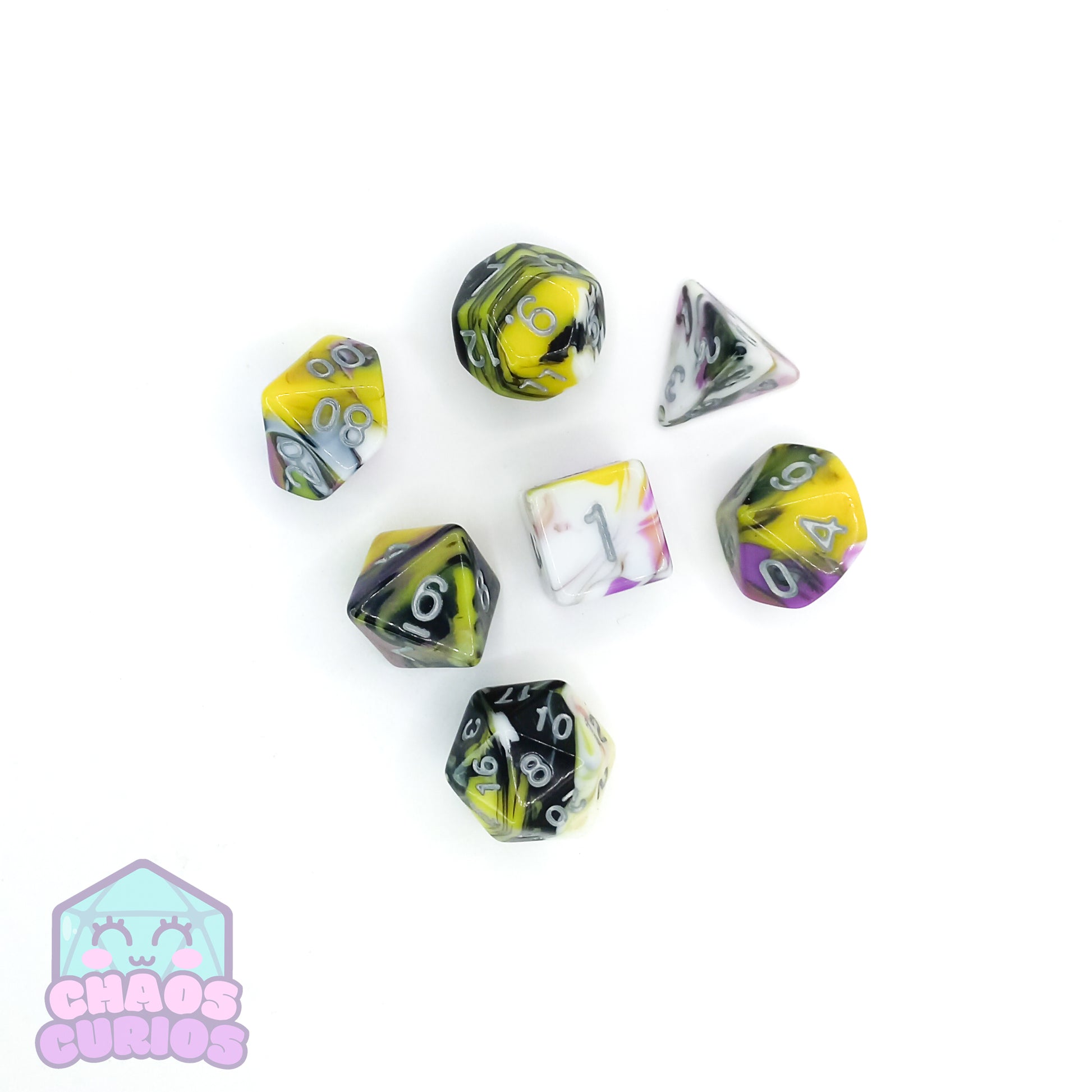 7-piece dice set for use with a variety of role playing games. D20, D12, D10, D100, D8, D6 and D4.