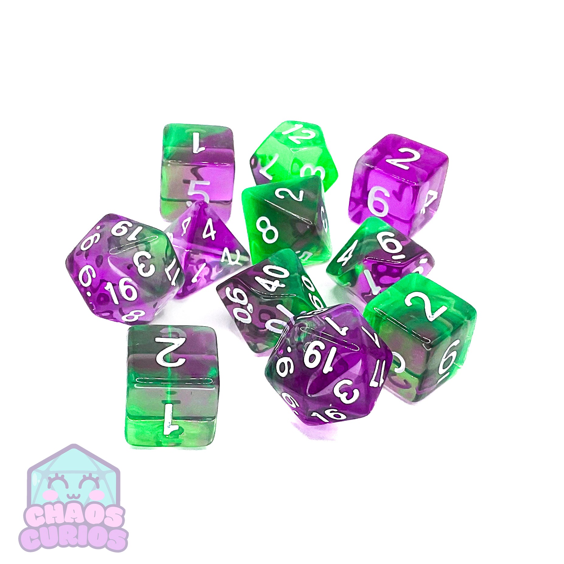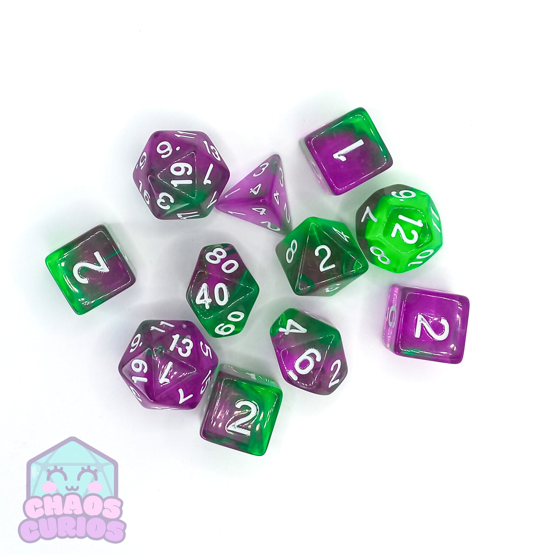 11-piece dice set for use with a variety of role playing games. 2 x D20, D12, D10, D100, D8, 4 x D6 and D4.