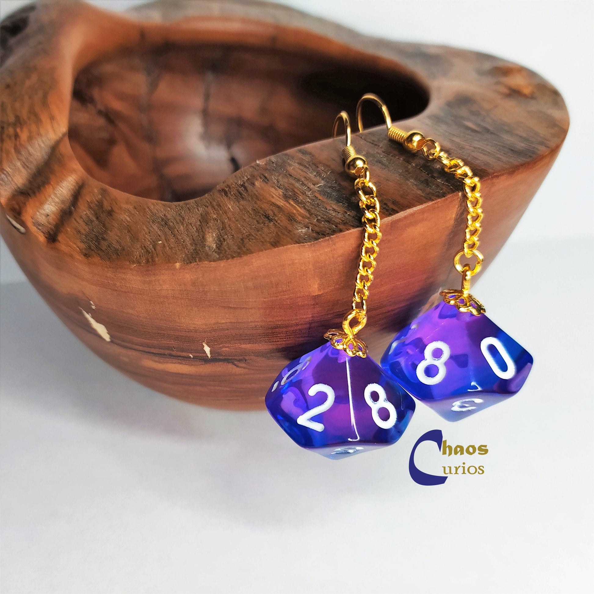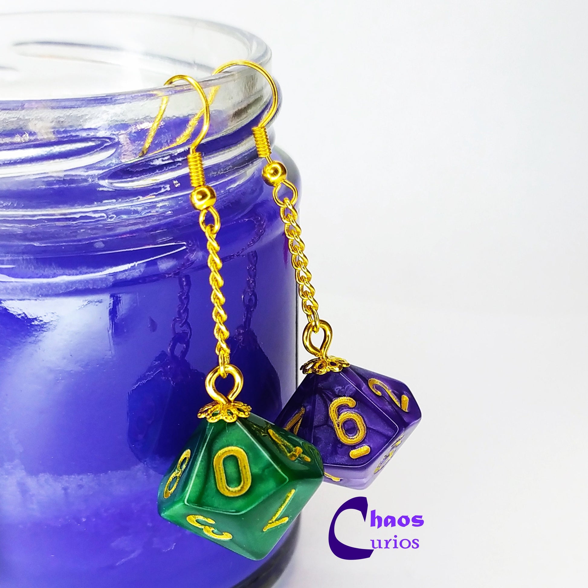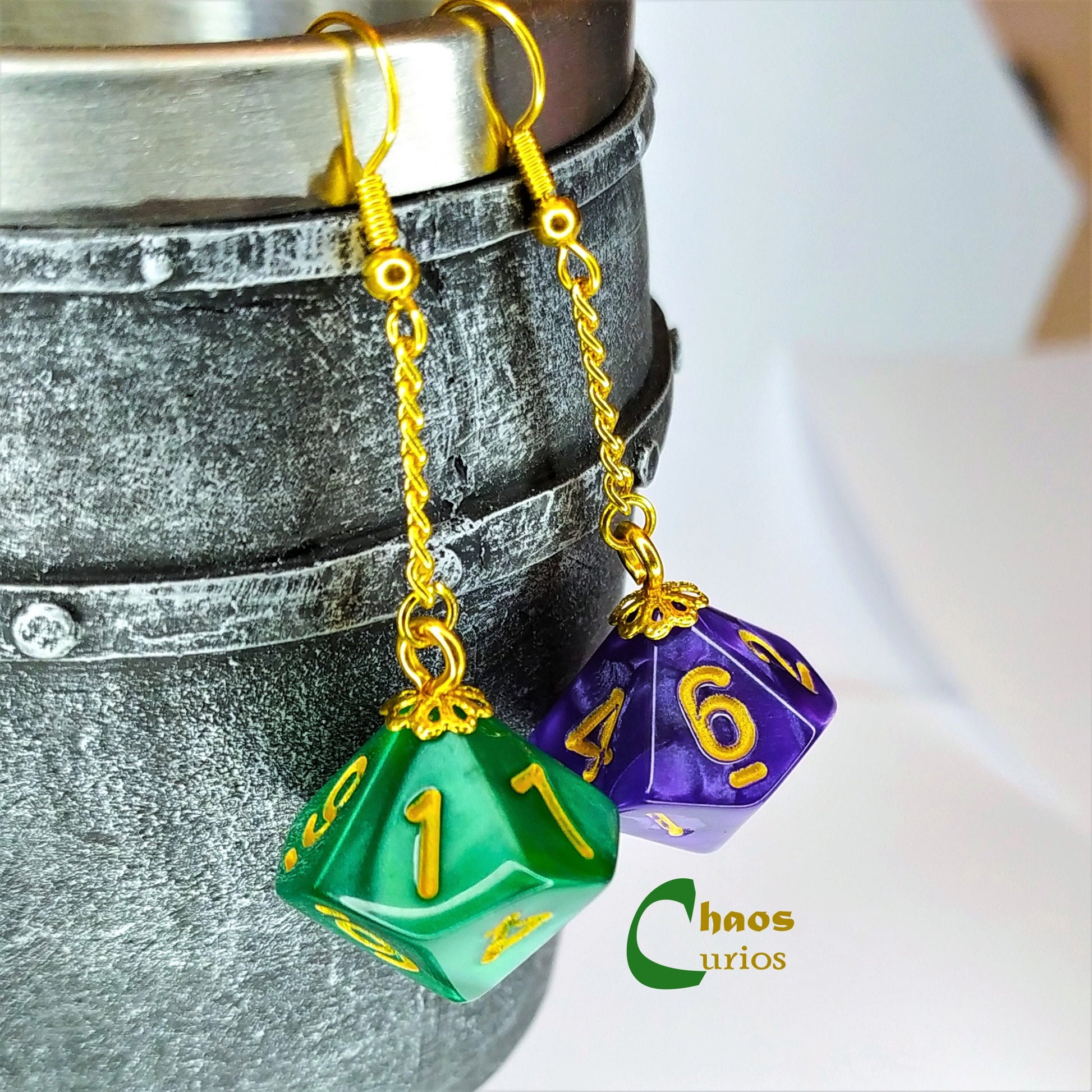 These earrings feature 2 D10/% dice from an array of colours finished with gold hypoallergenic hooks. This is a handmade item and I make these to order.