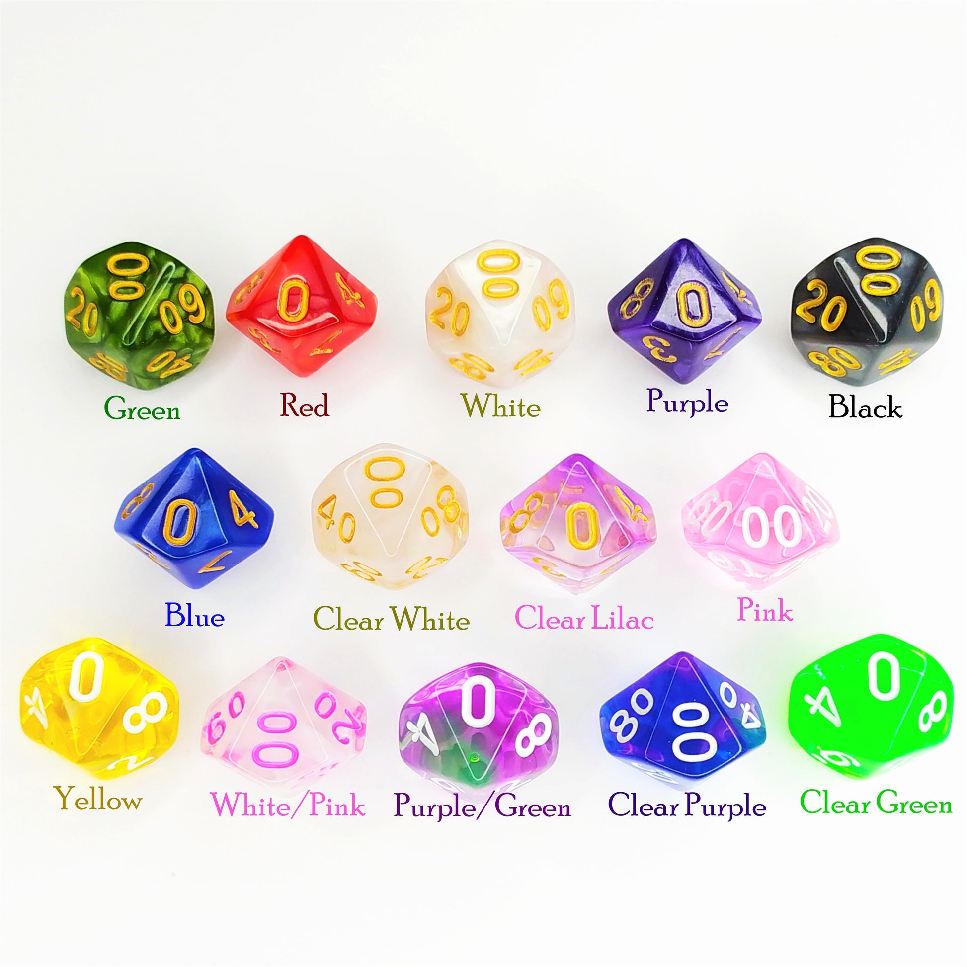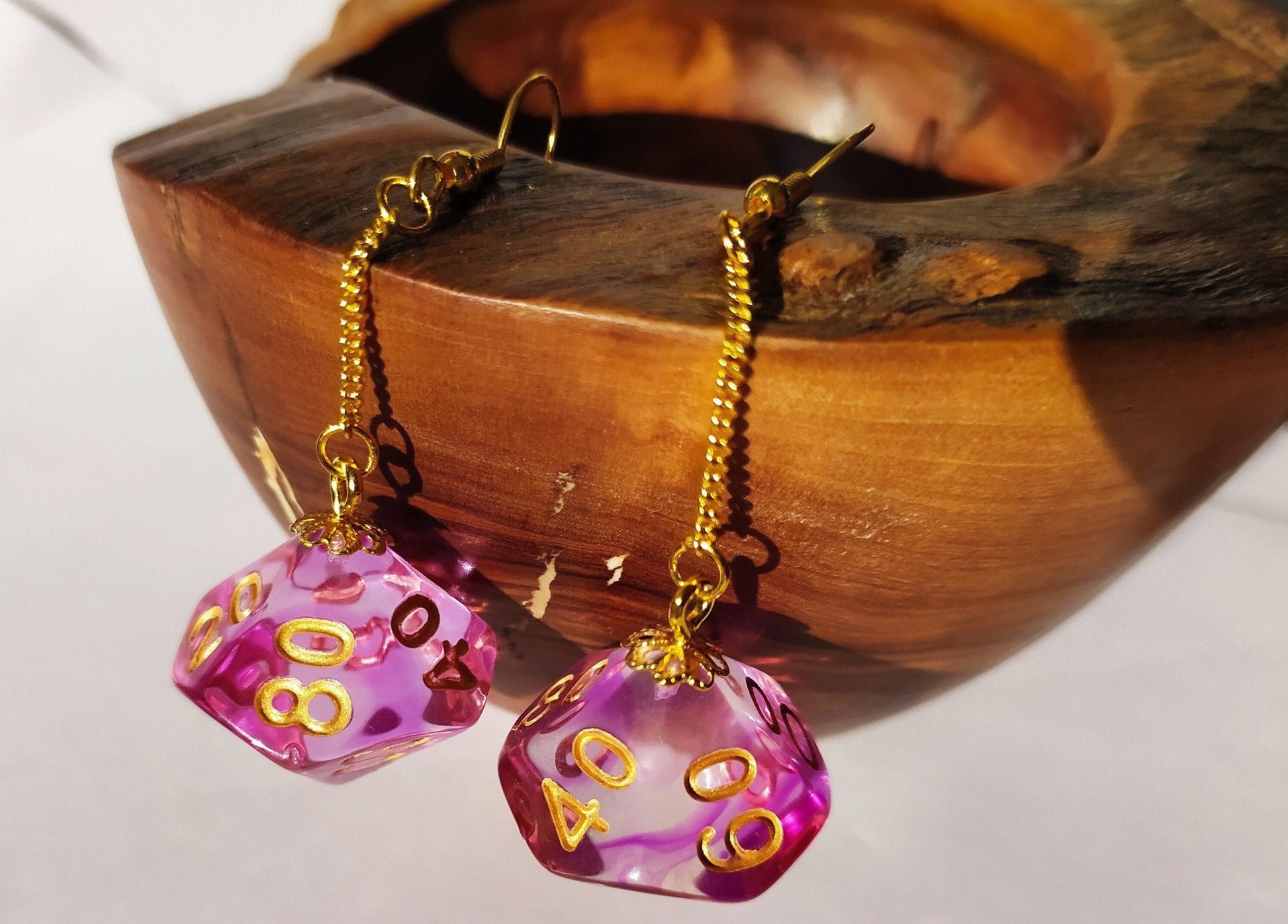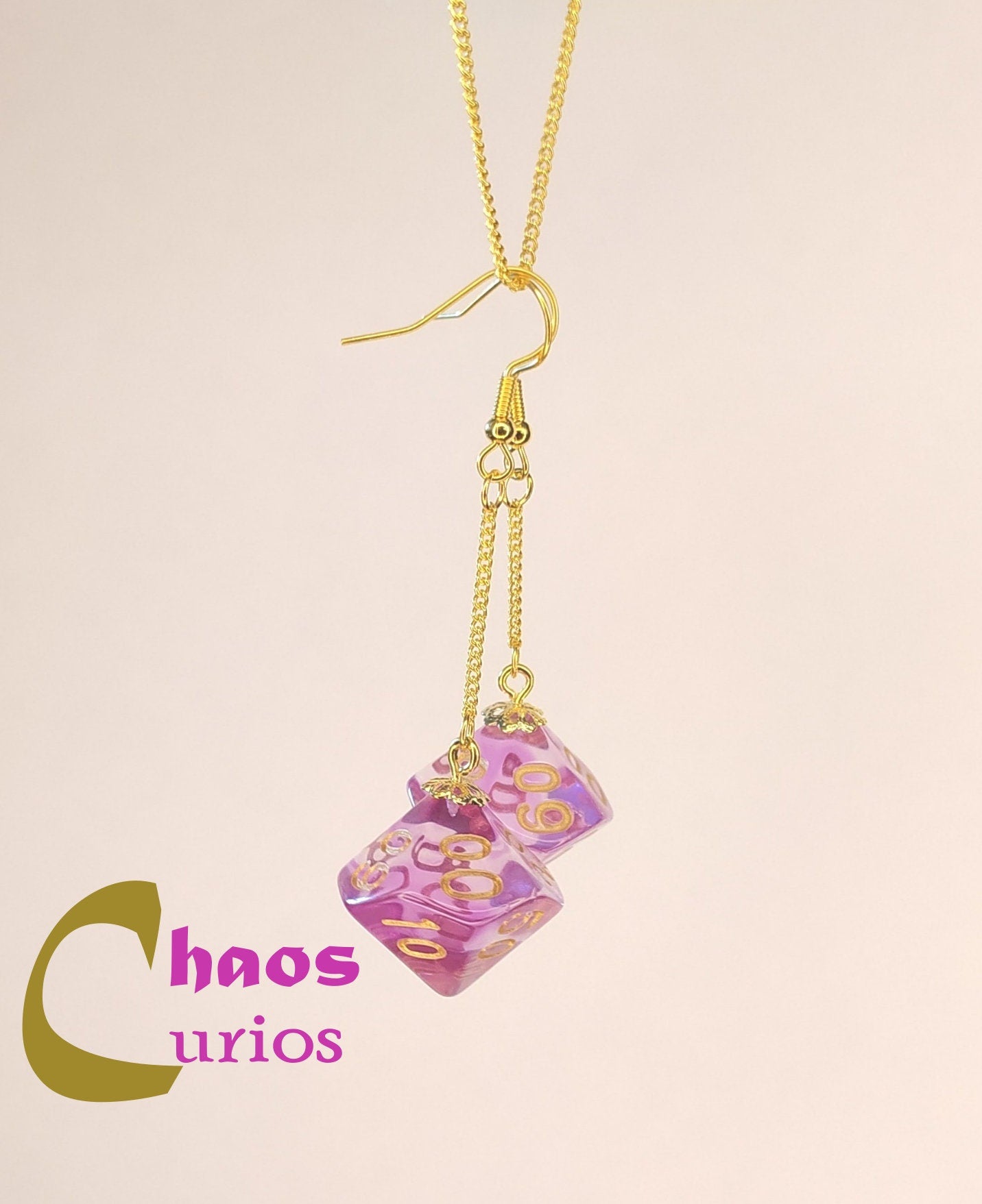 These earrings feature 2 D10/% dice from an array of colours finished with gold hypoallergenic hooks. This is a handmade item and I make these to order.