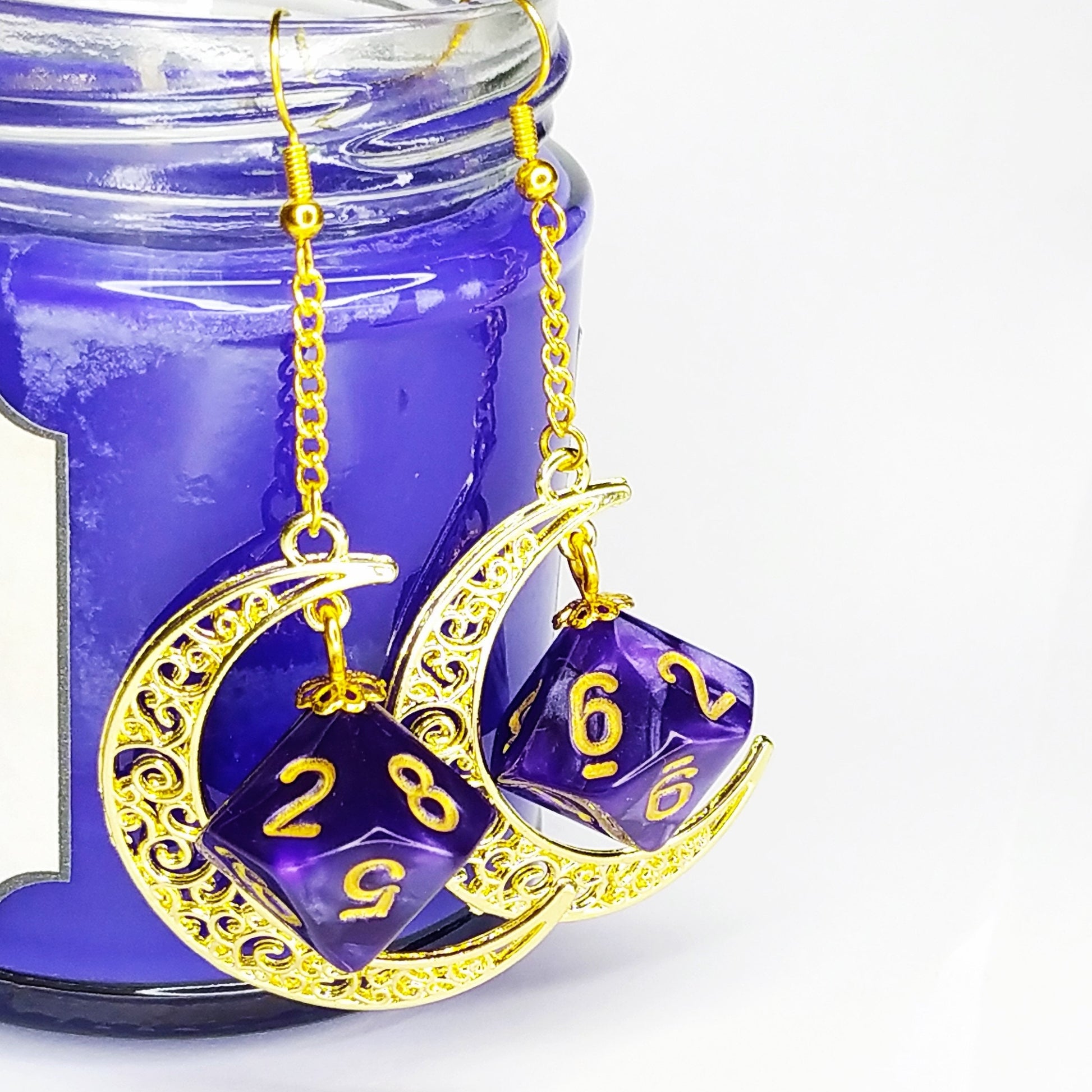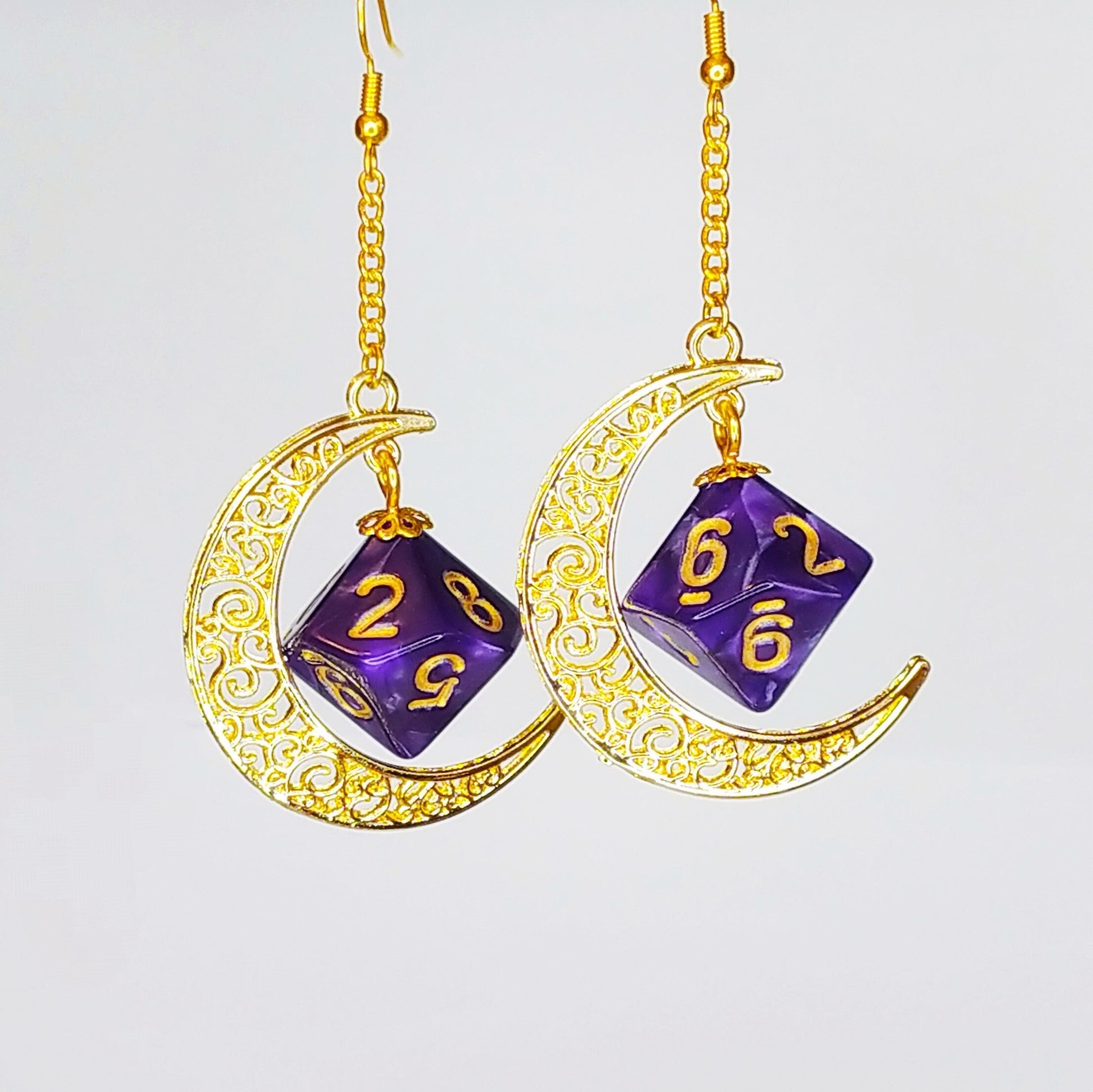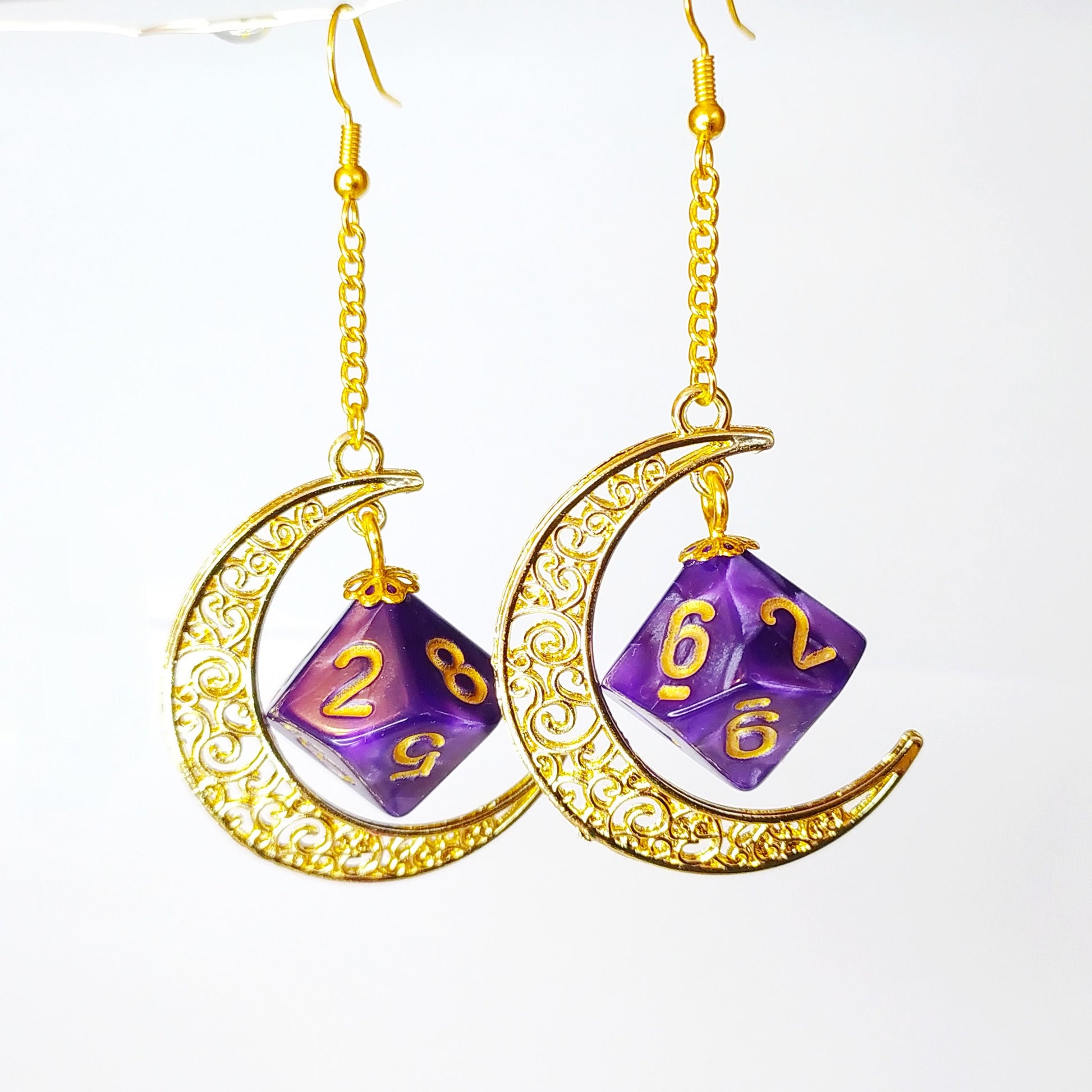 Product Information: These babies are big, featuring 2 D10/% dice from an array of colours hung inside a crescent moon finished with gold hypoallergenic hooks. This is a handmade item and I make these to order. I also accept custom orders, please contact me.