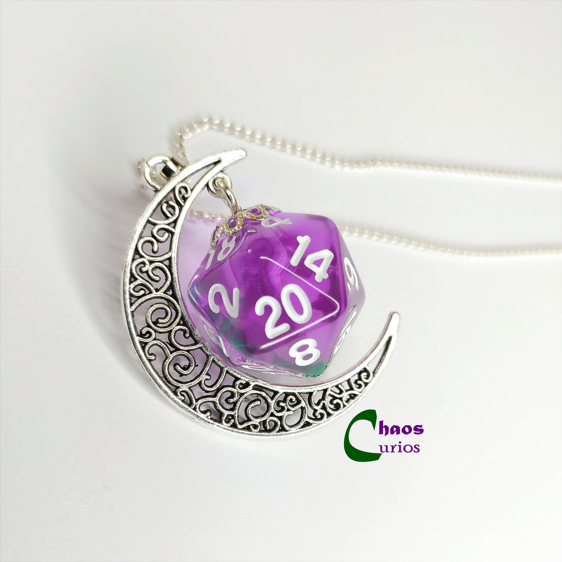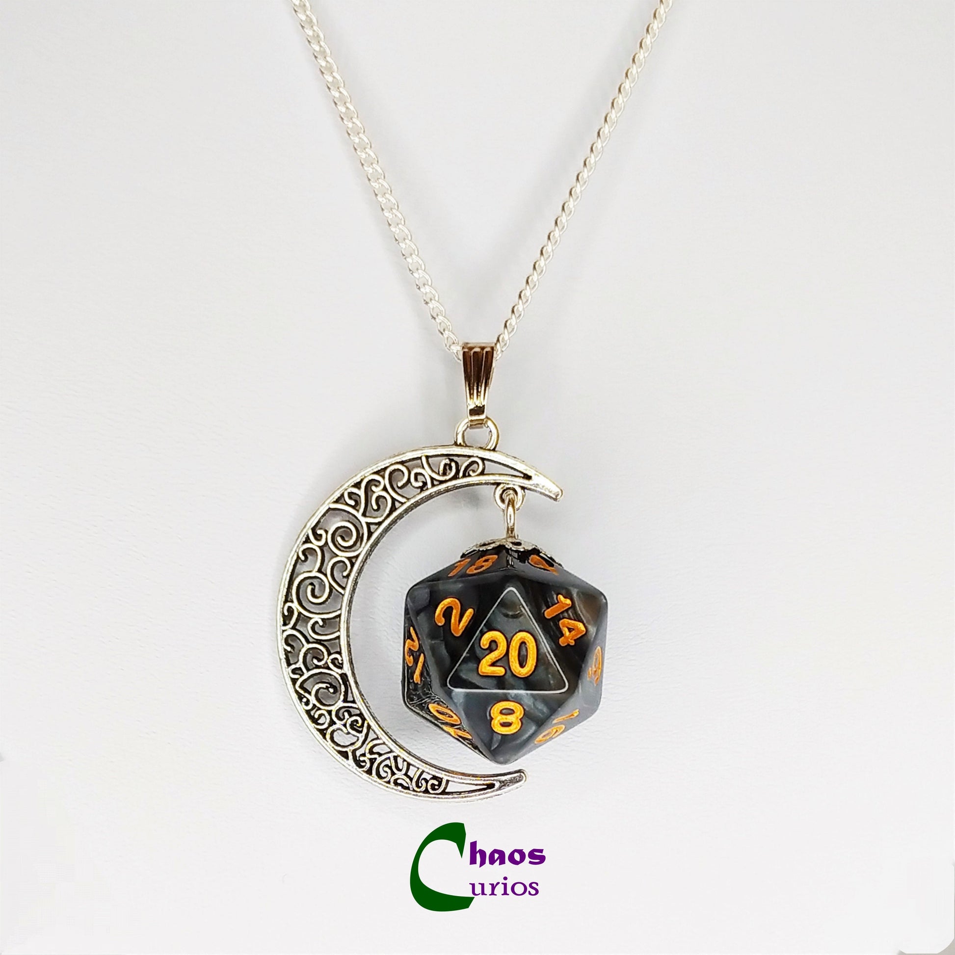 D20 Crescent Moon Necklace, Silver Finishing