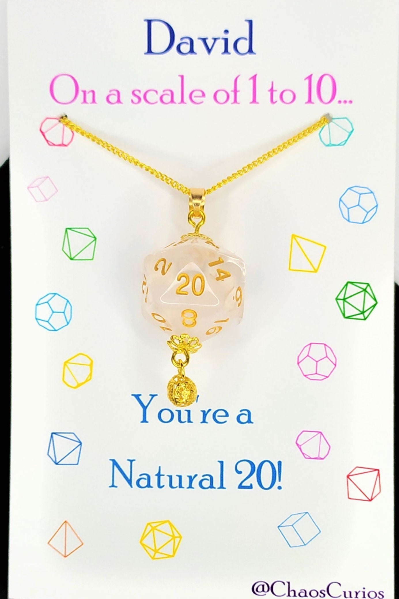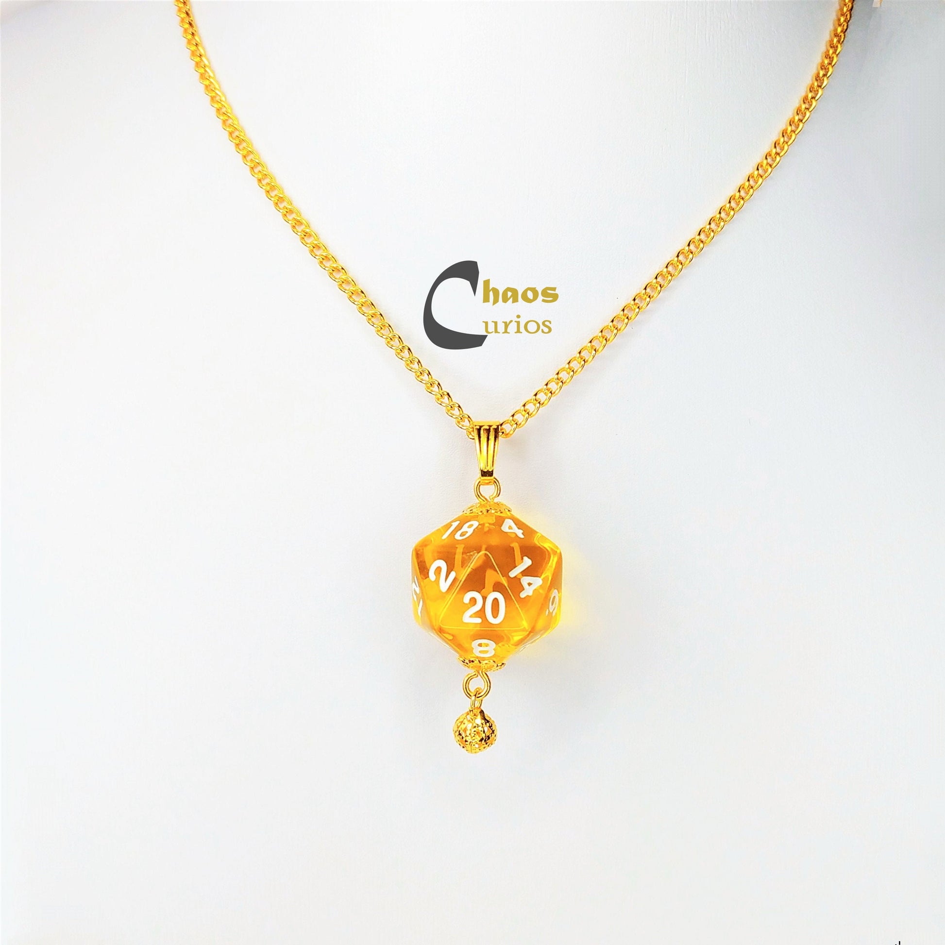 Product Information: This necklace features a D20 die from an array of colours hung on a 20 inch chain. This is a handmade item and I make these up to order. I also accept custom orders, please contact me.