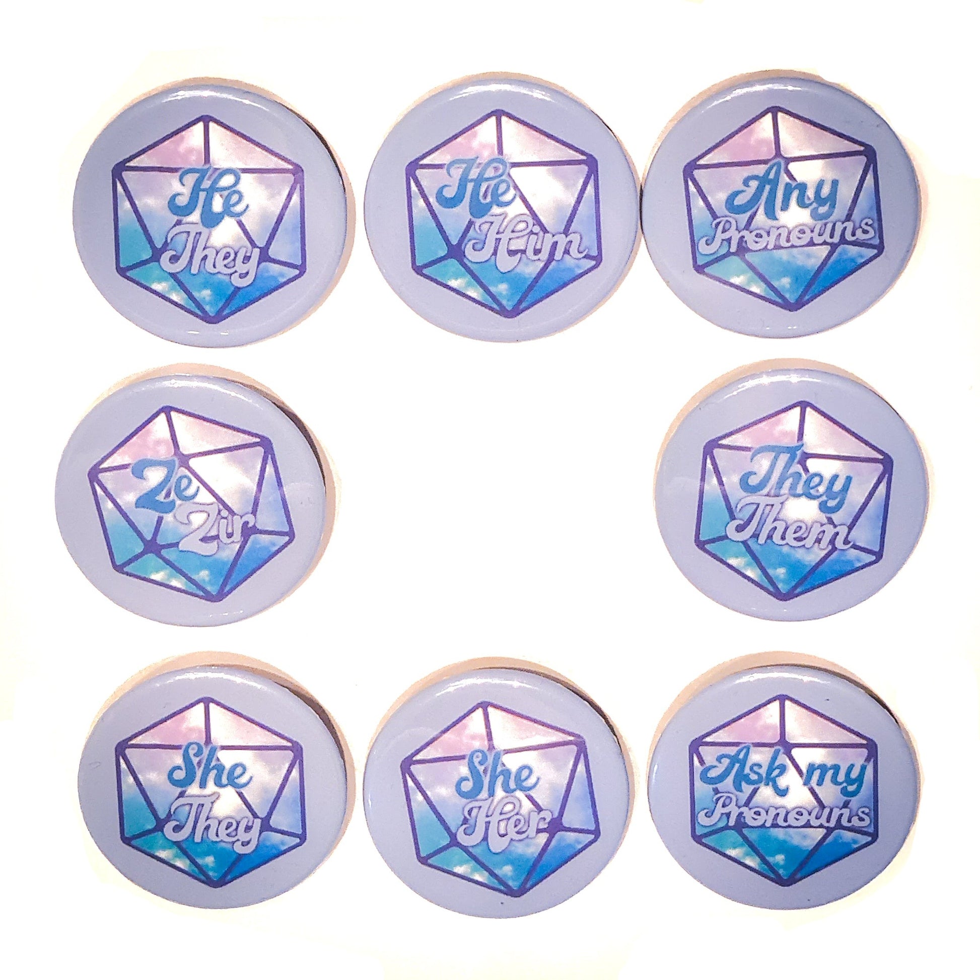 Celebrate your Pride and Identity in style with this D20 Badge! It comes in 8 different pronoun designs. Perfect for any Roleplayer!