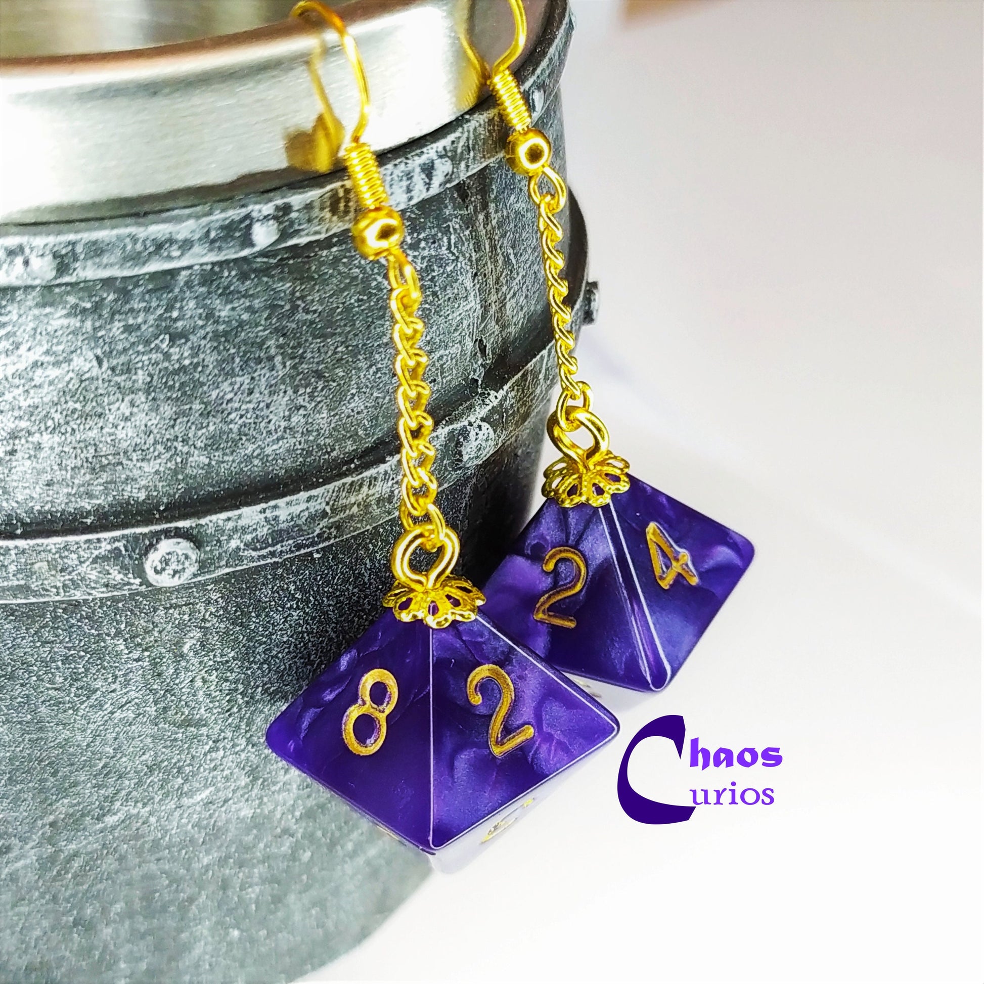 Product Information: These earrings feature 2 D8 dice from an array of colours finished with gold hypoallergenic hooks. This is a handmade item and I make these to order. I also accept custom orders, please contact me.