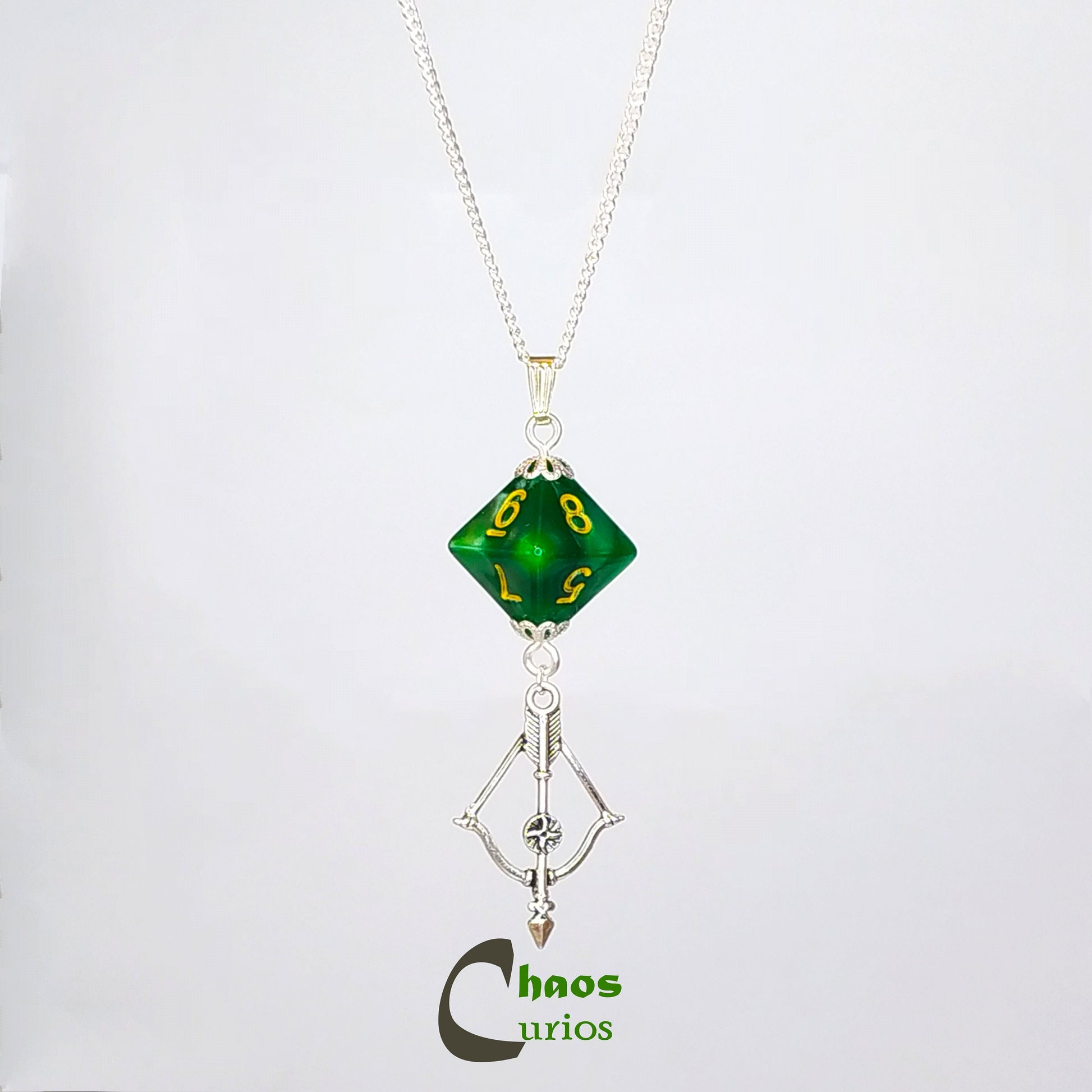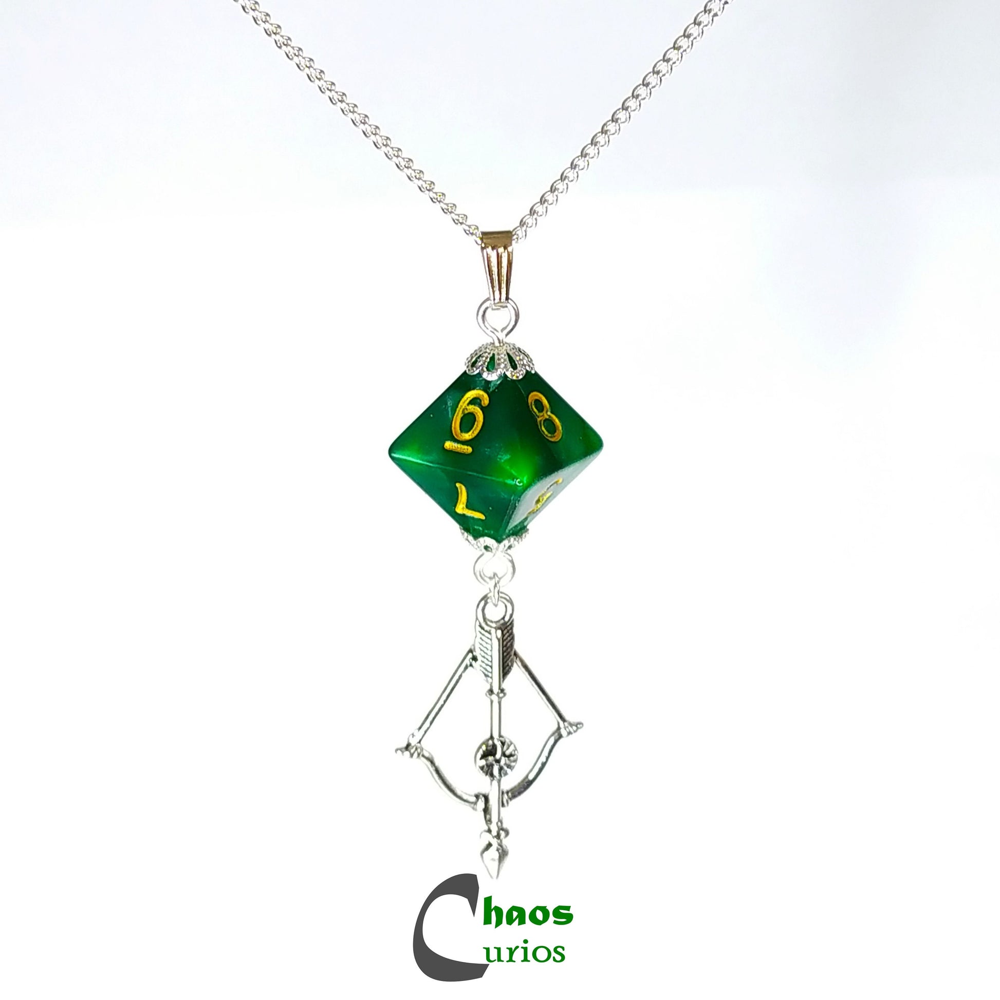 Product Information: This necklace feature a D8 chosen from an array of colours with a dangling crossbow charm and is hung on a 20 inch adjustable chain (19-21 inches). This is a handmade item and I make these to order. I also accept custom orders, please contact me.