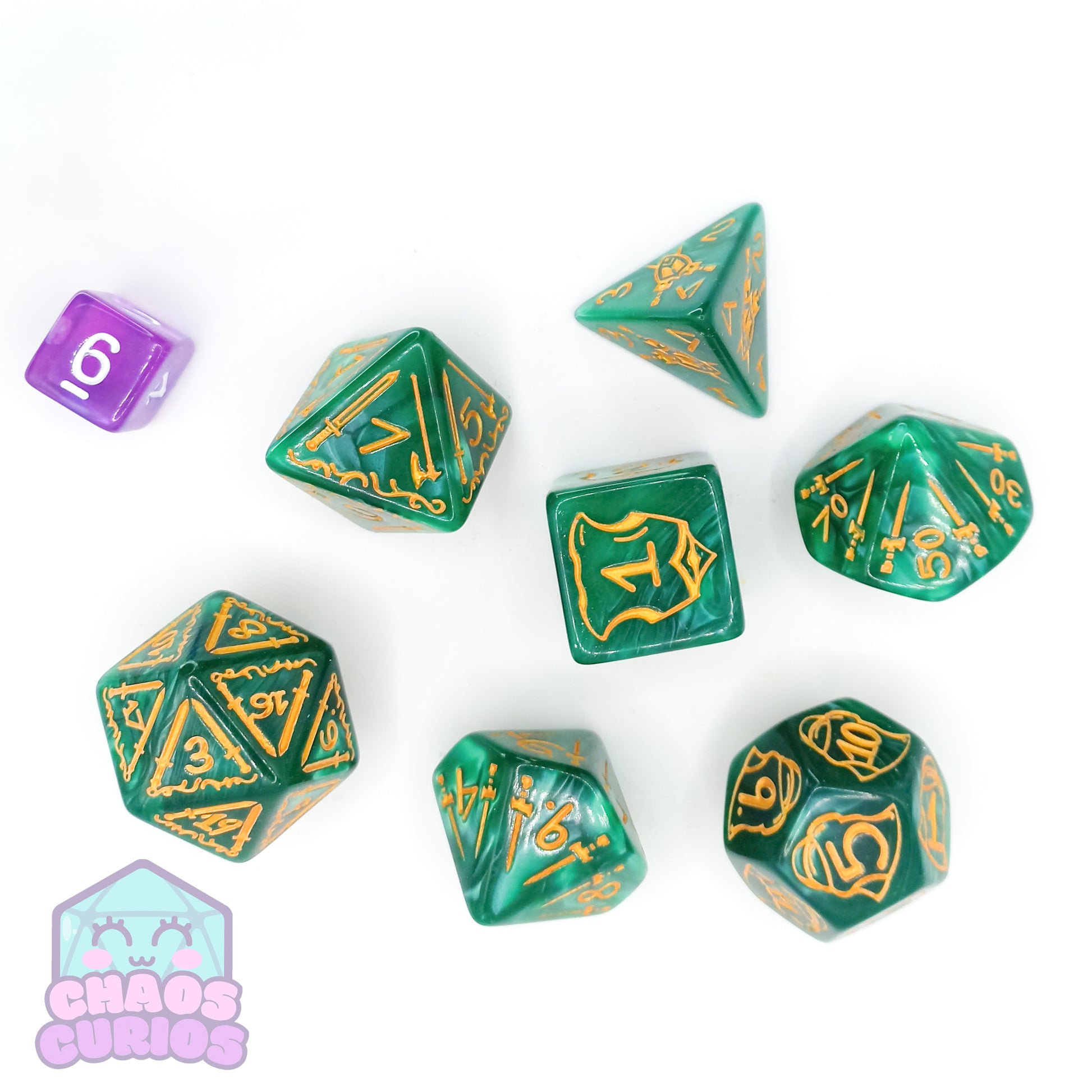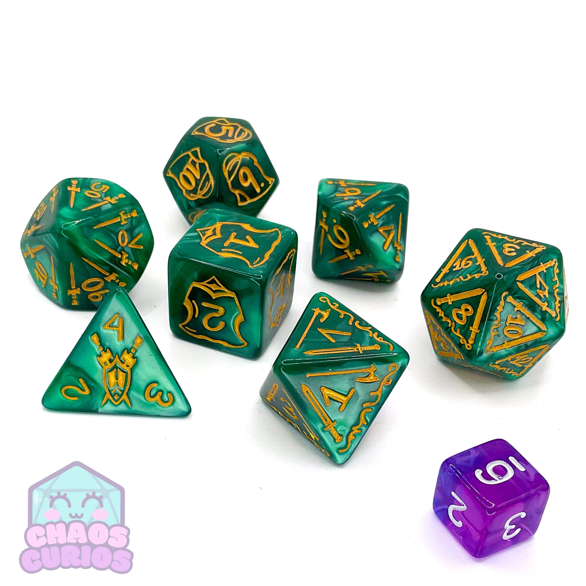 7-piece dice set for use with a variety of role playing games. D20, D12, D10, D100, D8, D6 and D4.