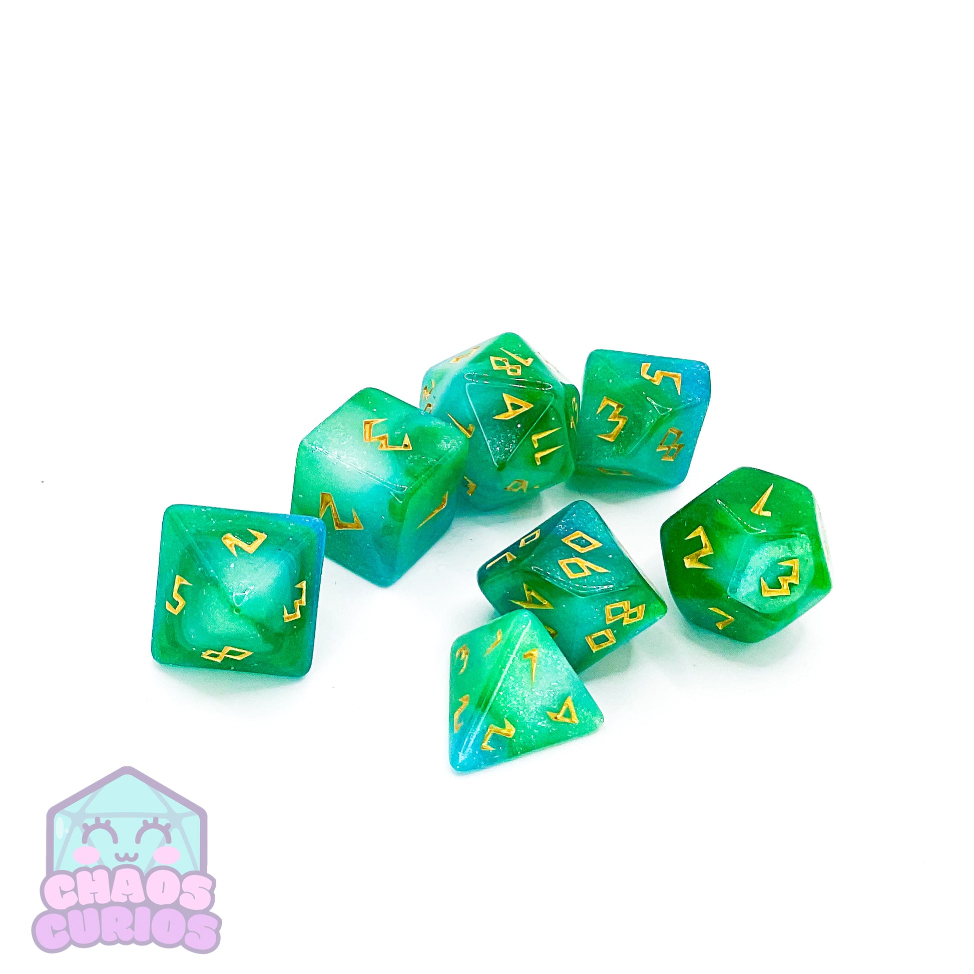 7-piece dice set for use with a variety of role playing games. D20, D12, D10, D100, D8, D6 and D4.