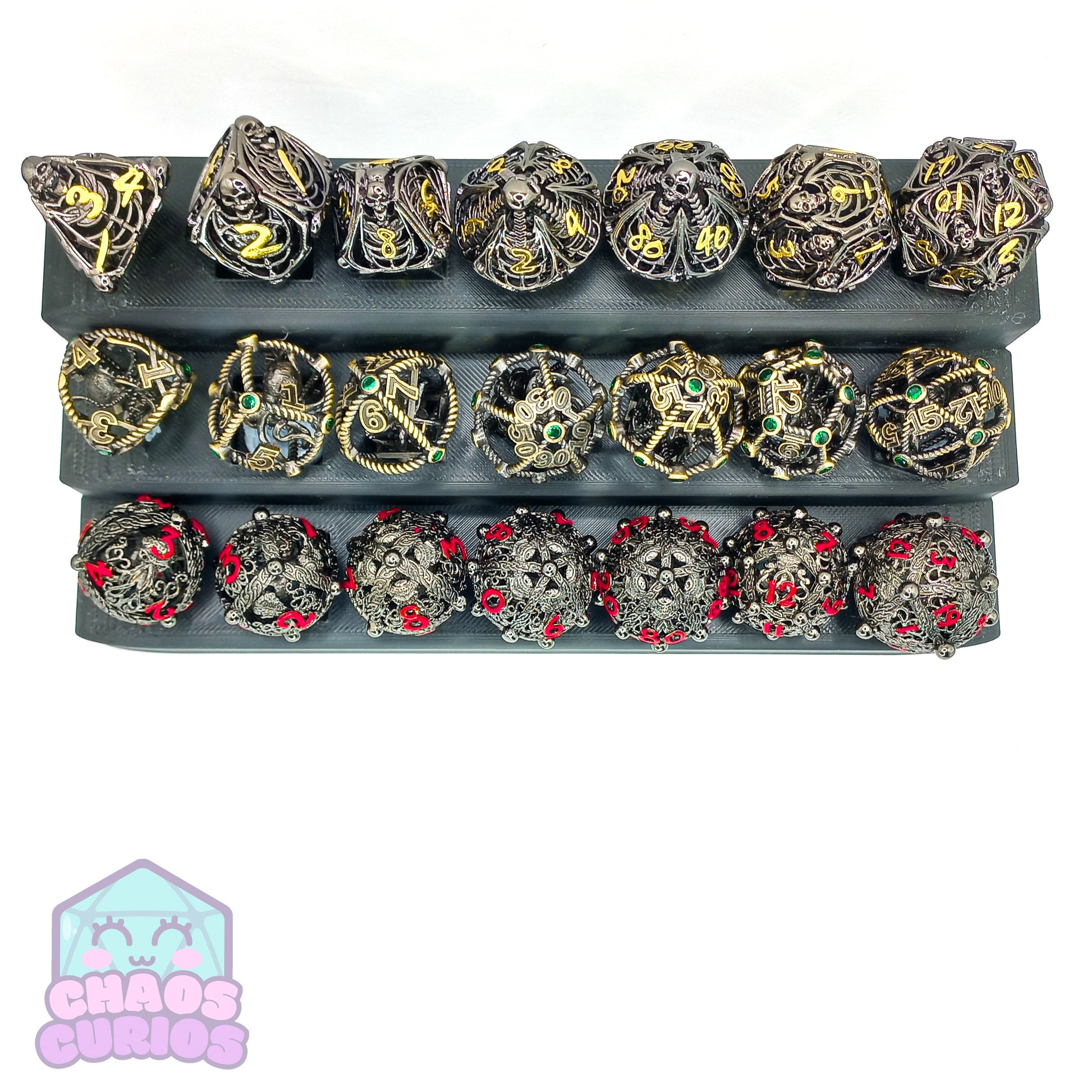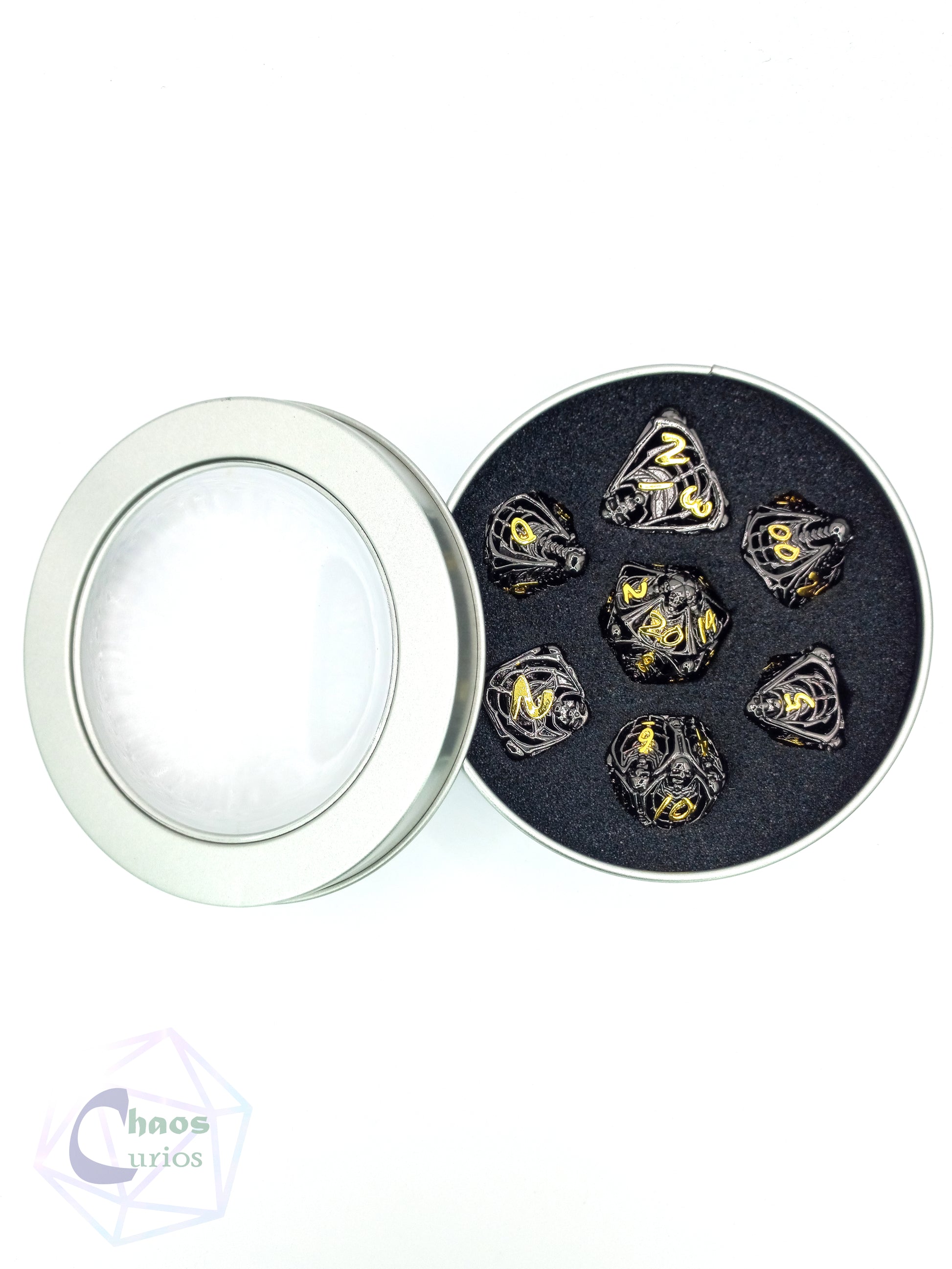 Make sure your gaming sessions are dead serious with this Hollow Skull 7-piece Metal Dice Set! Roll the bones and strike fear into your opponents with this morbidly chic die-cast set. Adding a little extra drama to your gaming table!
