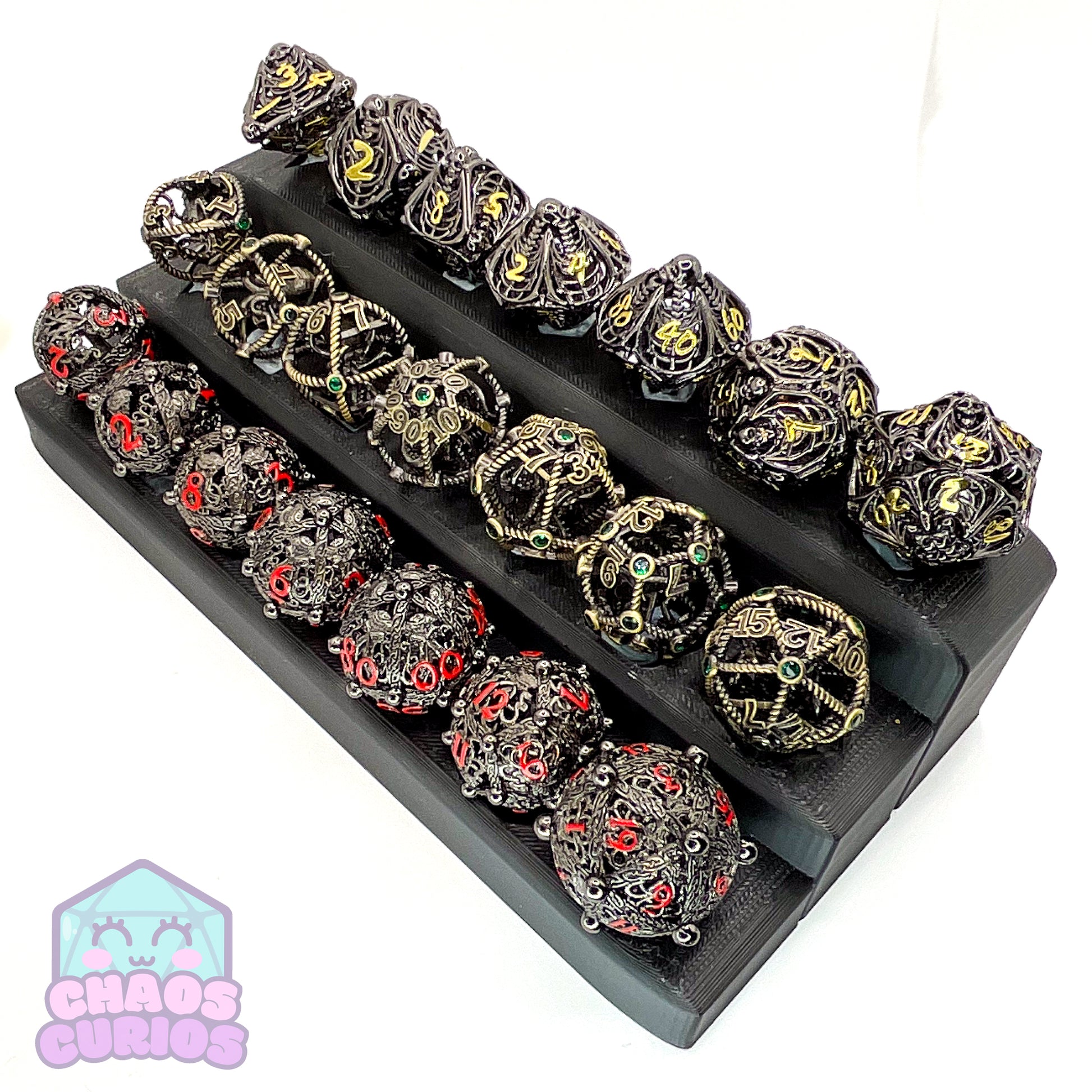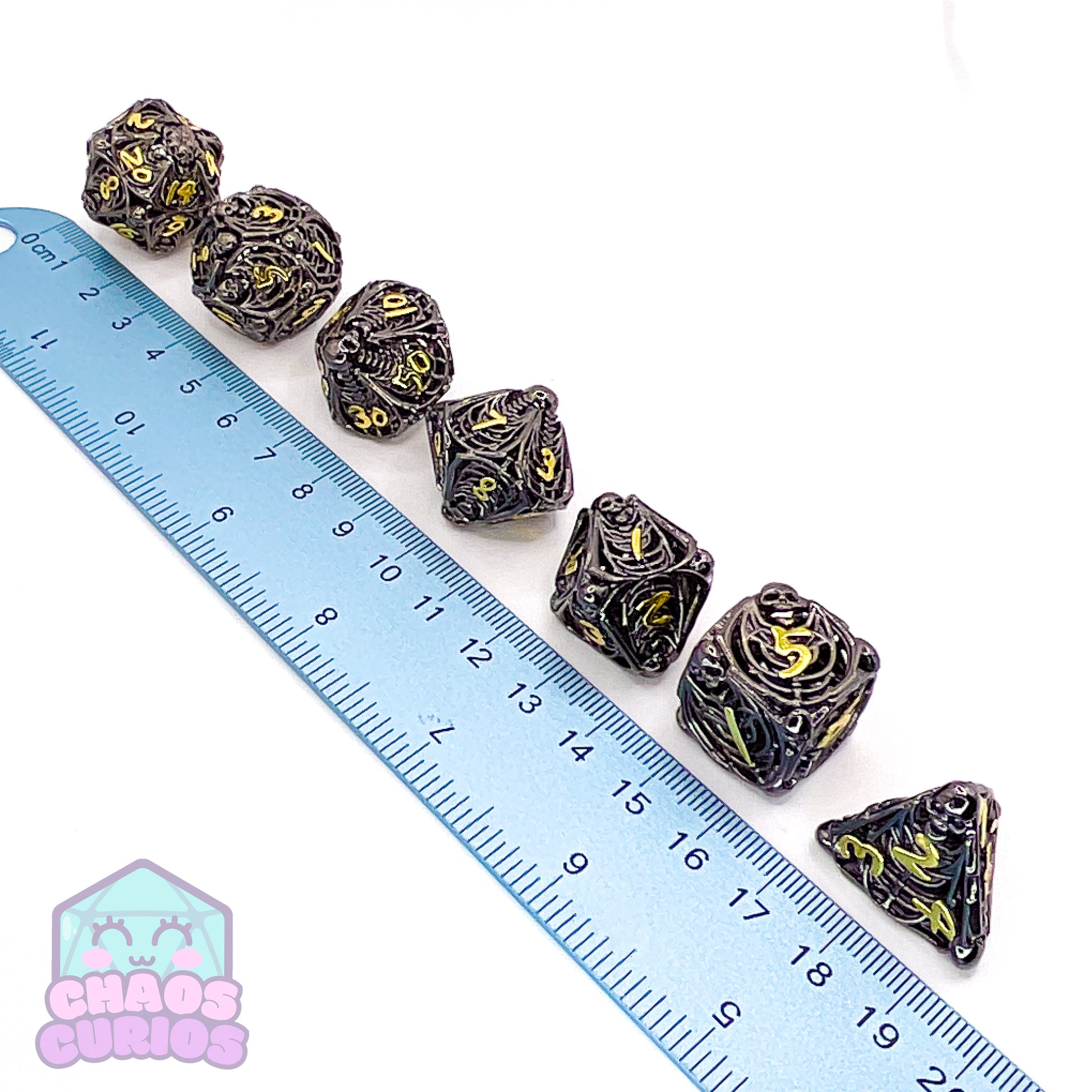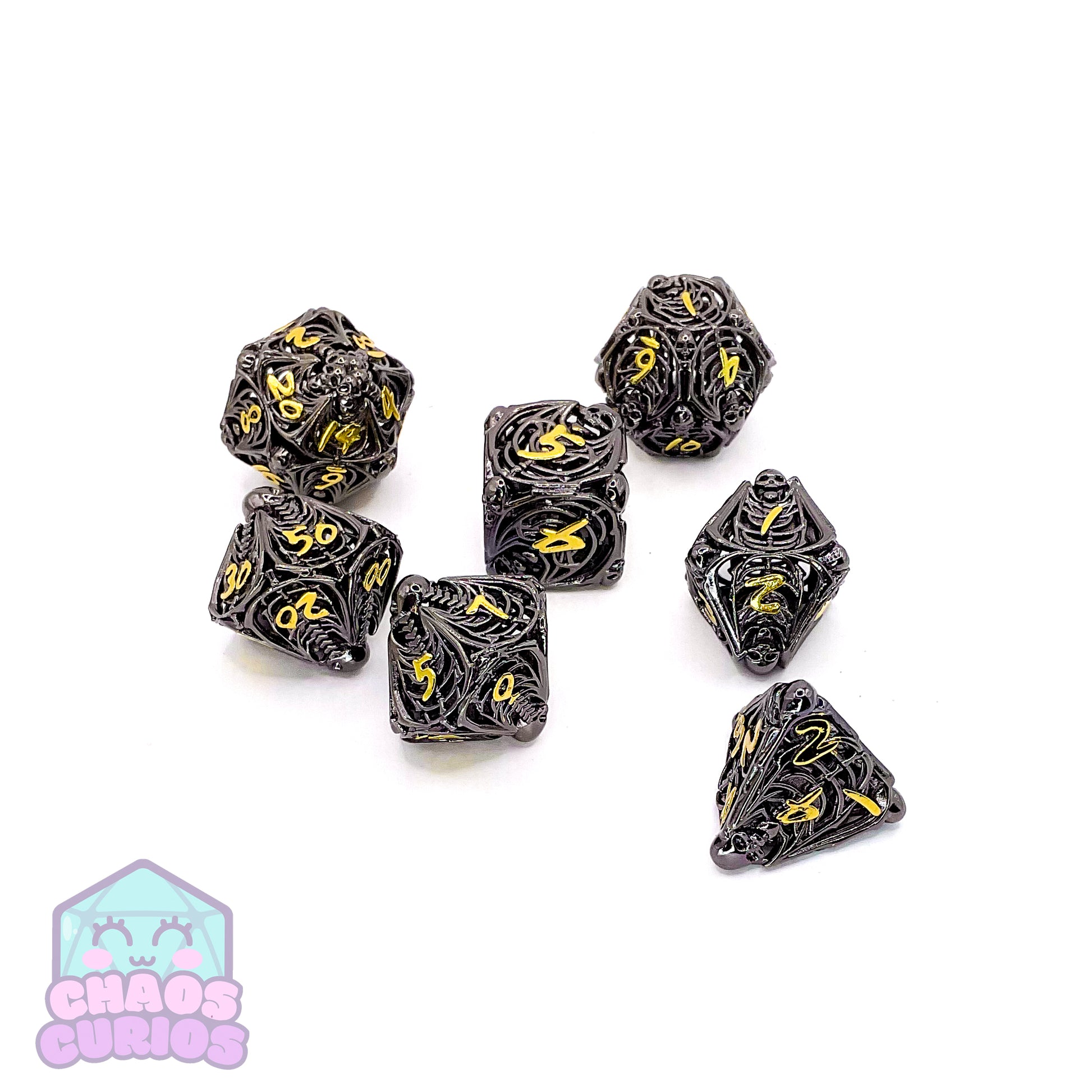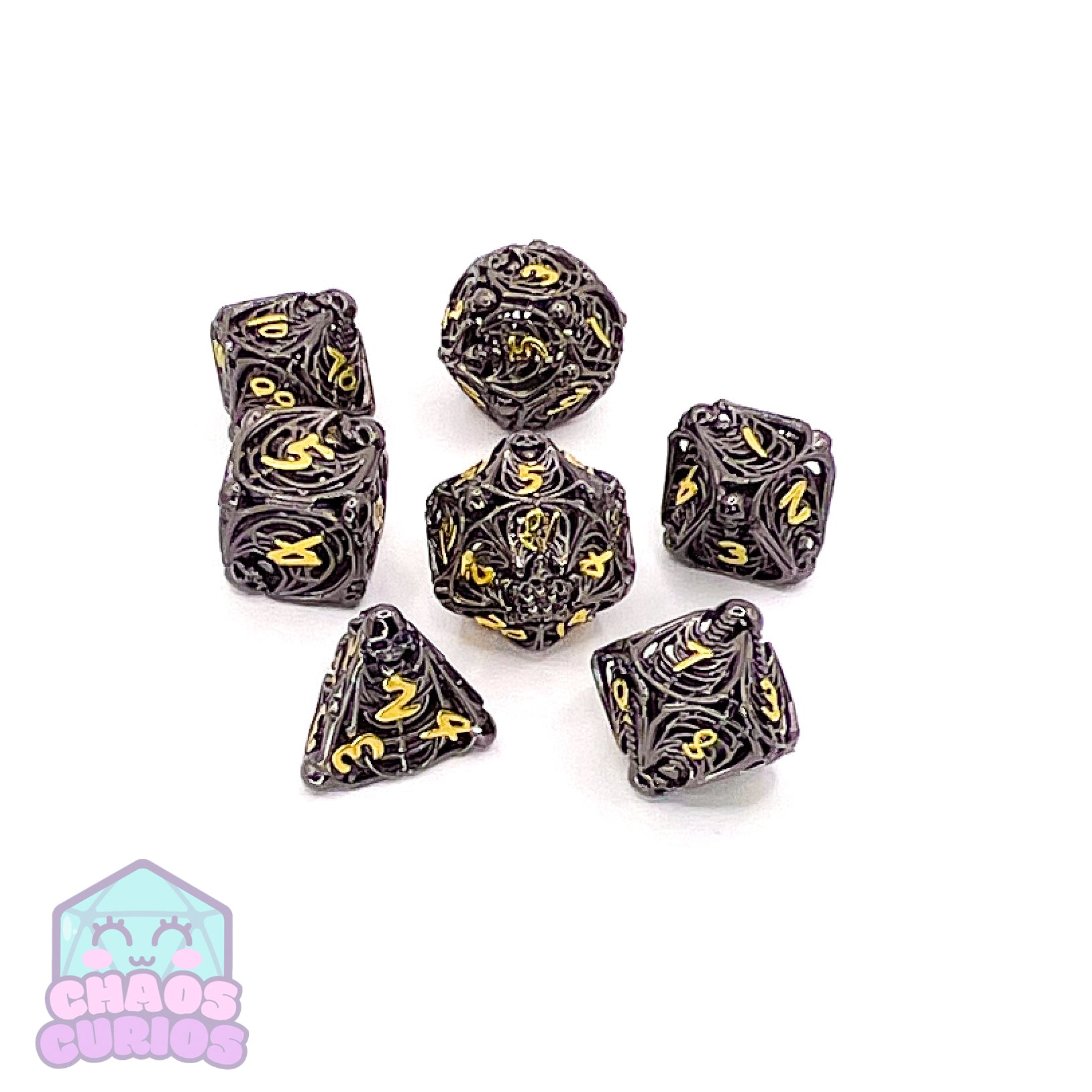 7-piece Metal dice set for use with a variety of role playing games. D20, D12, D10, D100, D8, D6 and D4.