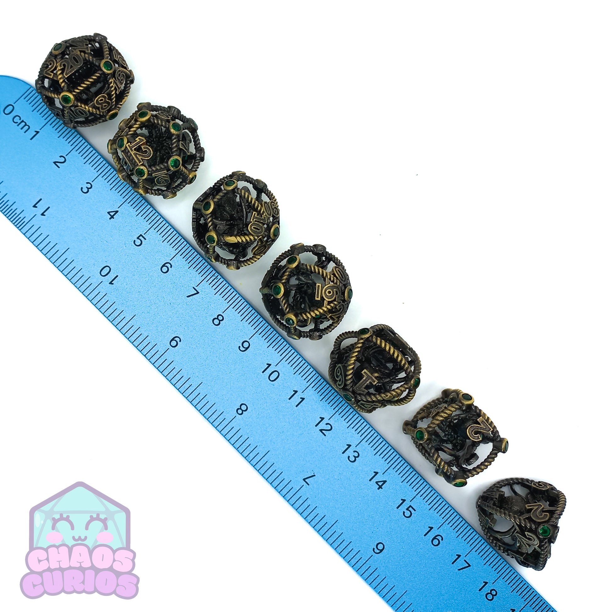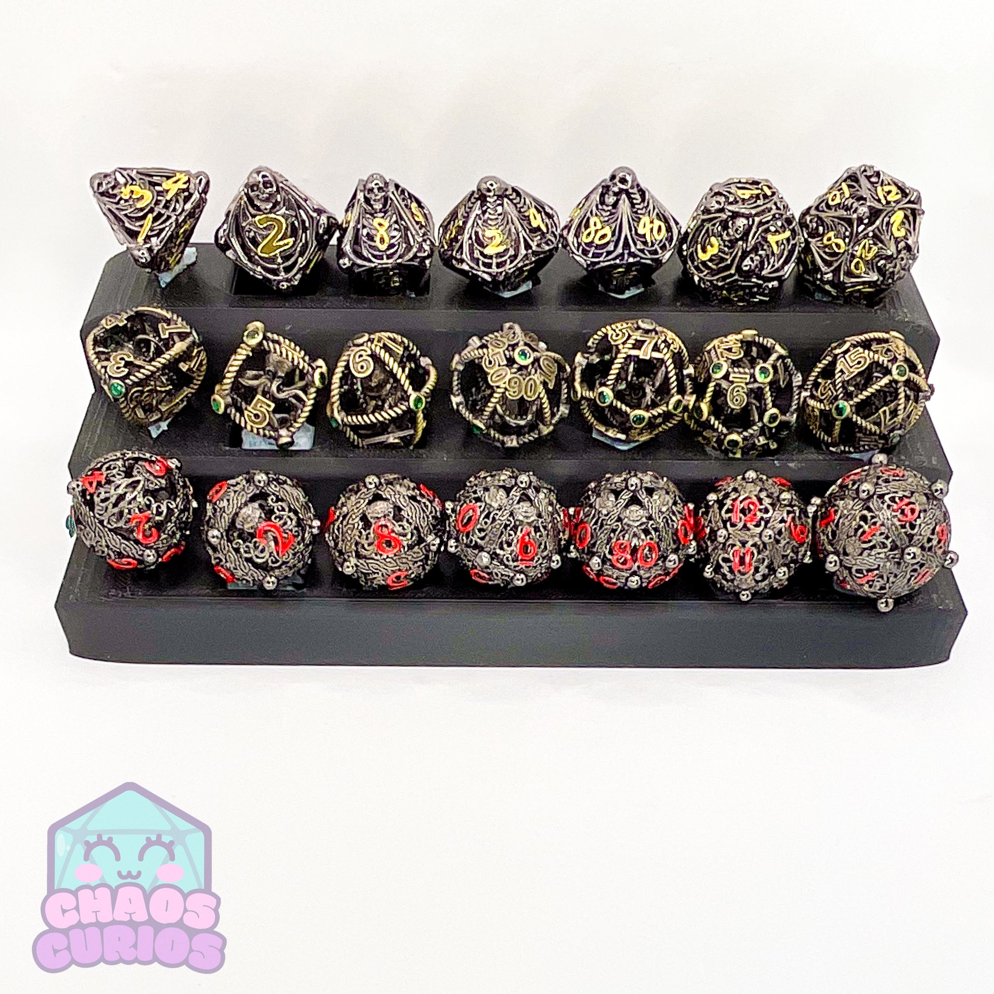 7-piece Metal dice set for use with a variety of role playing games. D20, D12, D10, D100, D8, D6 and D4.