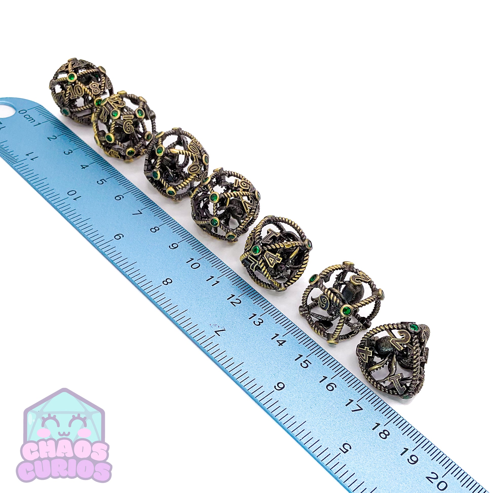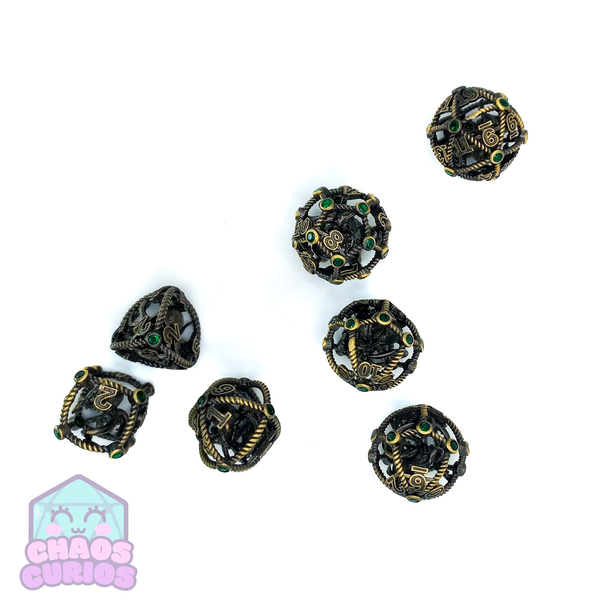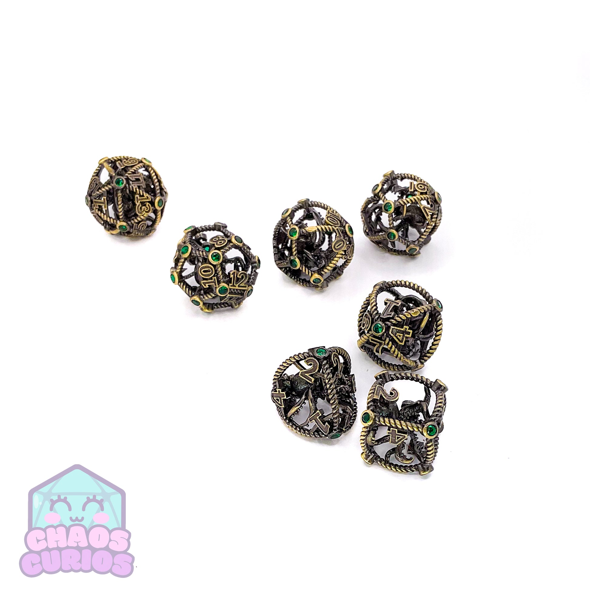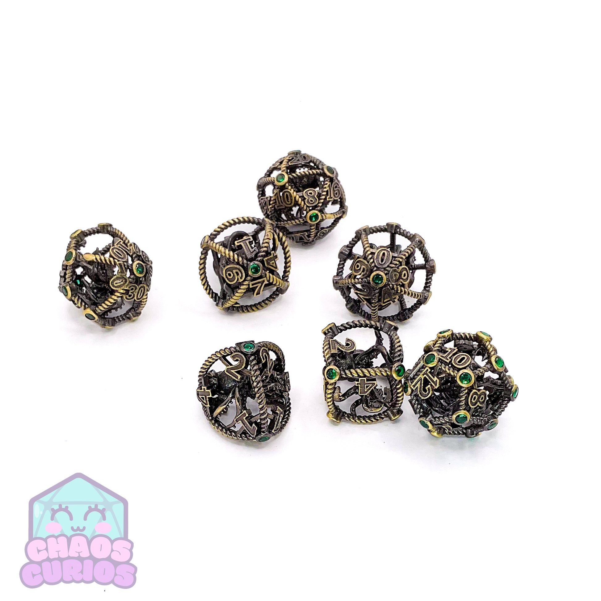 Hollow Caged Octopus Green Gem 7-piece Metal Dice Set