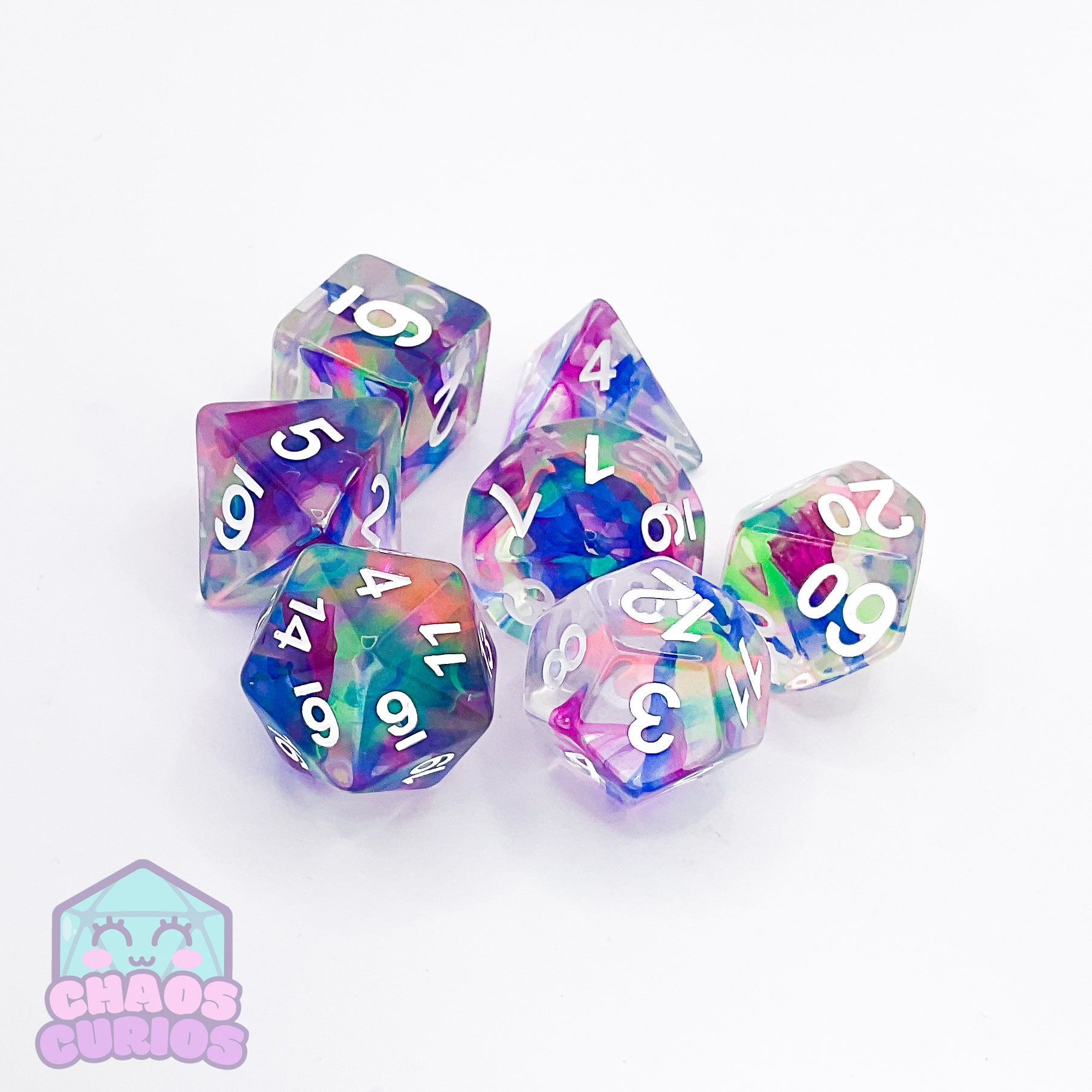 7-piece Resin dice set for use with a variety of role playing games. D20, D12, D10, D100, D8, D6 and D4.