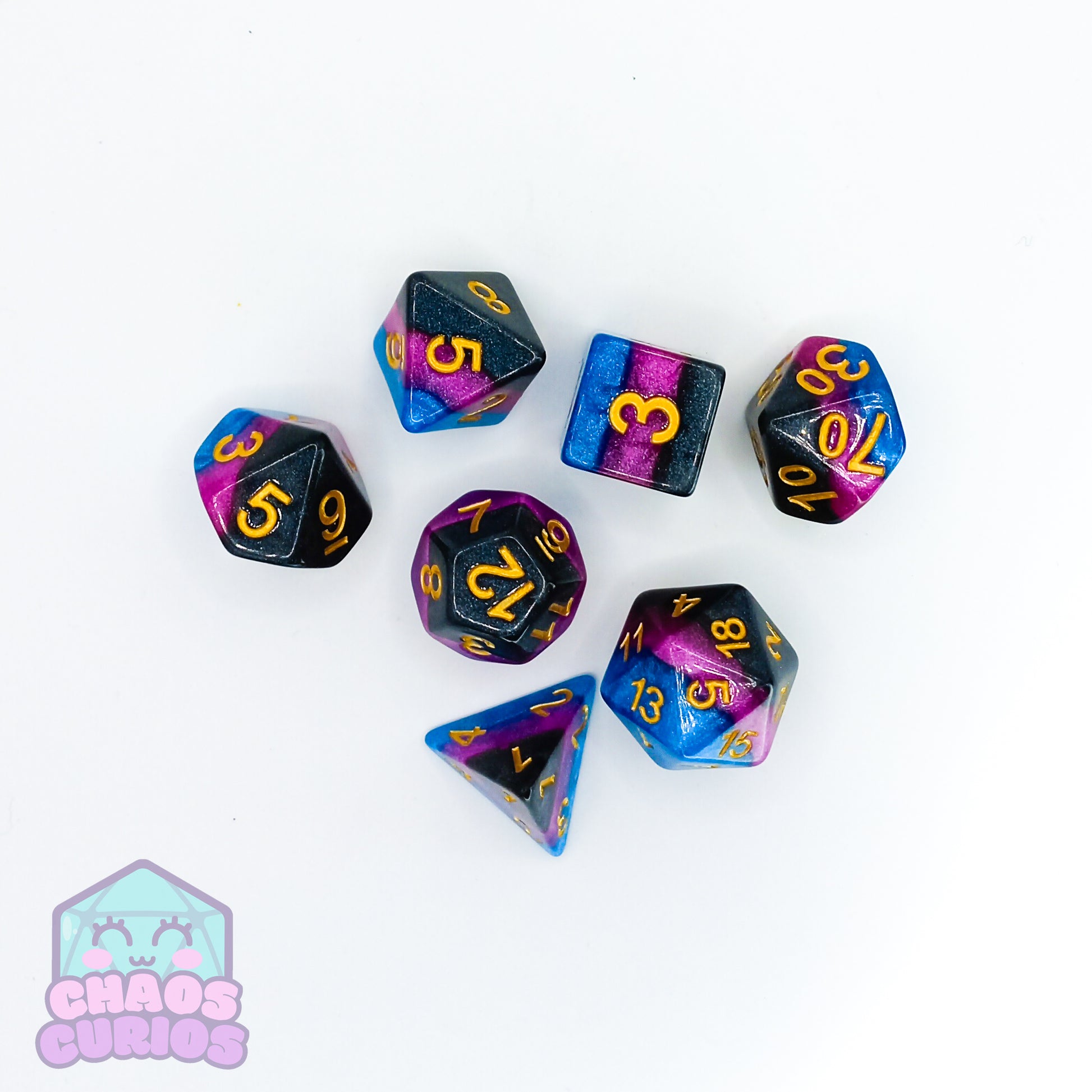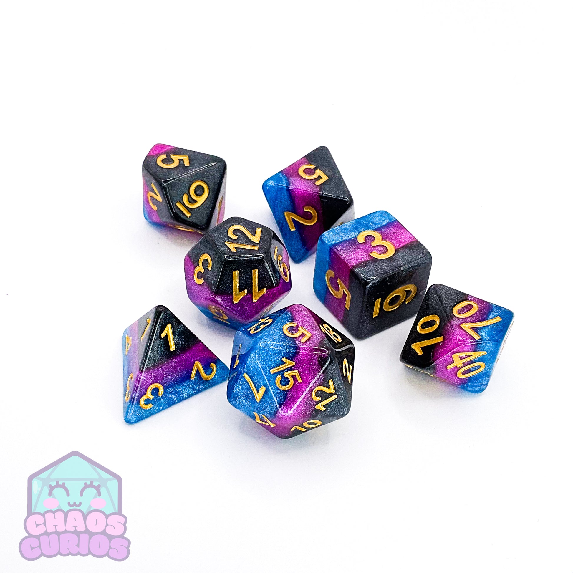 7-piece dice set for use with a variety of role playing games. D20, D12, D10, D100, D8, D6 and D4.