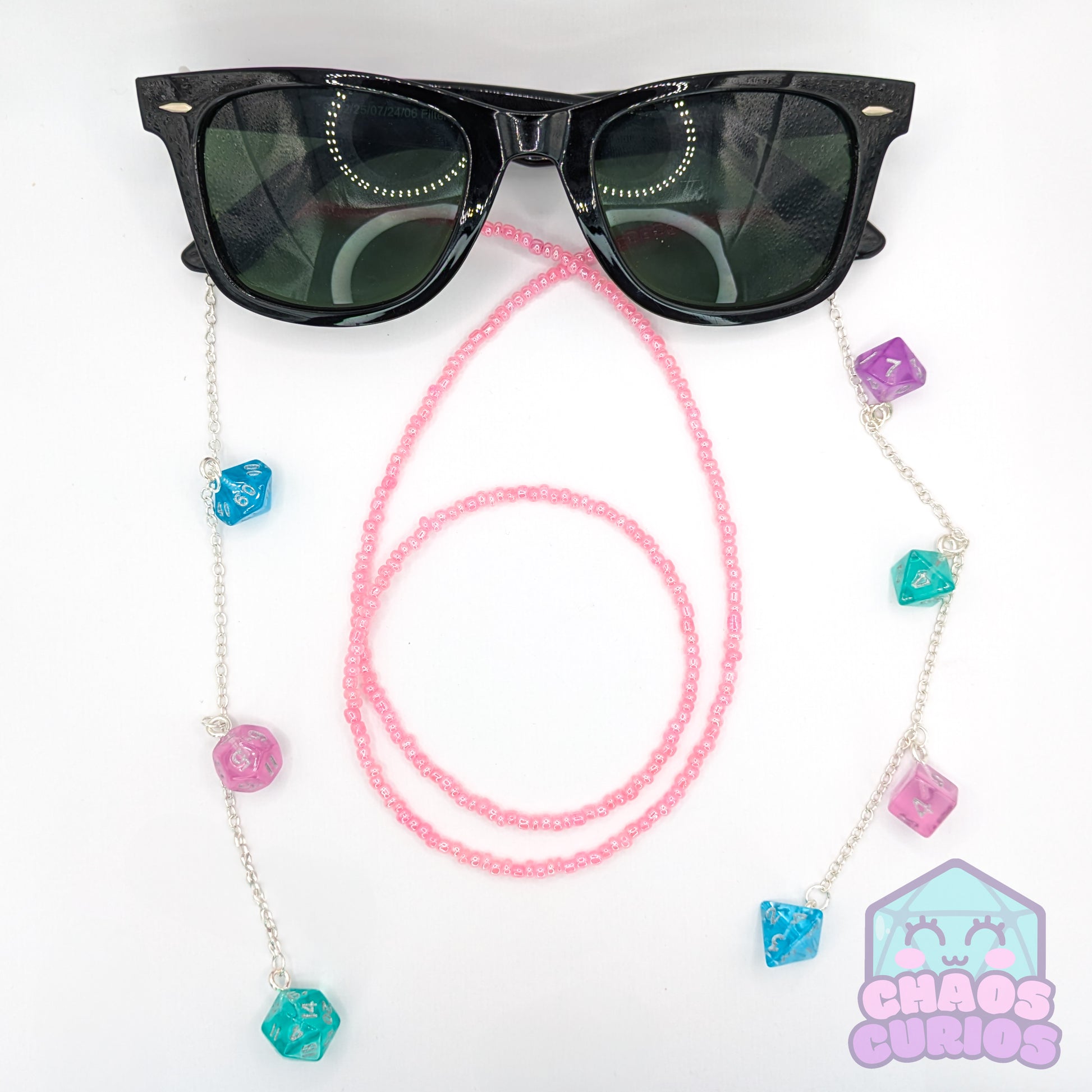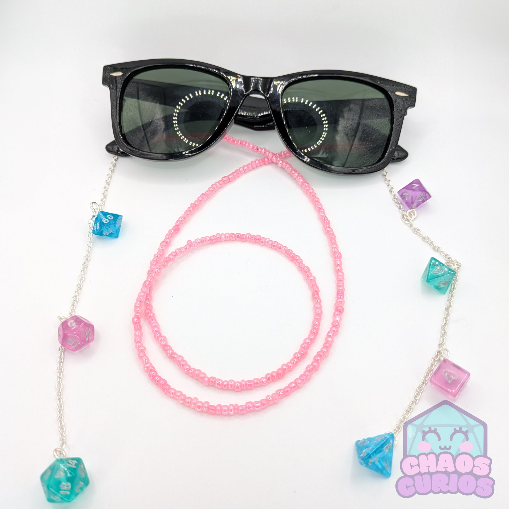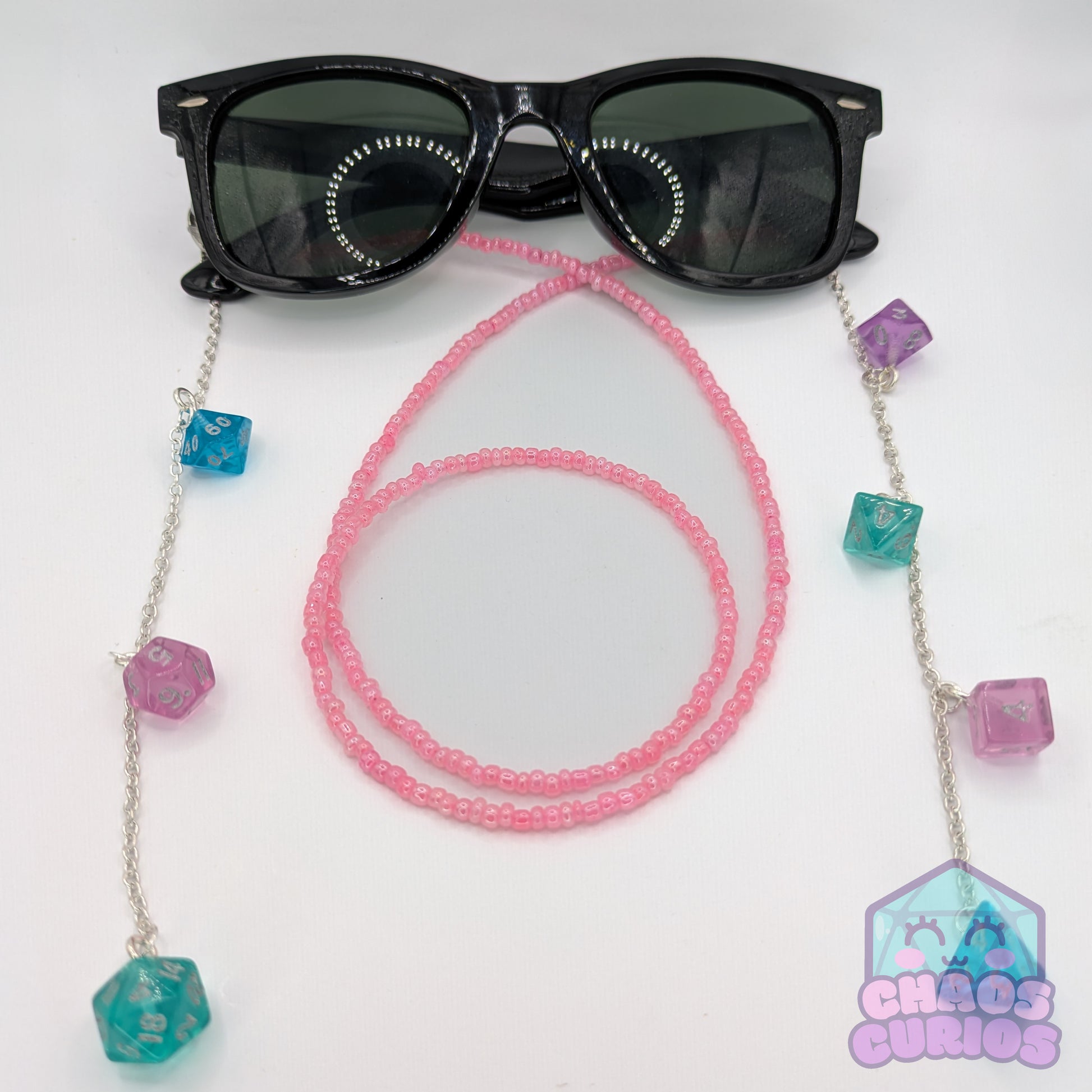 A handcrafted glasses chain made with a full set of mini dice in a pink, blue, purple and teal colour mix. Chain is made of a uniform set of beads, available in 5 chain colours.