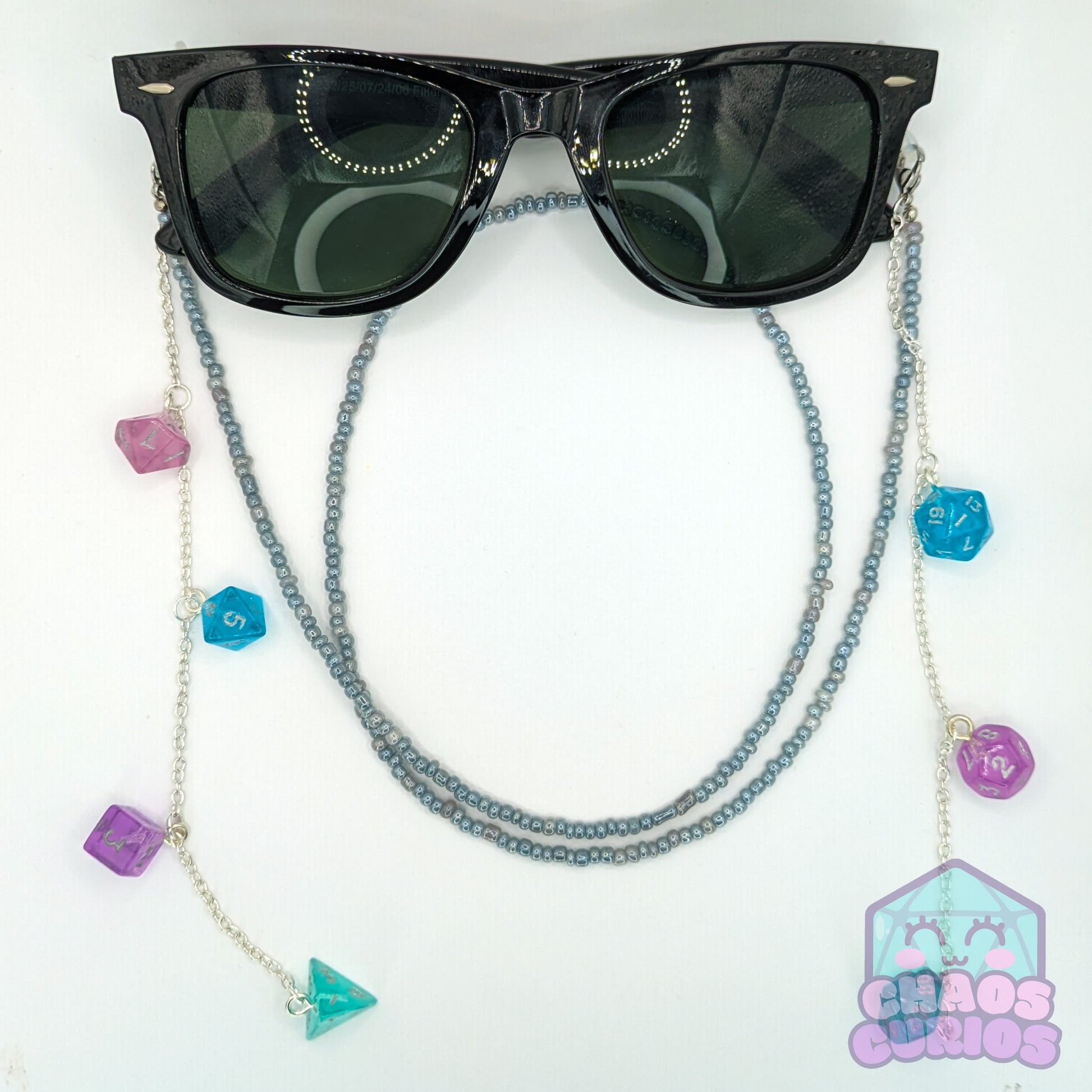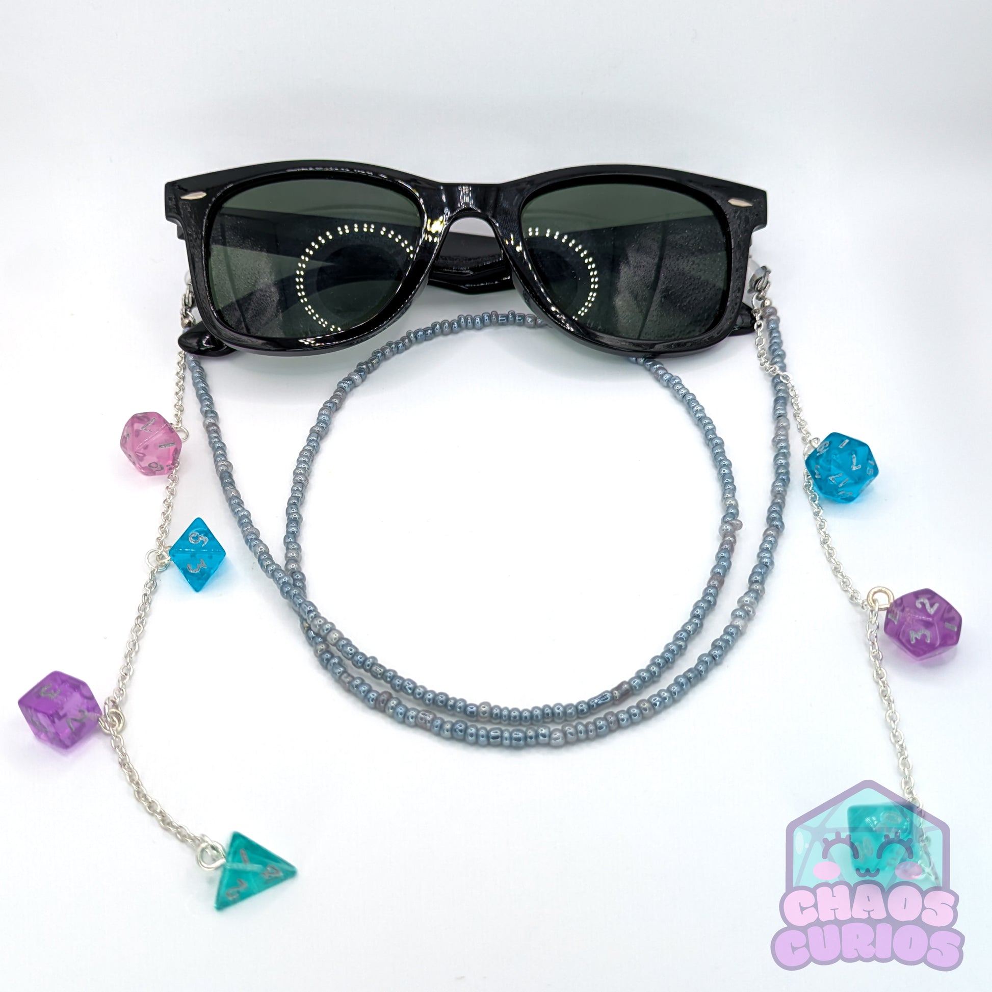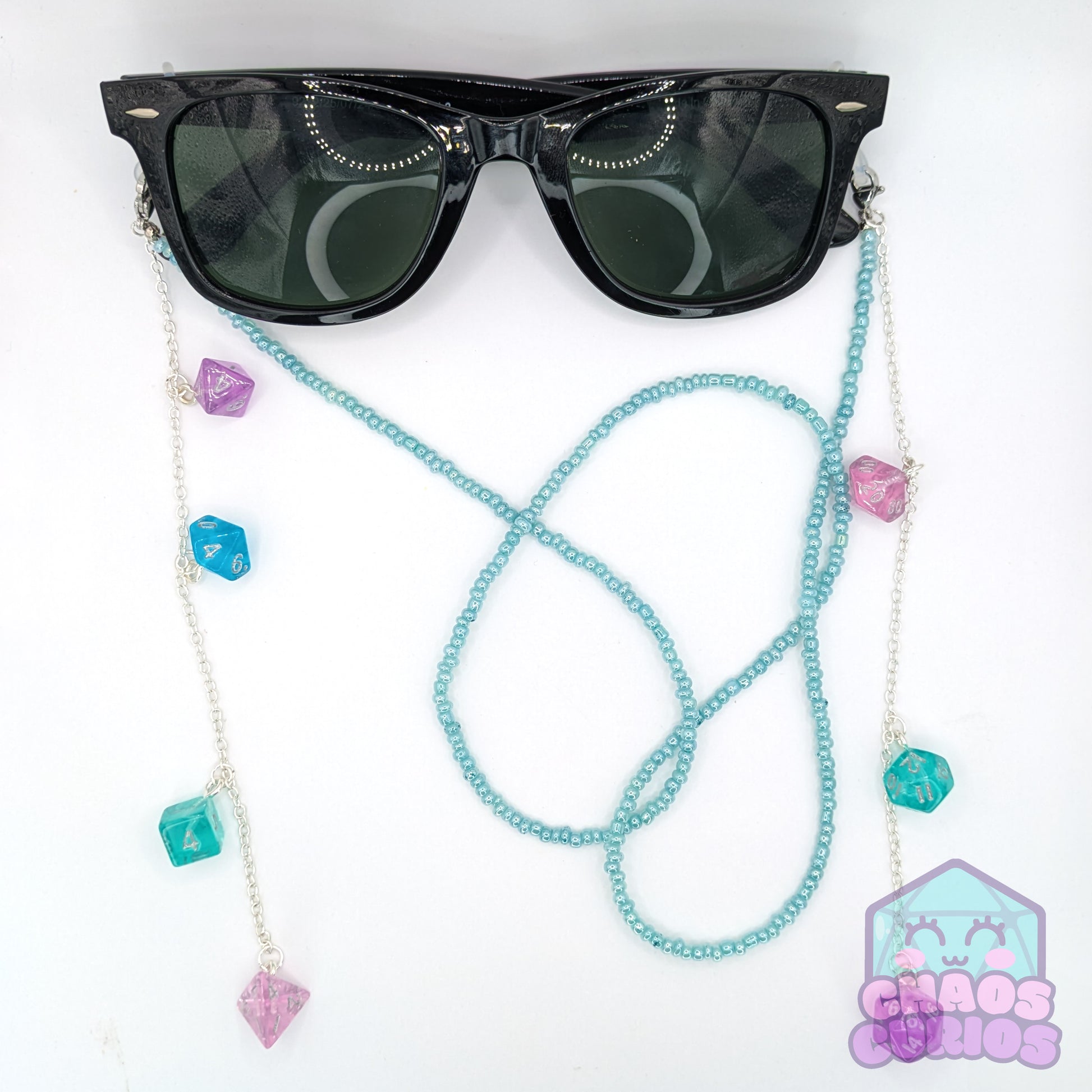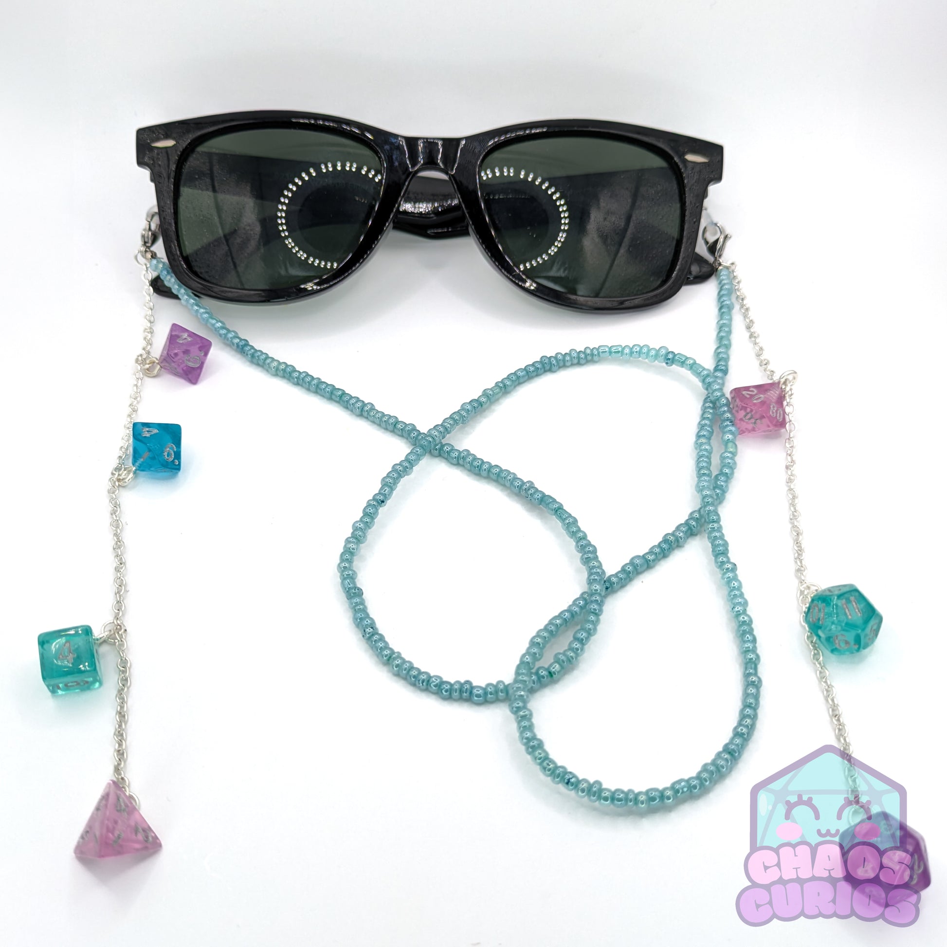 A handcrafted glasses chain made with a full set of mini dice in a pink, blue, purple and teal colour mix. Chain is made of a uniform set of beads, available in 5 chain colours.