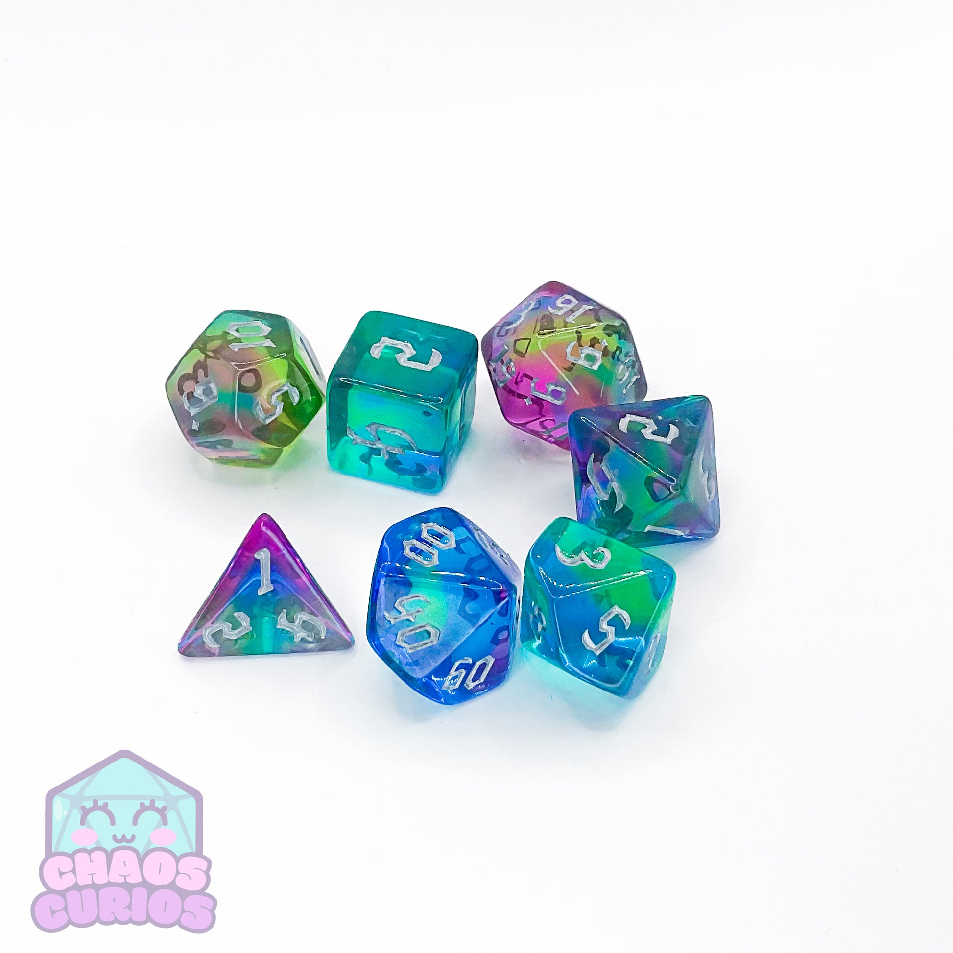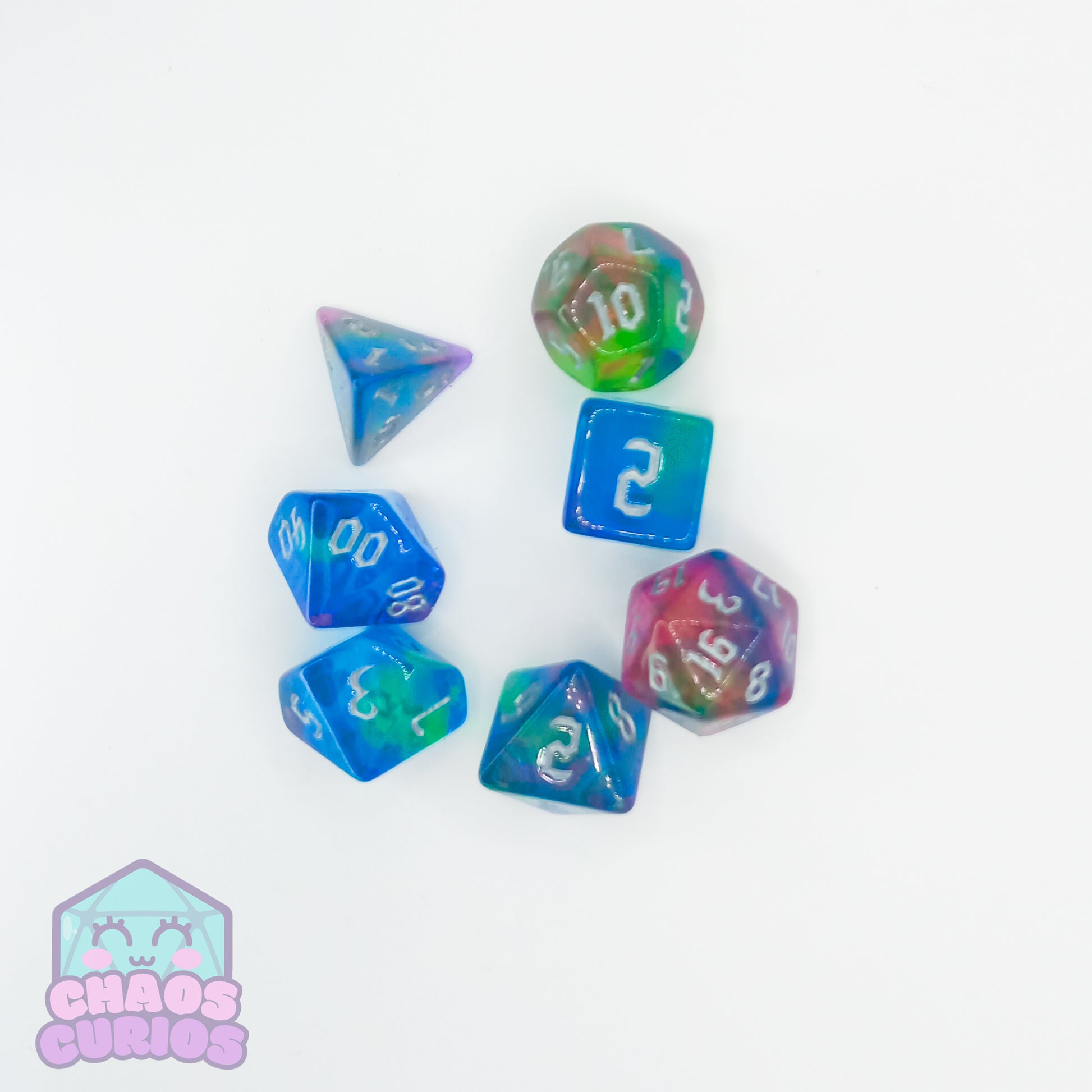7-piece Resin dice set for use with a variety of role playing games. D20, D12, D10, D100, D8, D6 and D4.