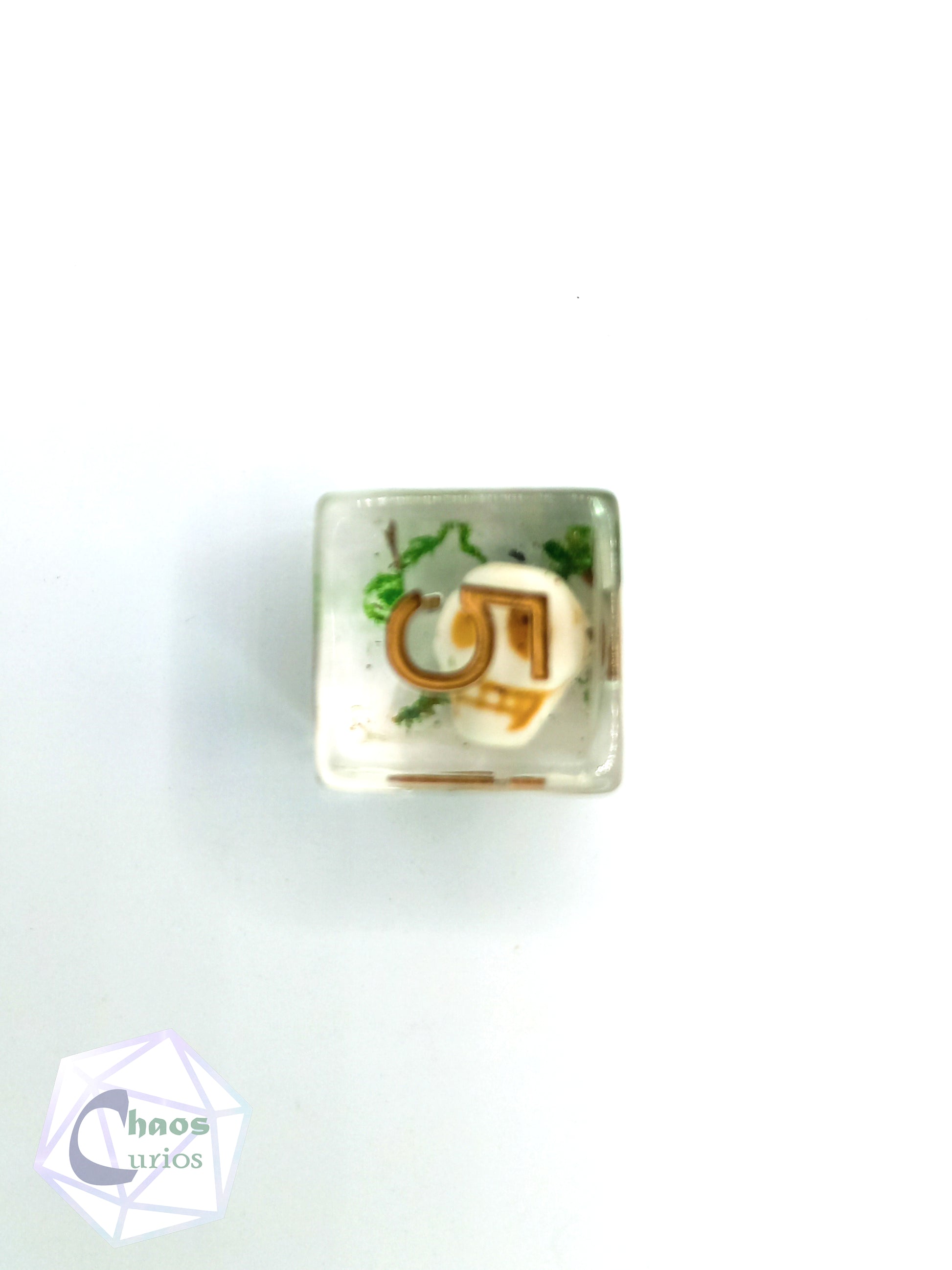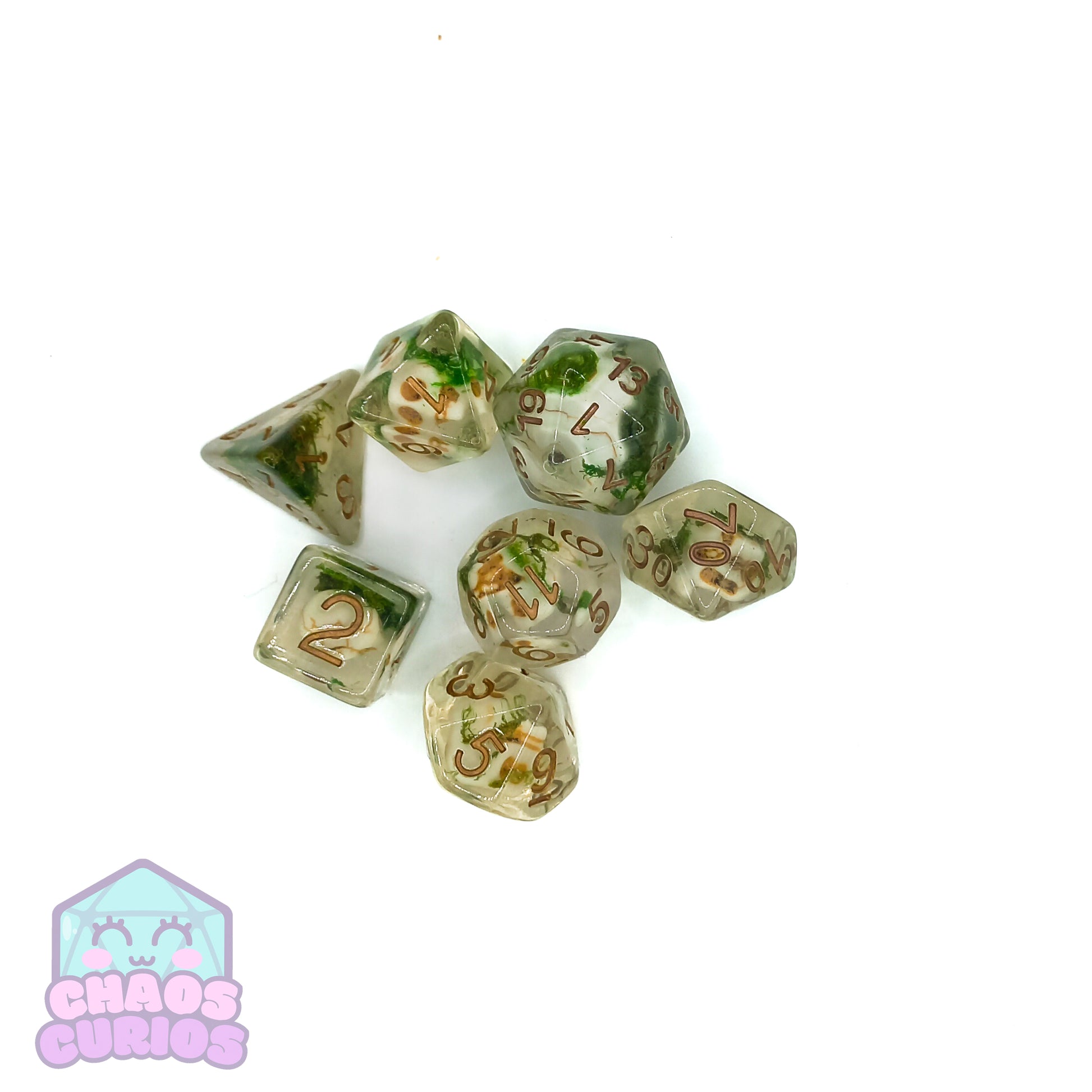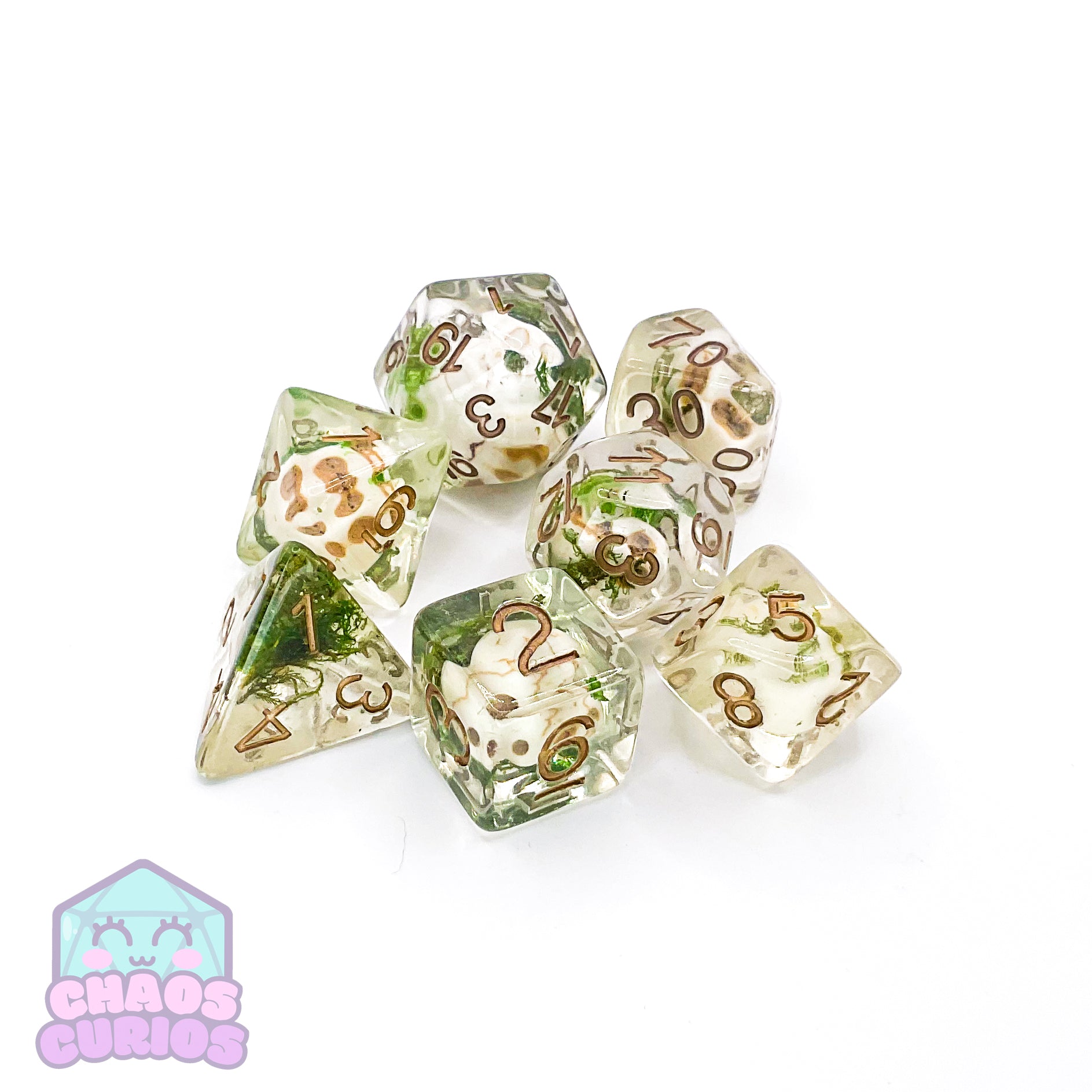 Add a touch of the macabre to your next dice roll with this oh-so-spooky Mossy Grave 7-piece Resin Dice Set! Featuring a skull inclusion, these dice are sure to roll you a grim outcome (unless you get lucky, of course!). Get ready to experience some real bone-chilling fun!