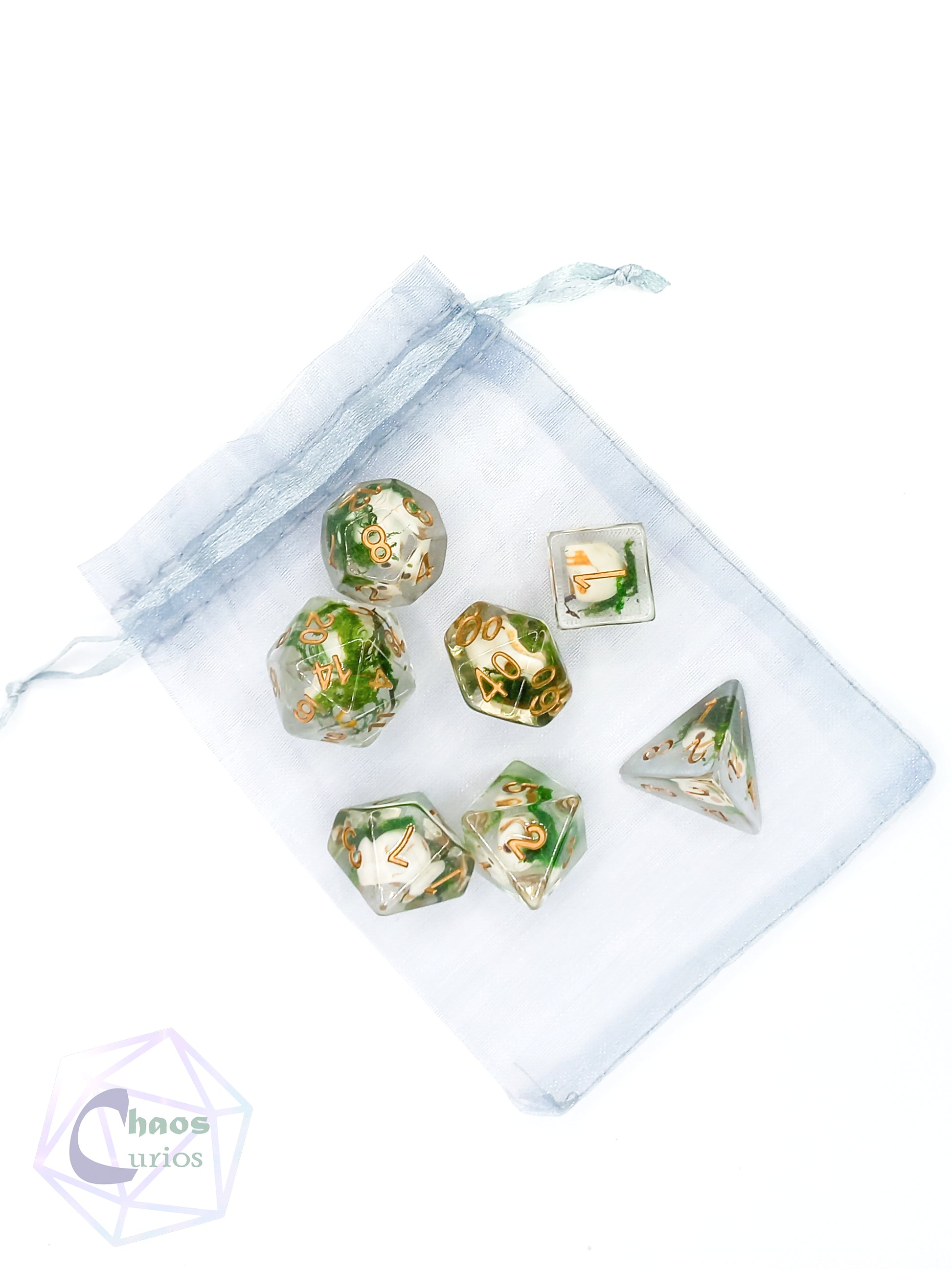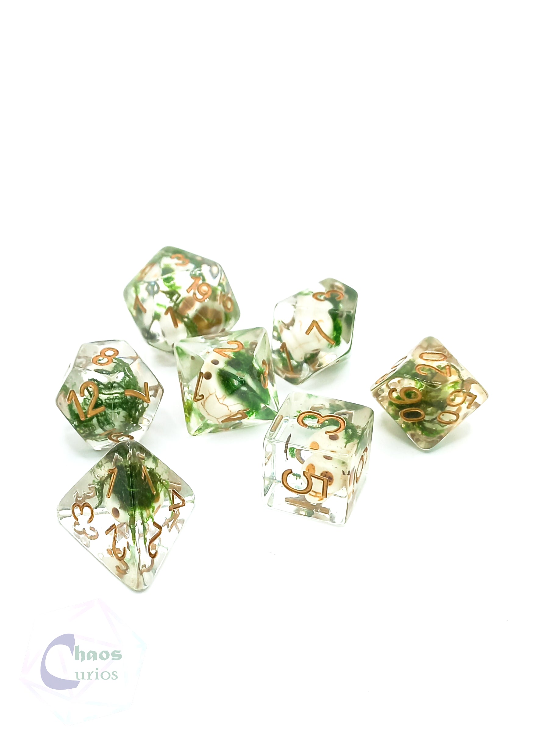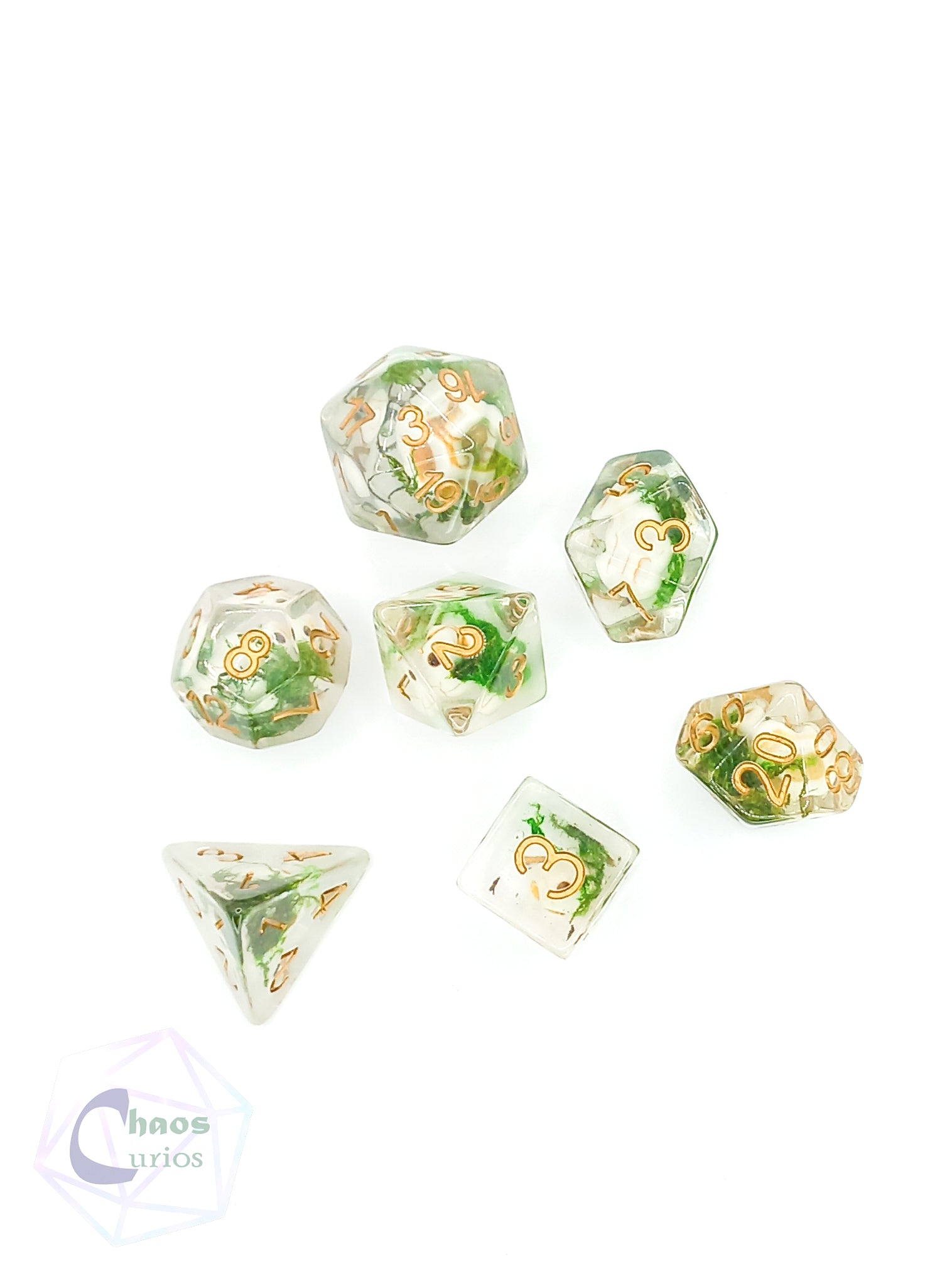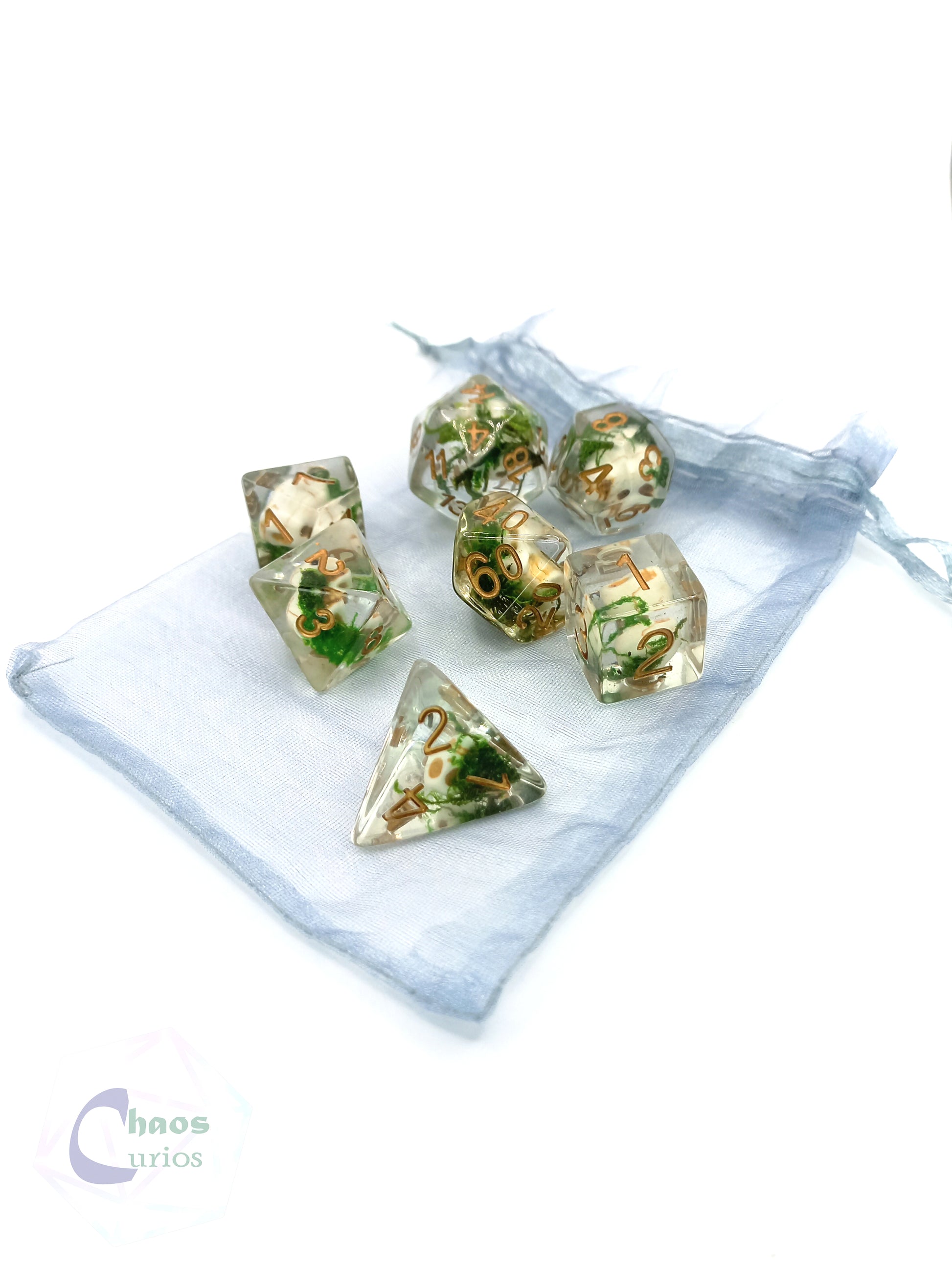 Add a touch of the macabre to your next dice roll with this oh-so-spooky Mossy Grave 7-piece Resin Dice Set! Featuring a skull inclusion, these dice are sure to roll you a grim outcome (unless you get lucky, of course!). Get ready to experience some real bone-chilling fun!