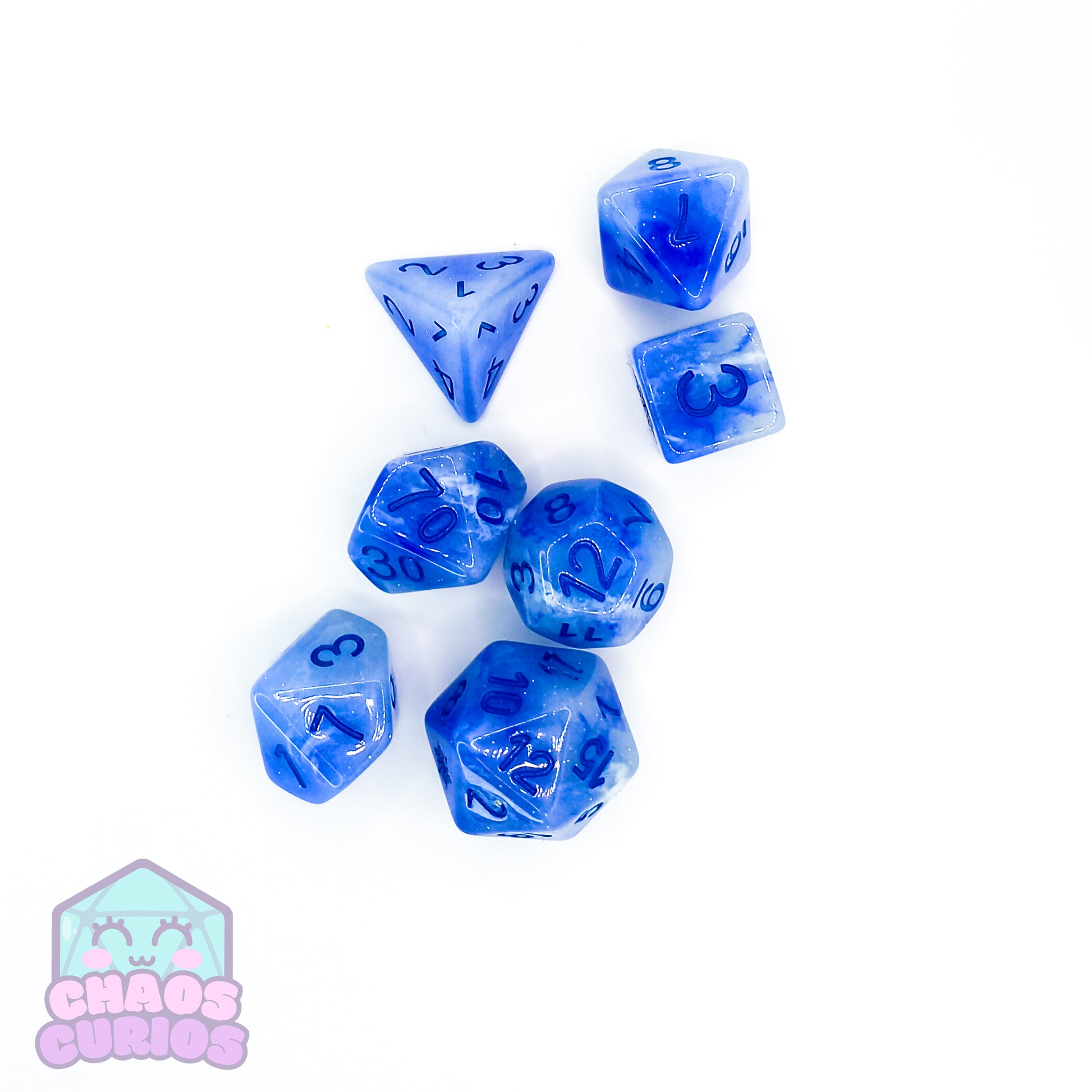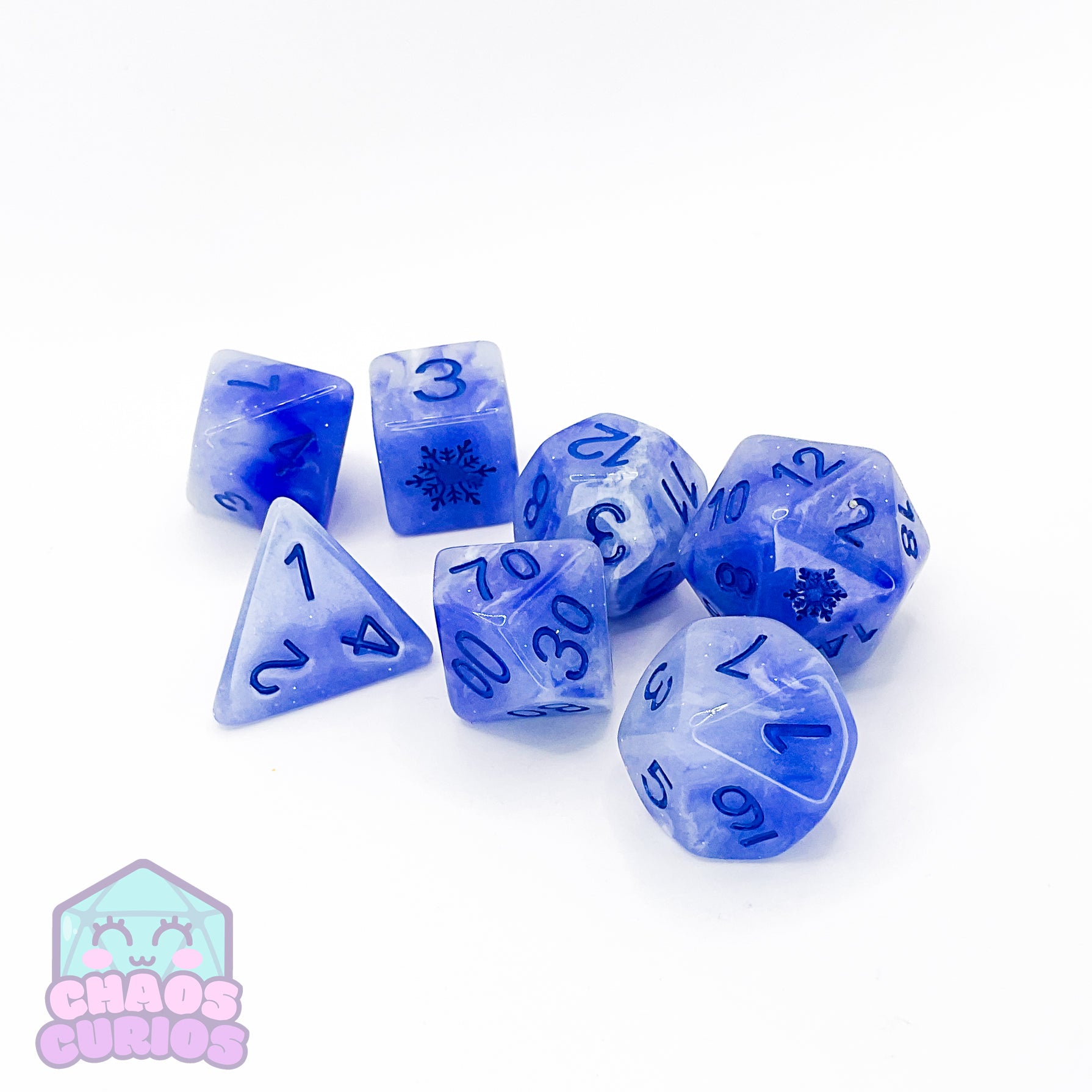 - Blue Resin with snowflakes on the D6 6 and the D20 20 faces.