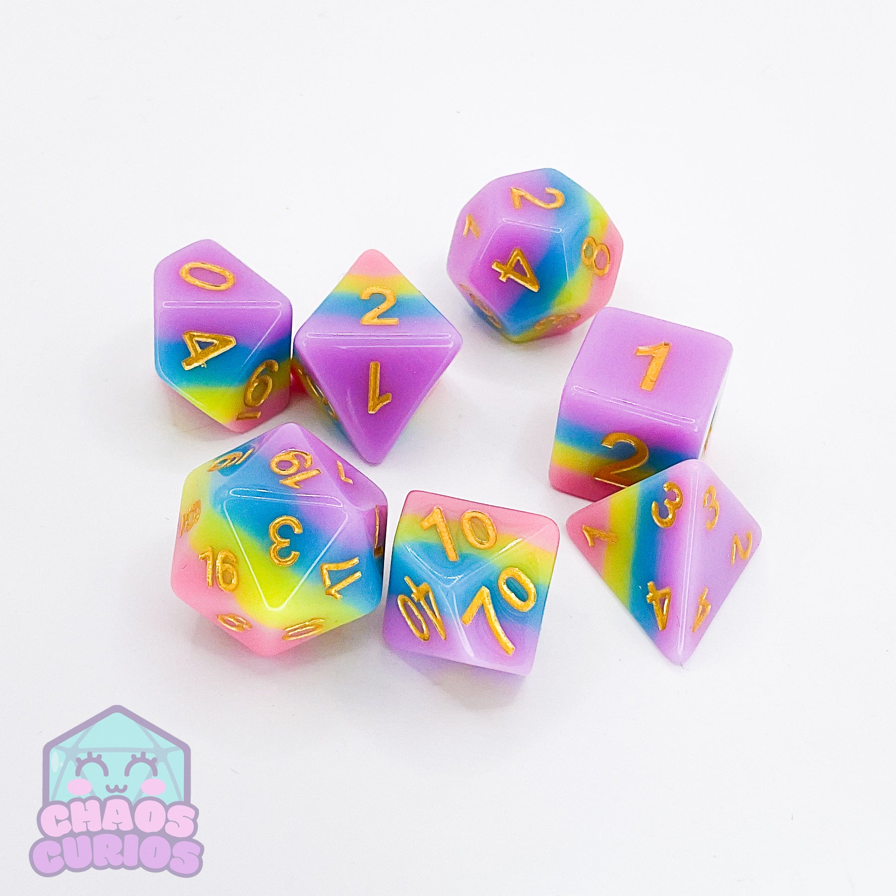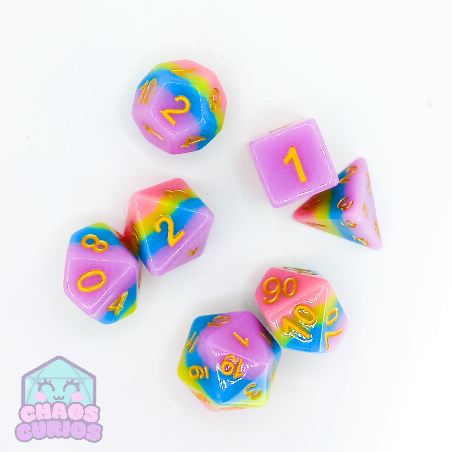 7-piece dice set for use with a variety of role playing games. D20, D12, D10, D100, D8, D6 and D4.