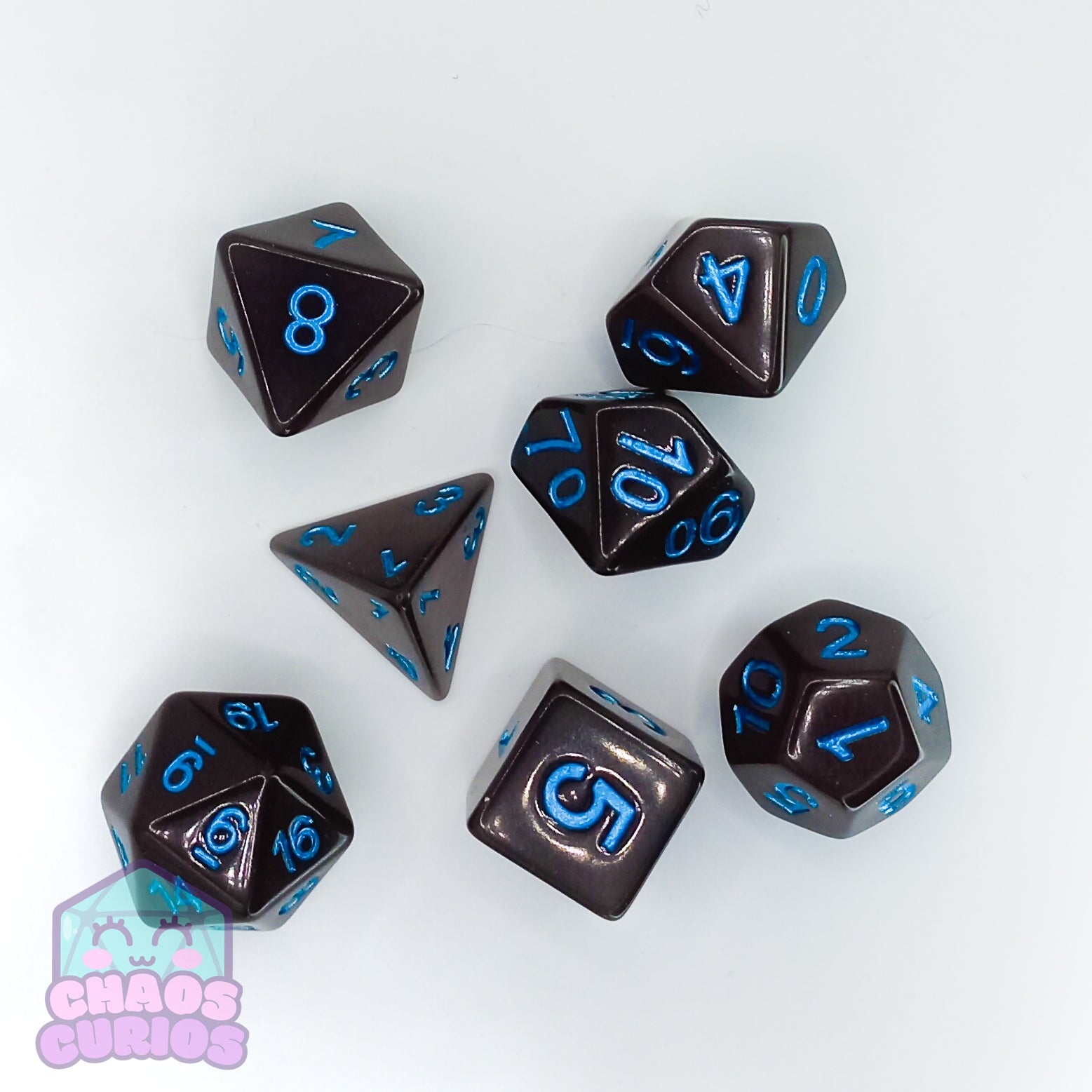 7-piece dice set for use with a variety of role playing games. D20, D12, D10, D100, D8, D6 and D4.