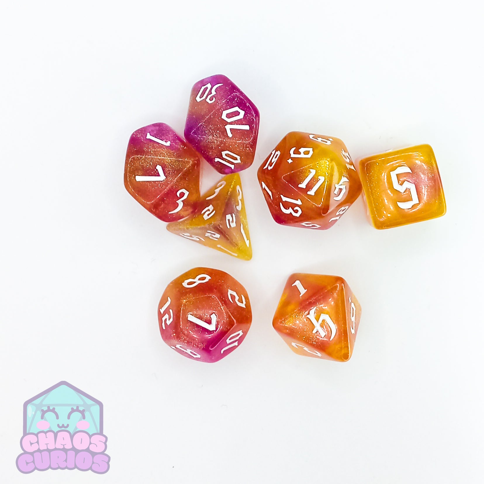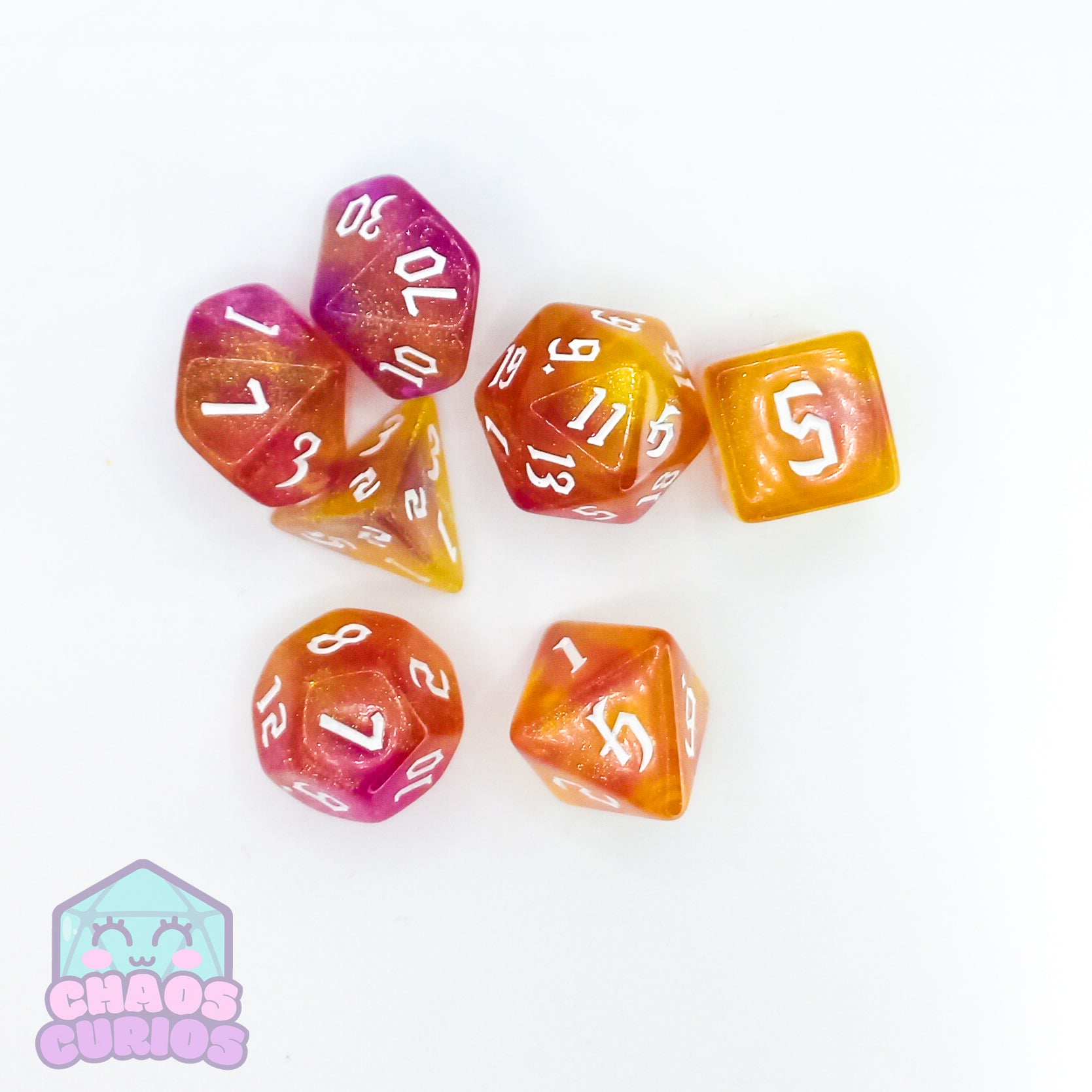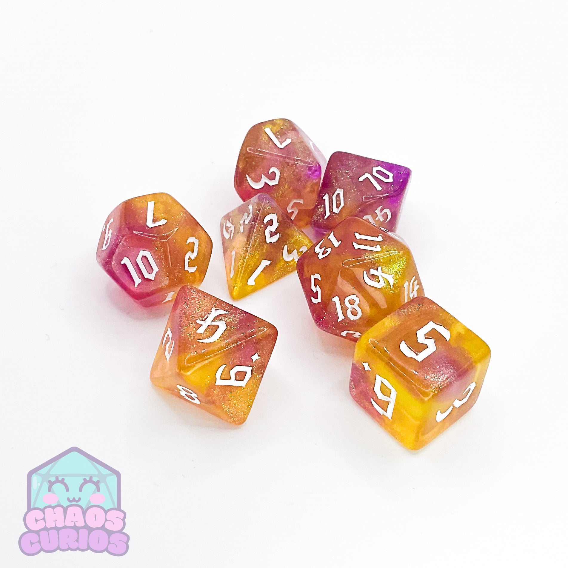 7-piece dice set for use with a variety of role playing games. D20, D12, D10, D100, D8, D6 and D4.