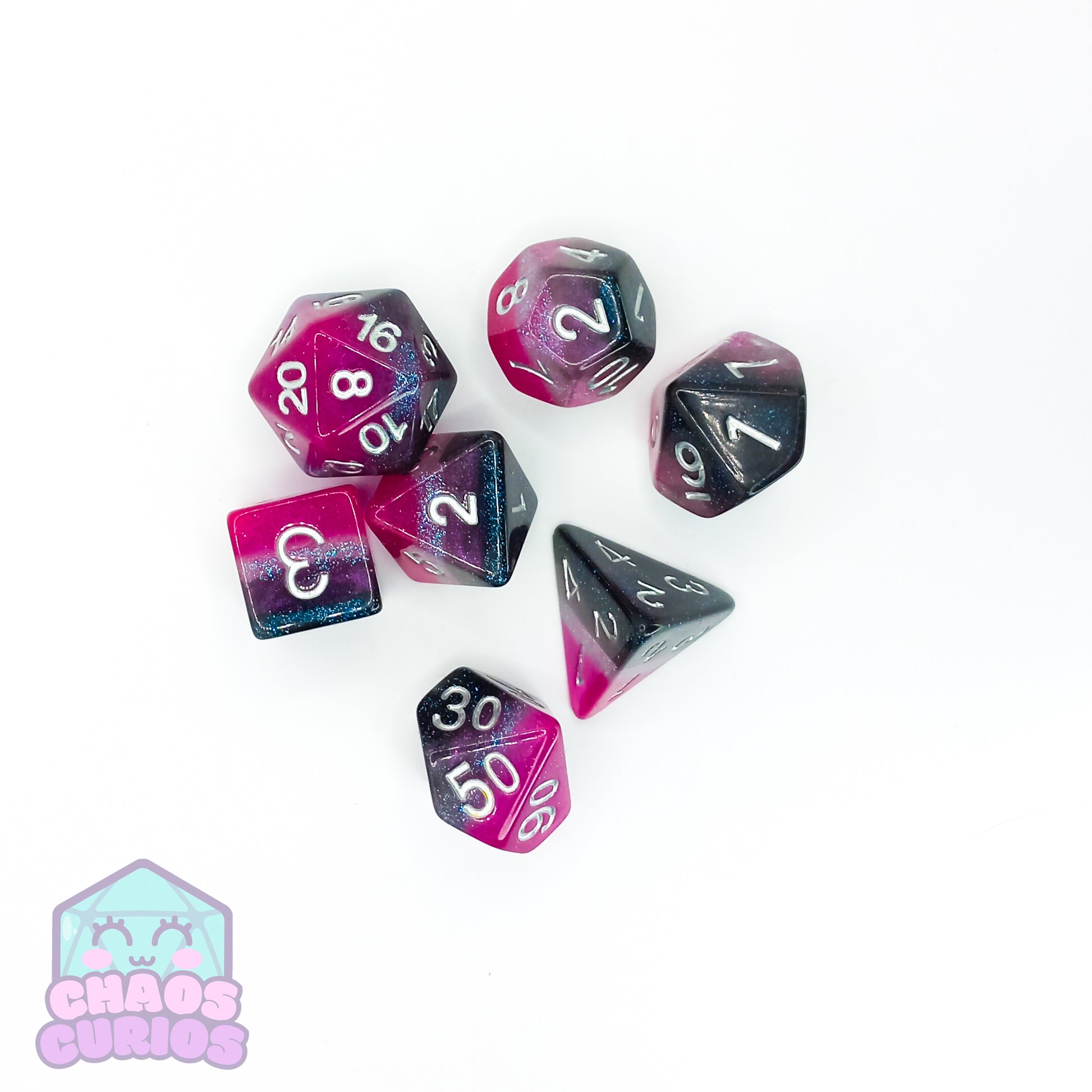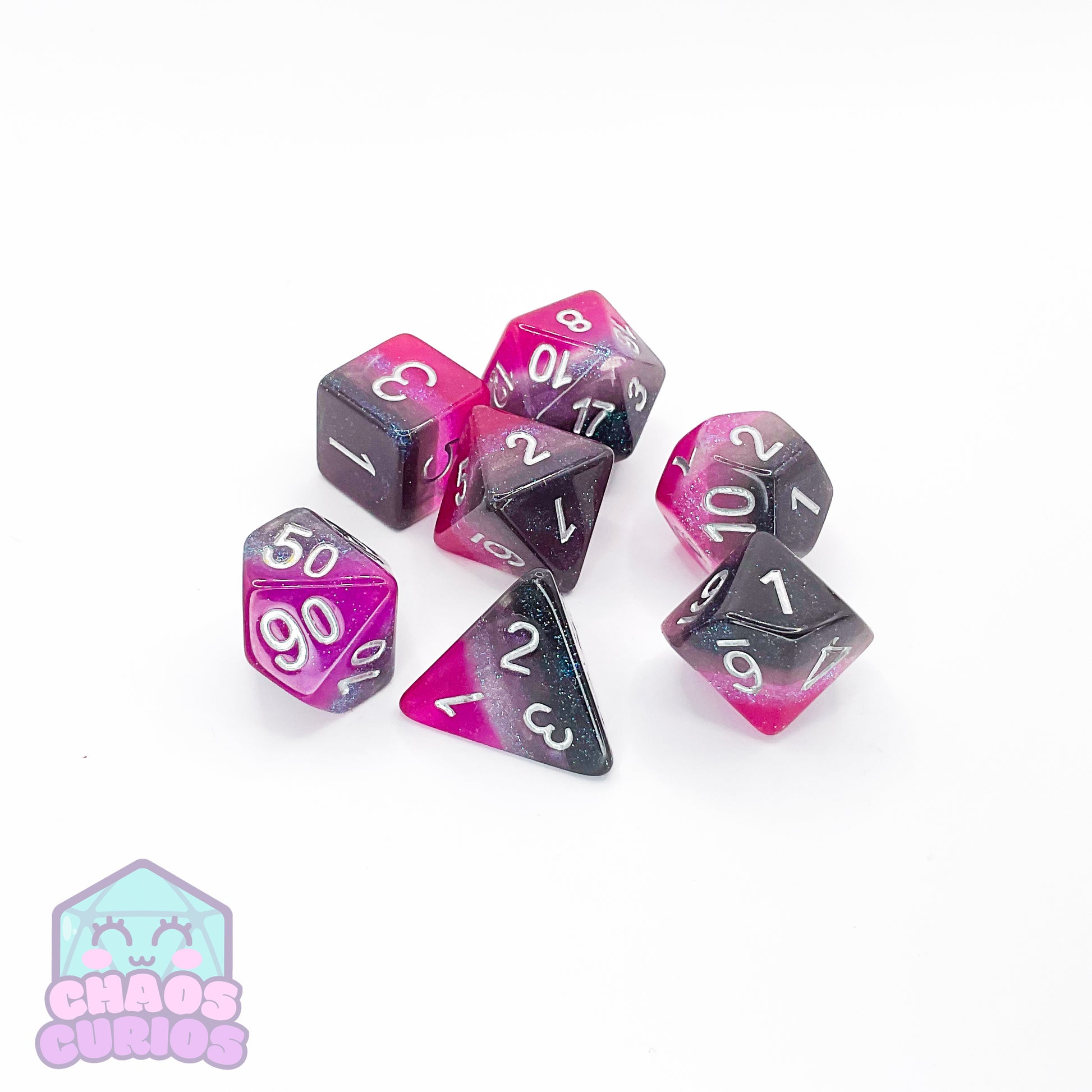 7-piece Resin dice set for use with a variety of role playing games. D20, D12, D10, D100, D8, D6 and D4.