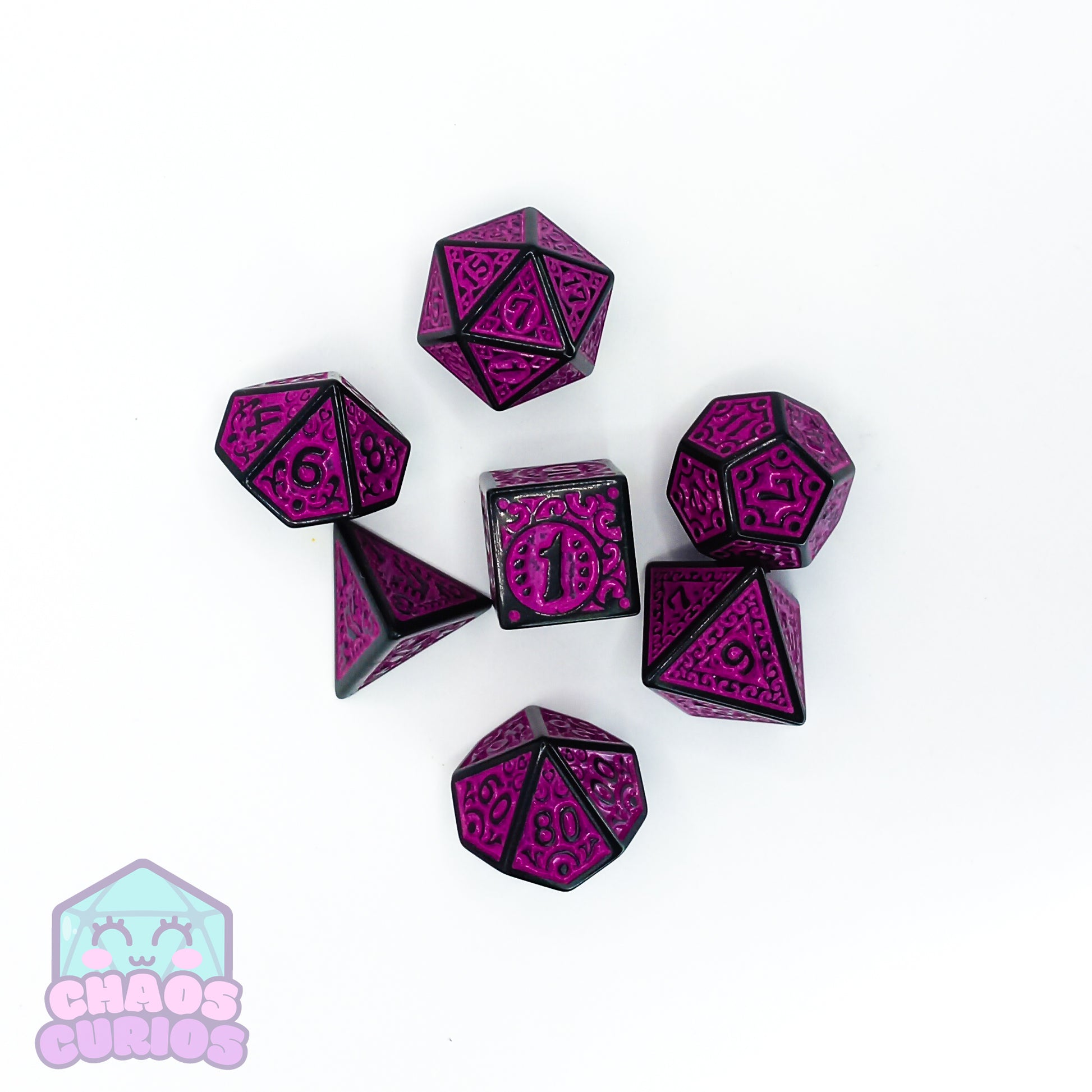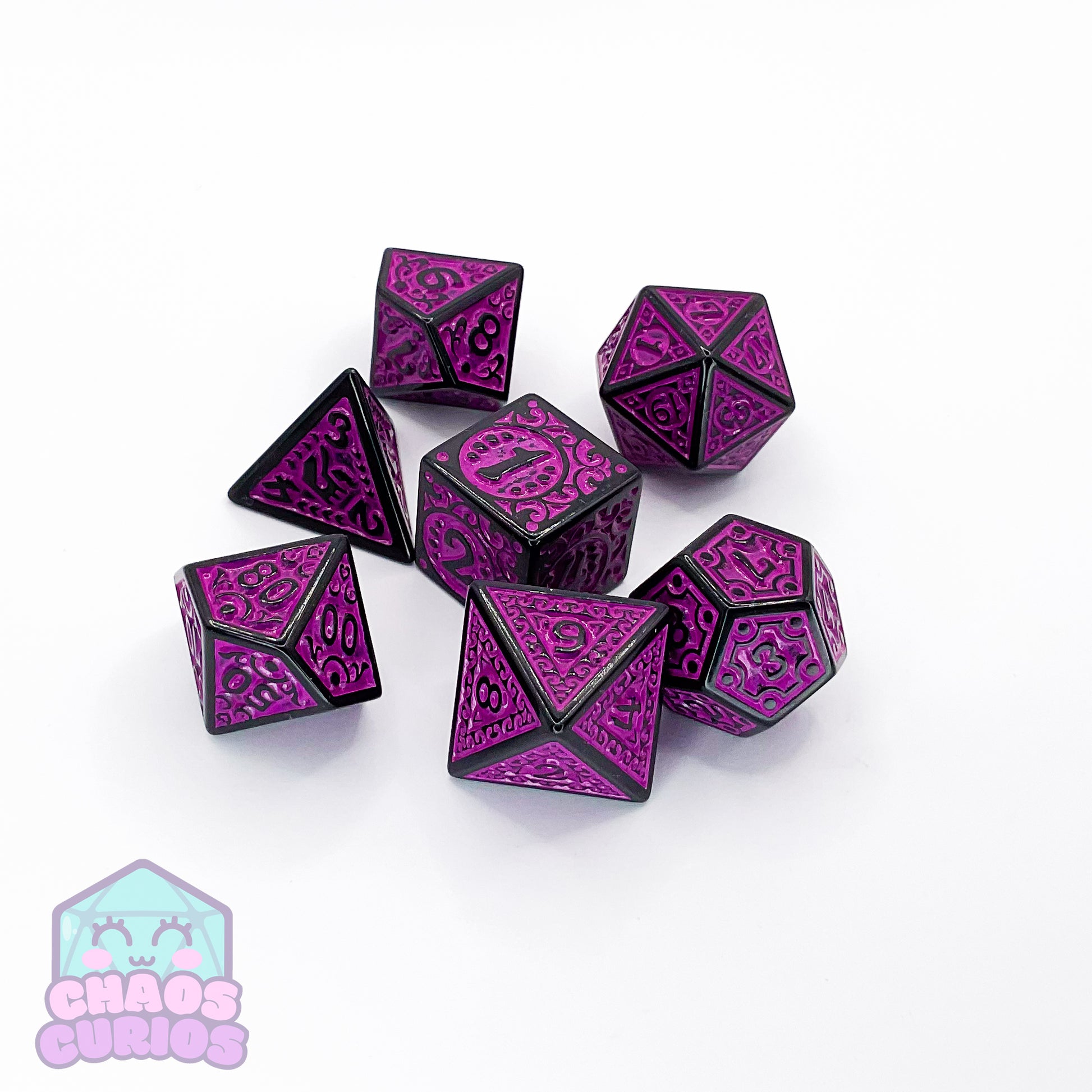 Roll the dice with style with this Purple Black Glyph 7-piece Dice Set! Lookin' sharp with its unique glyph window design, your gaming get-togethers will be elevated to a whole new level of extra. Get ready for the luckiest of throws! 🎲