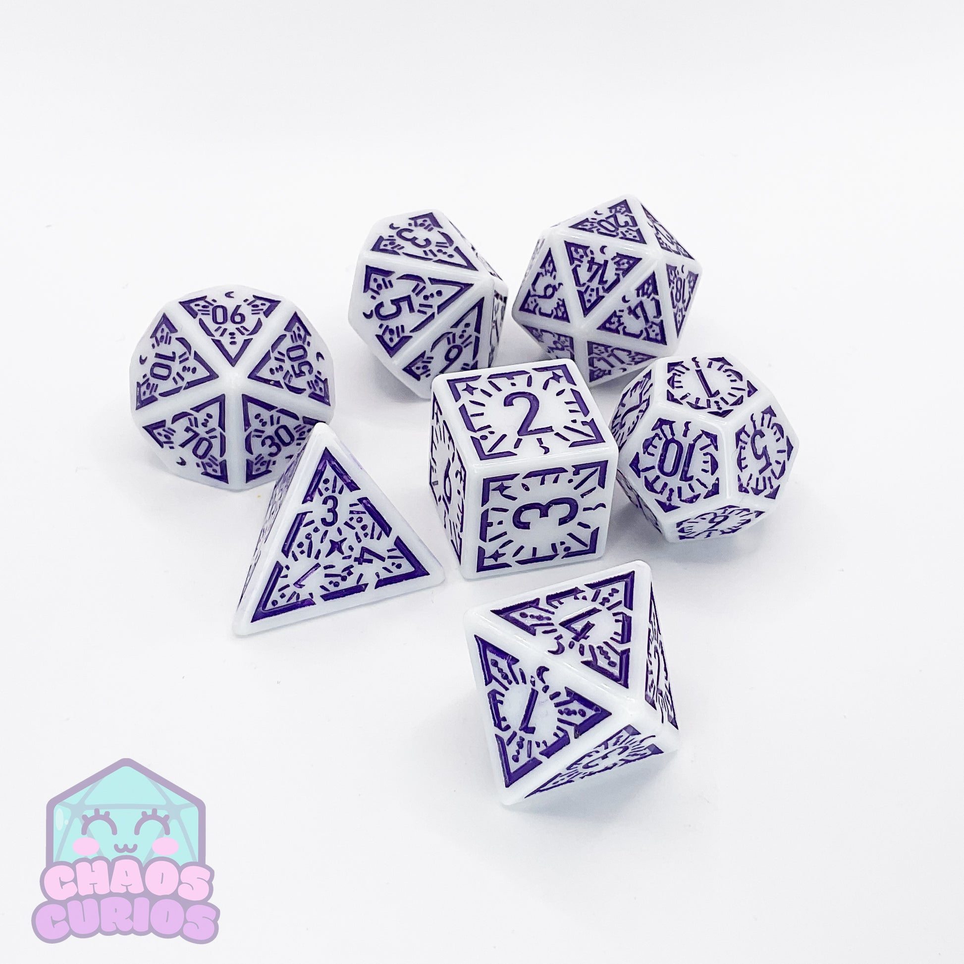 Roll the dice with style with this Purple White Glyph 7-piece Dice Set! Lookin' sharp with its unique glyph window design, your gaming get-togethers will be elevated to a whole new level of extra. Get ready for the luckiest of throws! 🎲