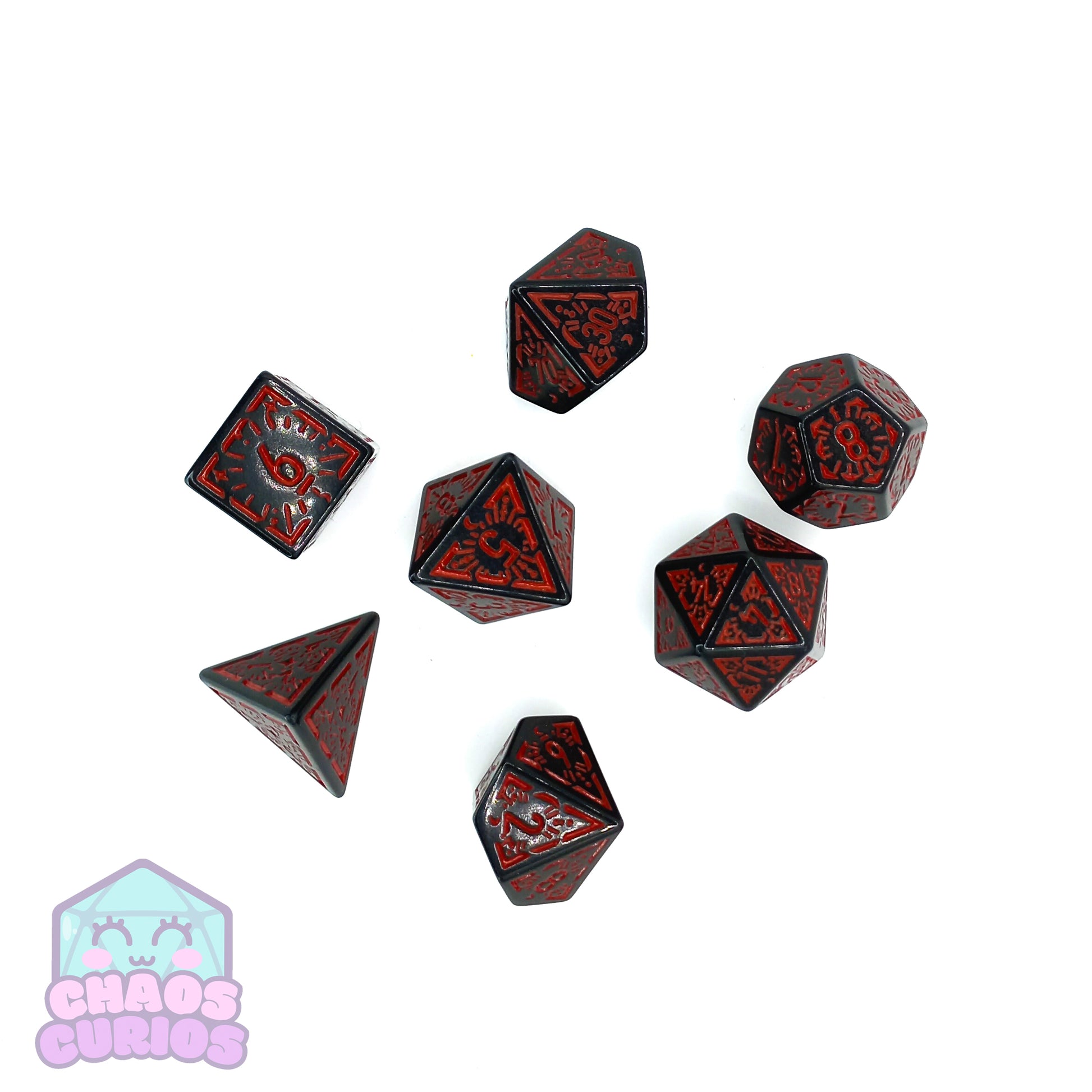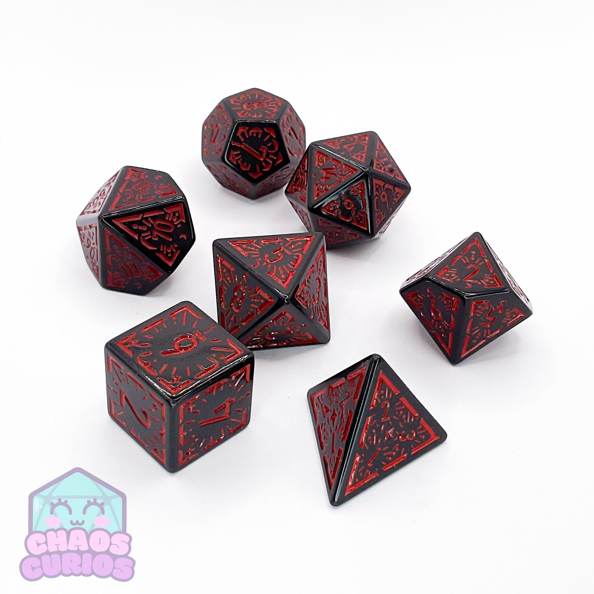 Roll the dice with style with this Red Black Glyph 7-piece Dice Set! Lookin' sharp with its unique glyph window design, your gaming get-togethers will be elevated to a whole new level of extra. Get ready for the luckiest of throws! 🎲