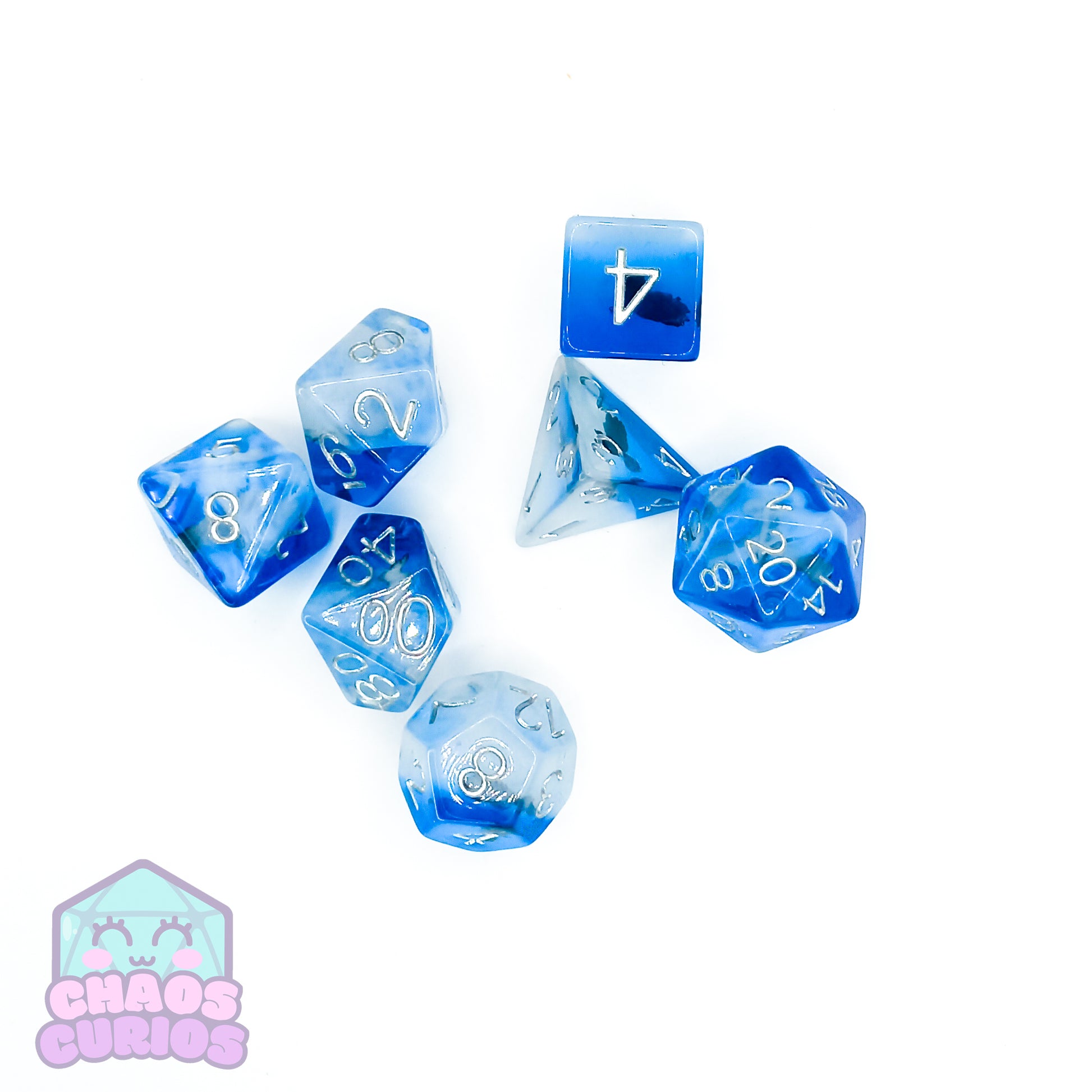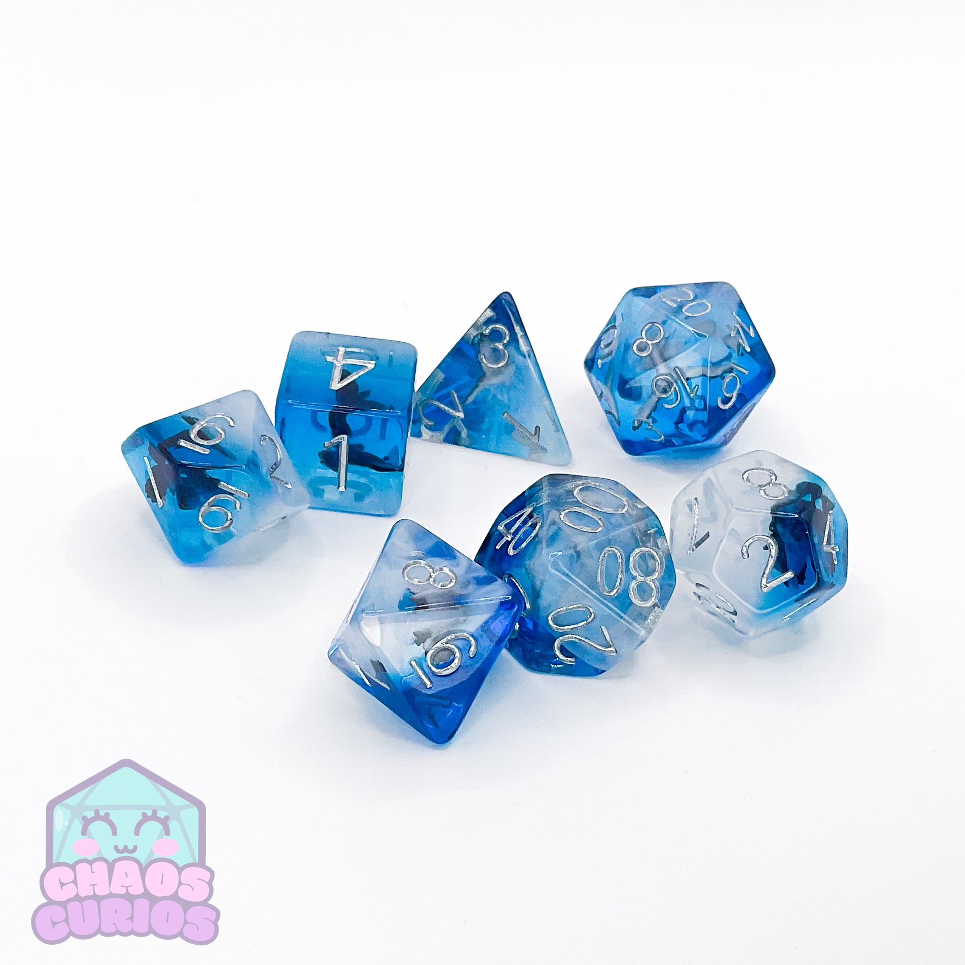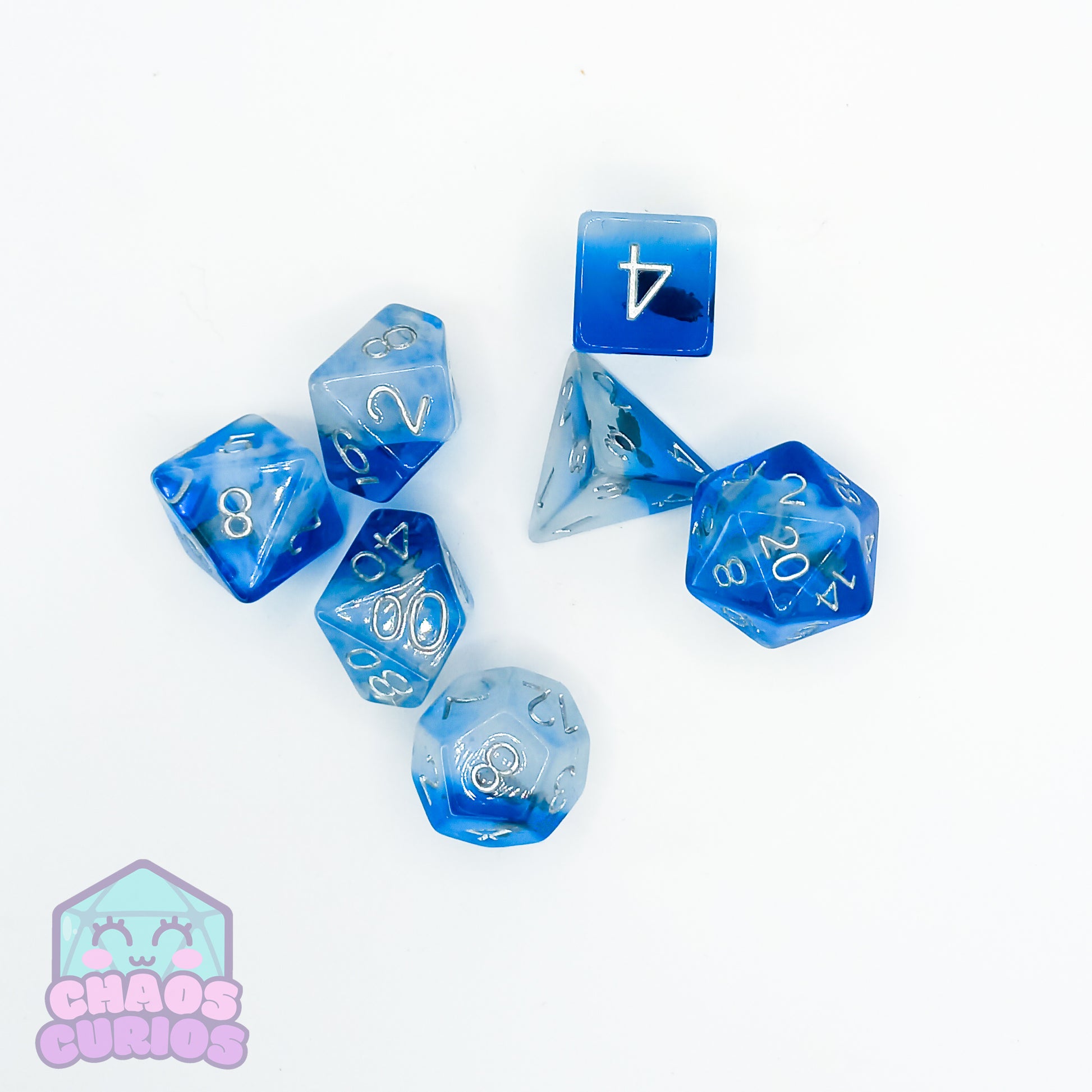 7-piece Resin dice set for use with a variety of role playing games. D20, D12, D10, D100, D8, D6 and D4.
