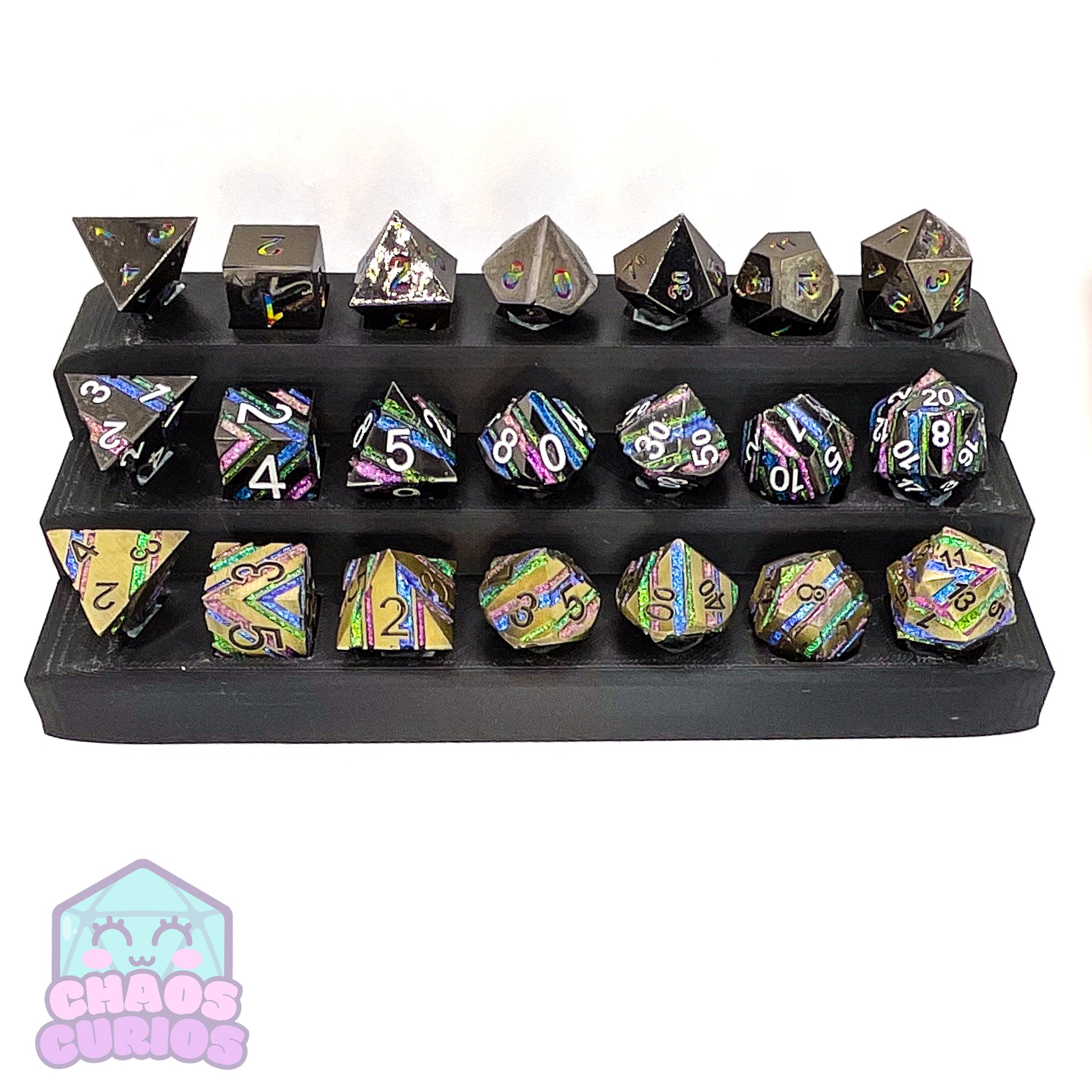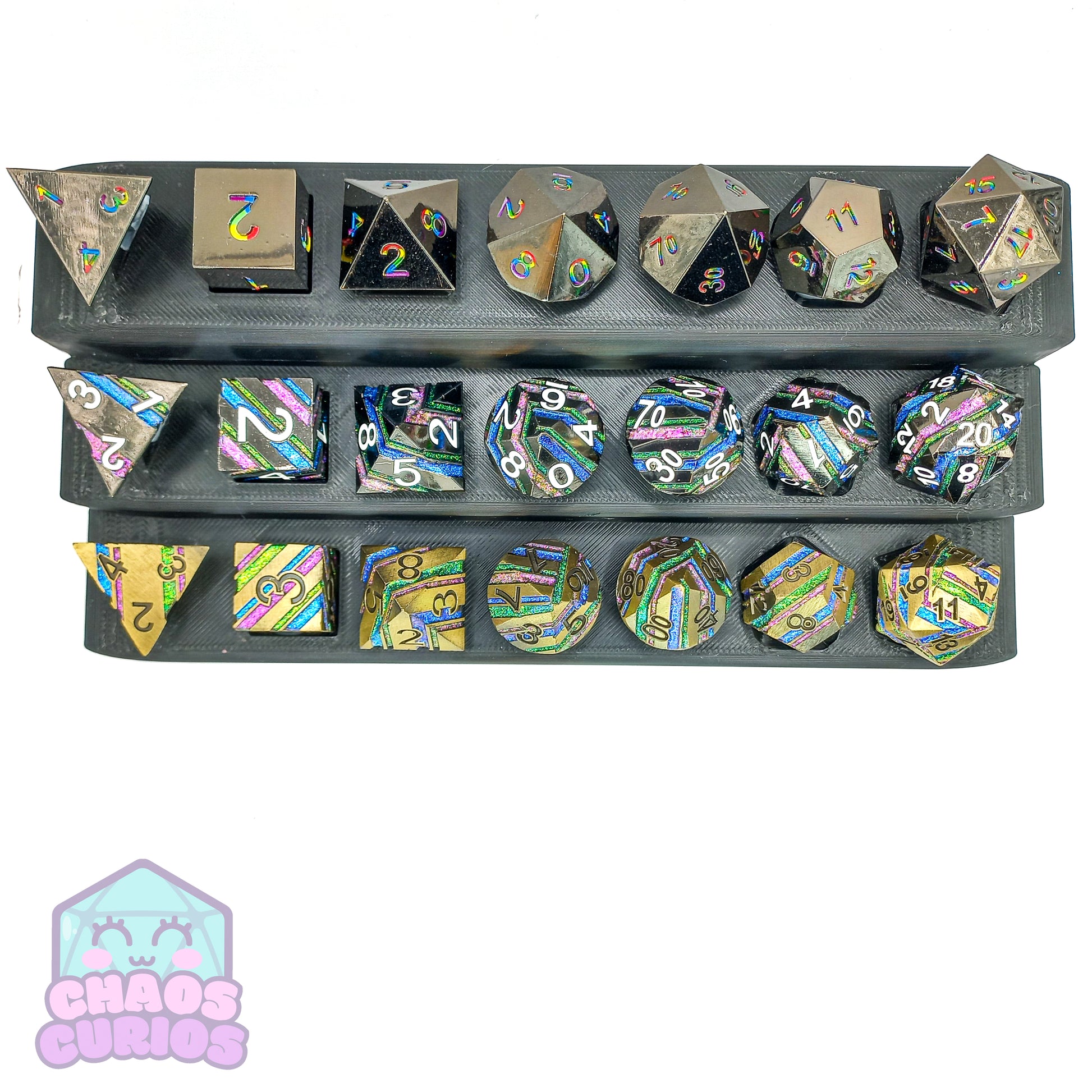 7-piece Metal dice set for use with a variety of role playing games. D20, D12, D10, D100, D8, D6 and D4.