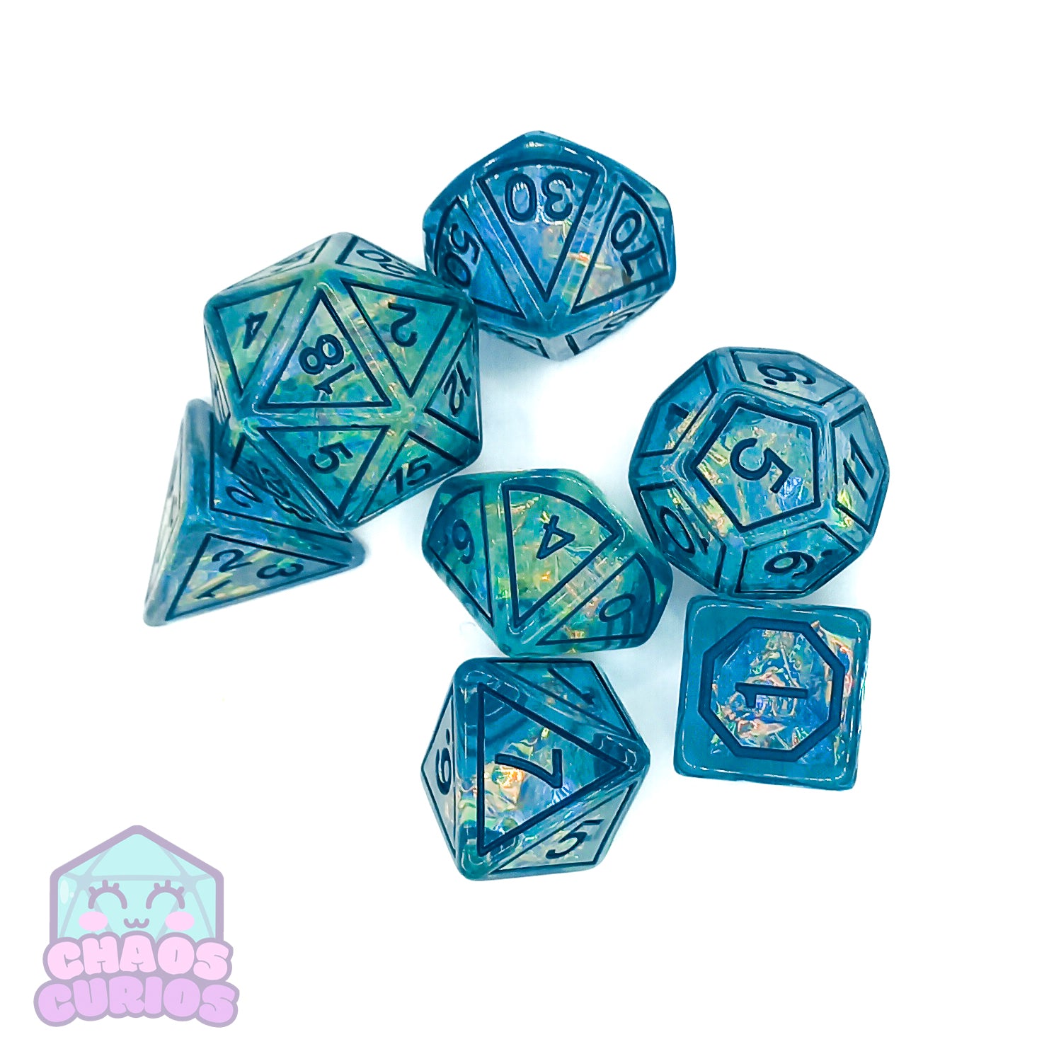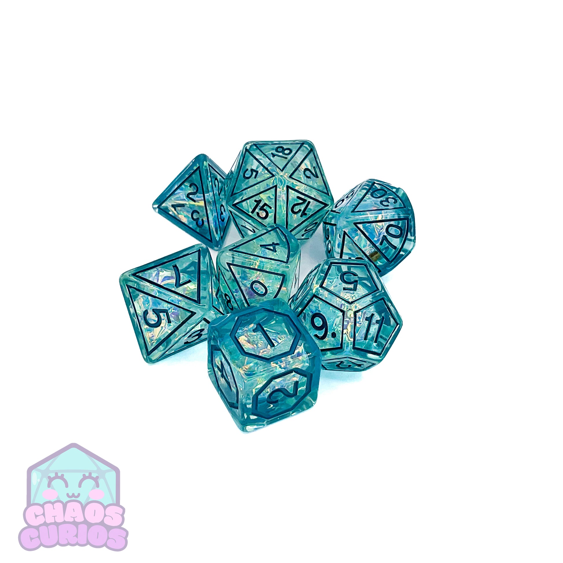 Delight in the elegance of these Suncatcher Blue Resin Dice. Imagine your cleric or paladin's footsteps echoing on the floors of their deity's hallowed halls while the sun glints in through the stained glass windows.