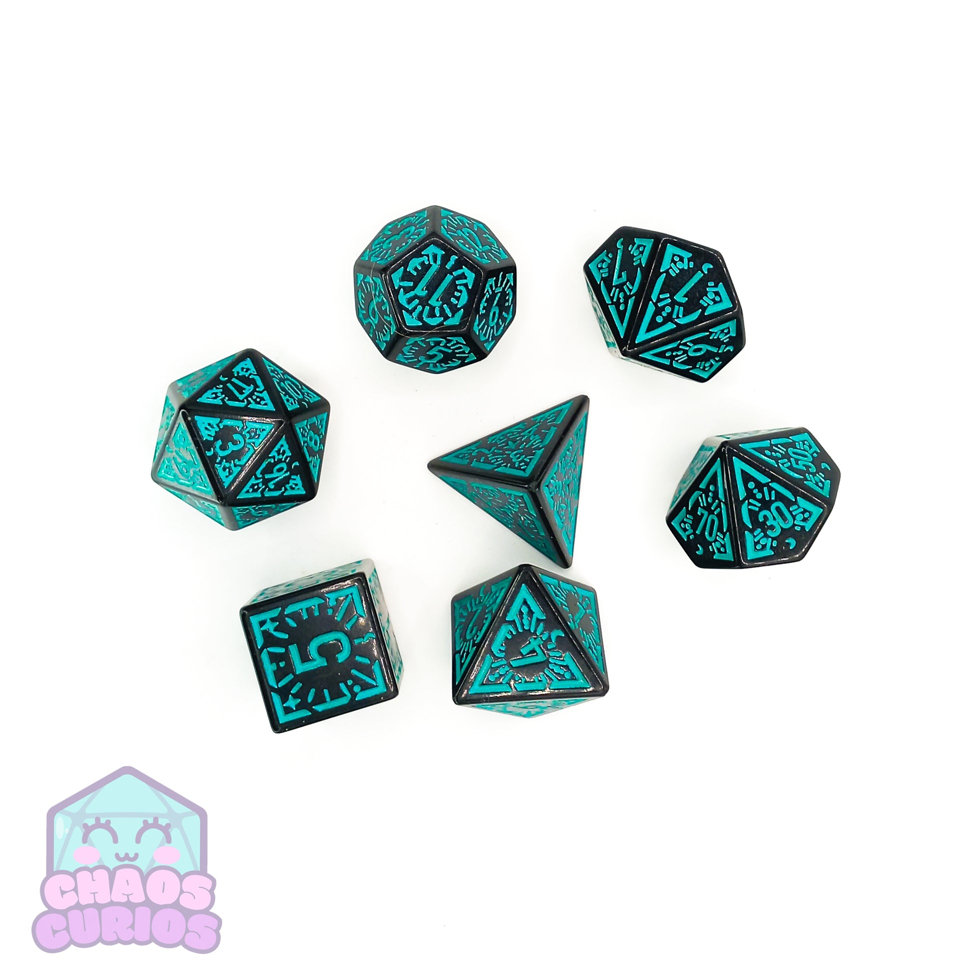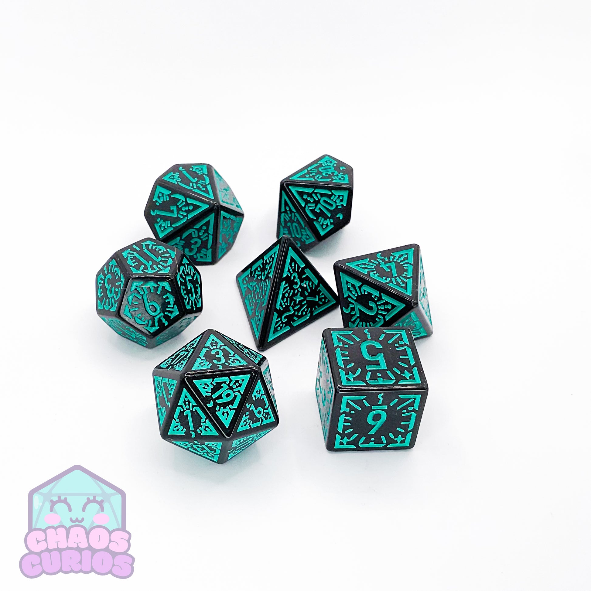 Roll the dice with style with this Teal Black Glyph 7-piece Dice Set! Lookin' sharp with its unique glyph window design, your gaming get-togethers will be elevated to a whole new level of extra. Get ready for the luckiest of throws! 🎲