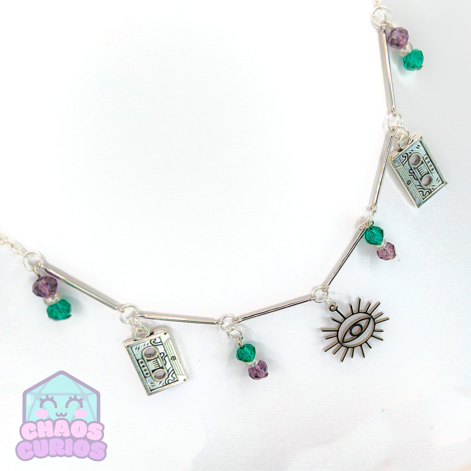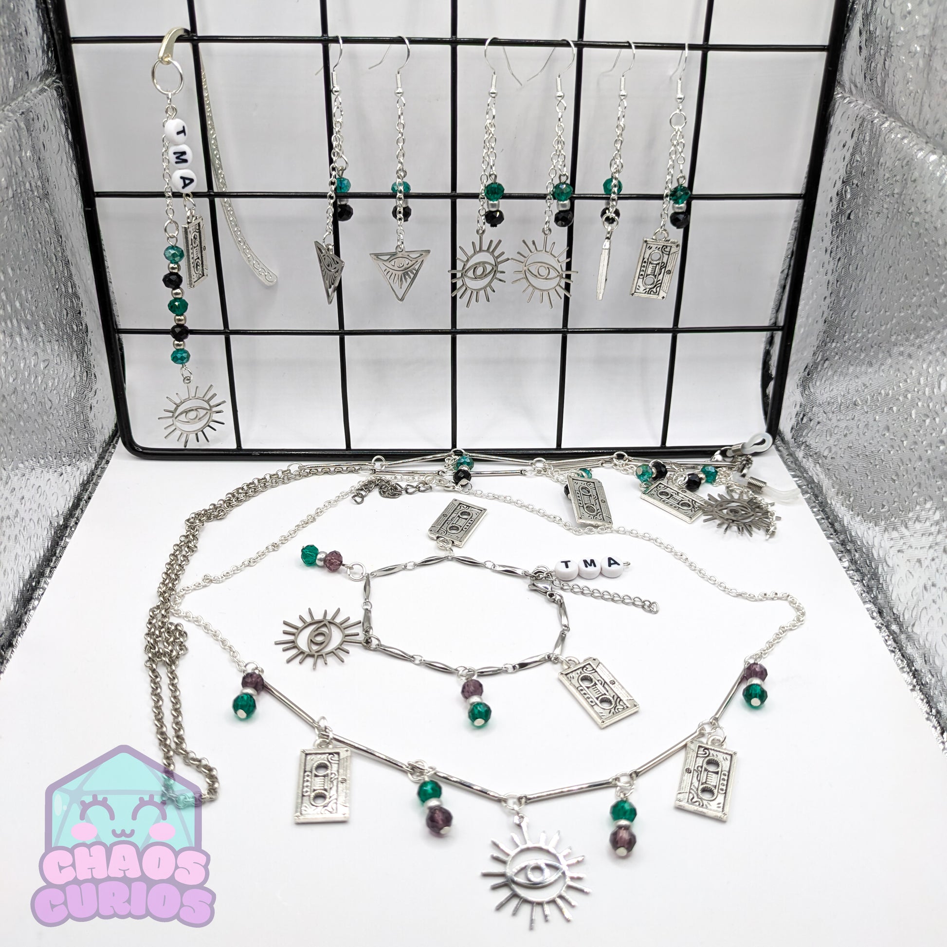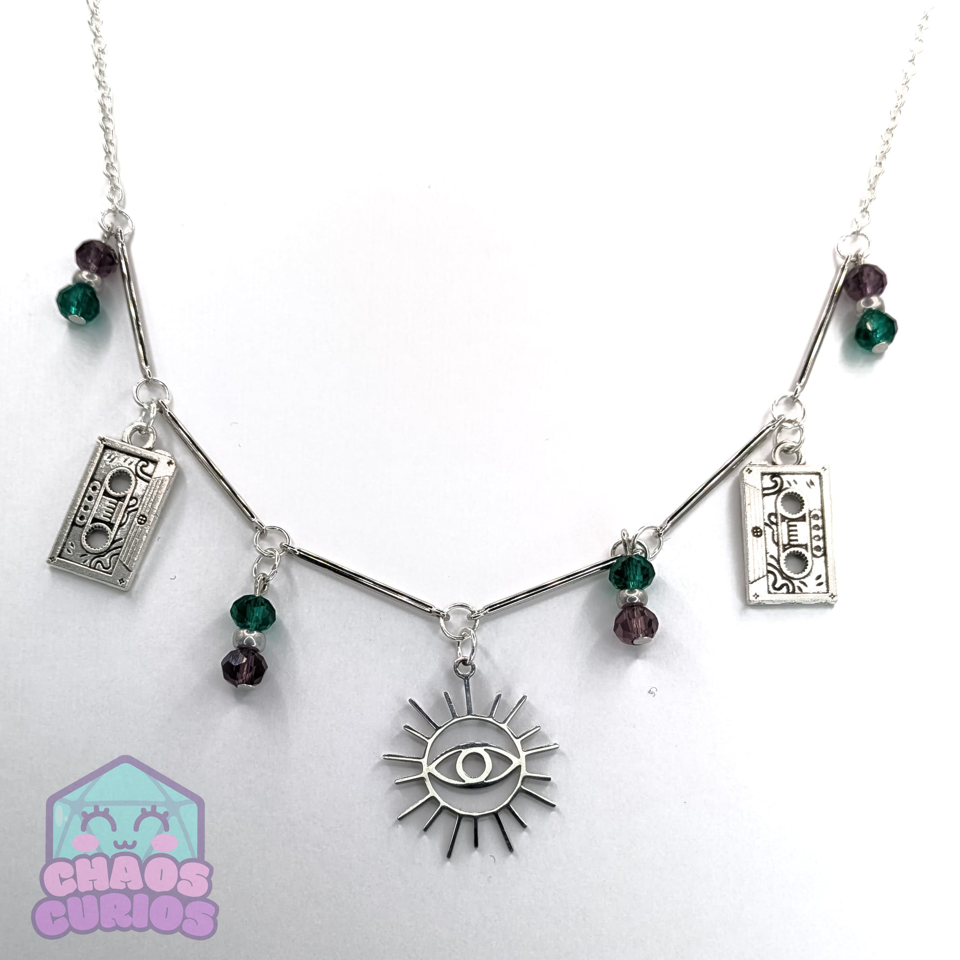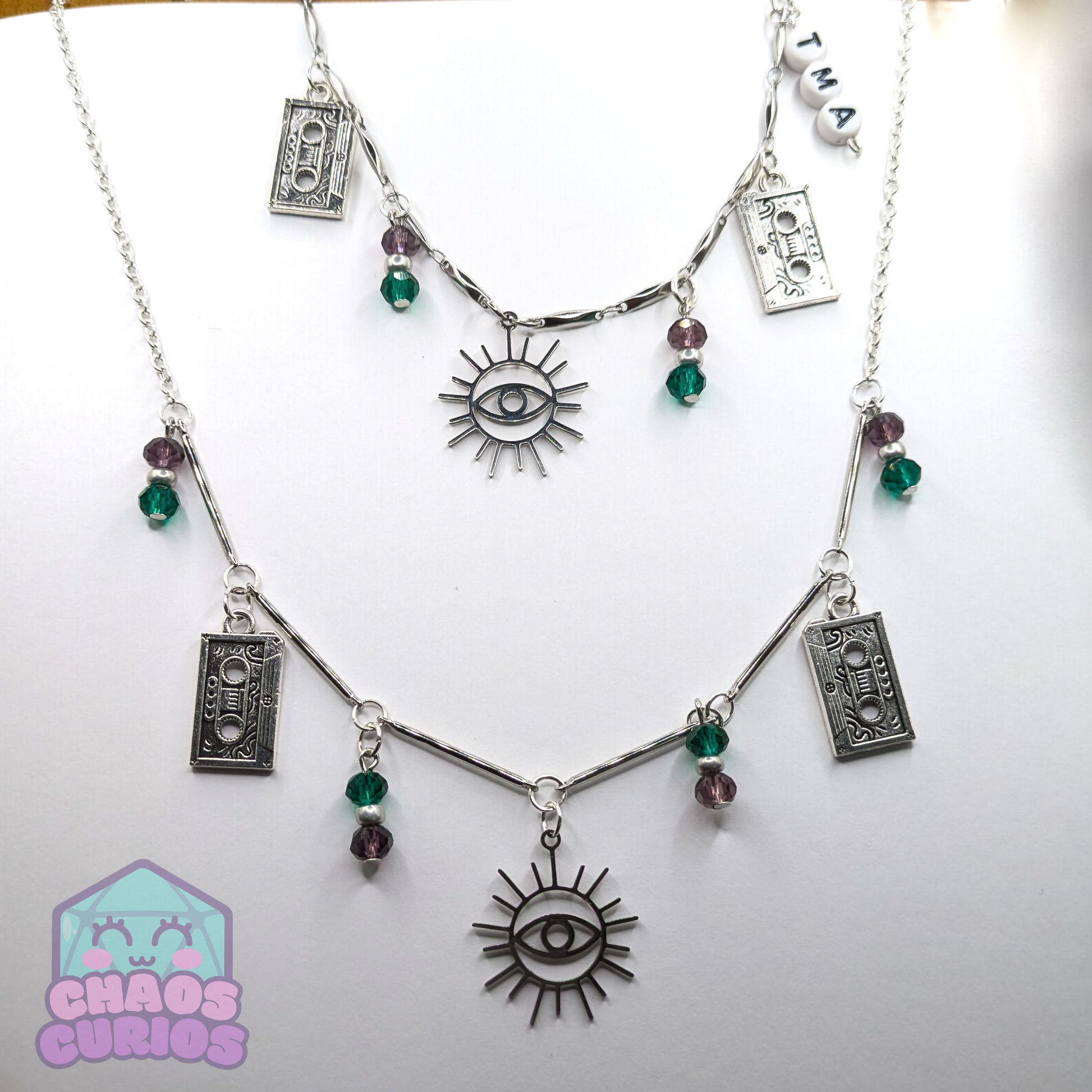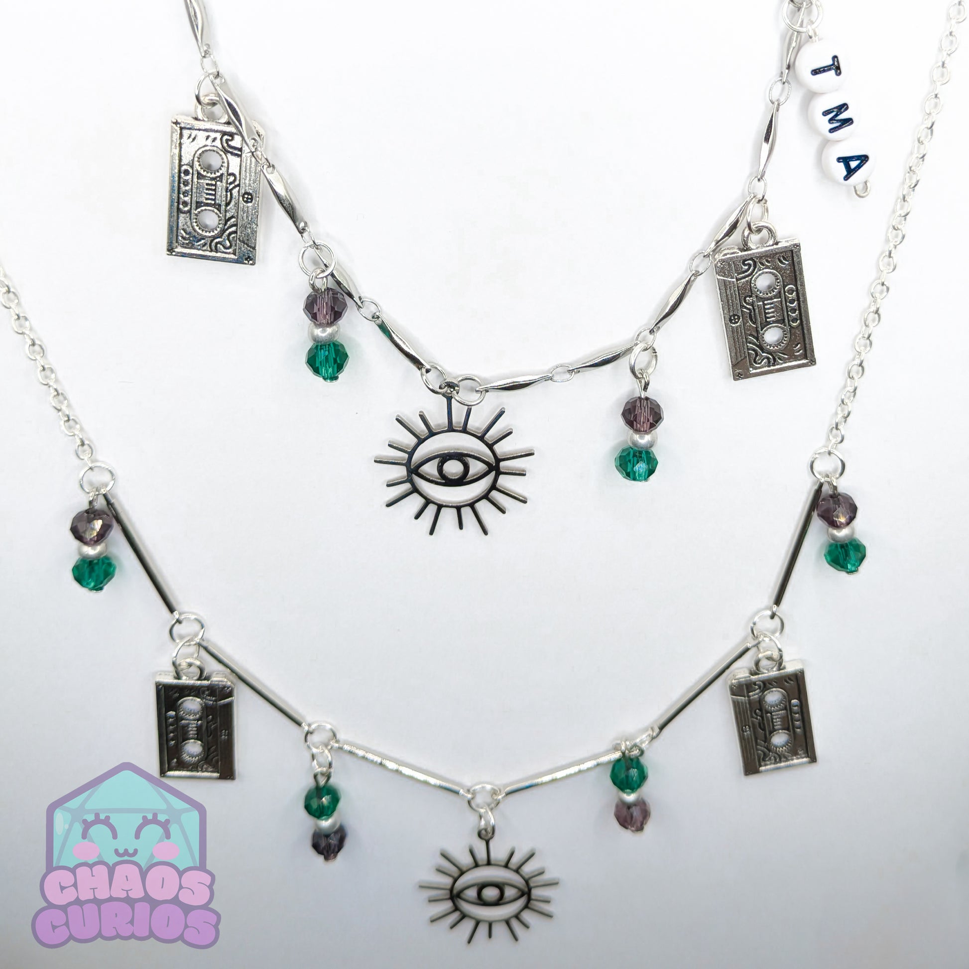 A handcrafted necklace, inspired by The Magnus Archives. Features a laser cut Eye symbol, beading details and 2 Tibetan tape charms.