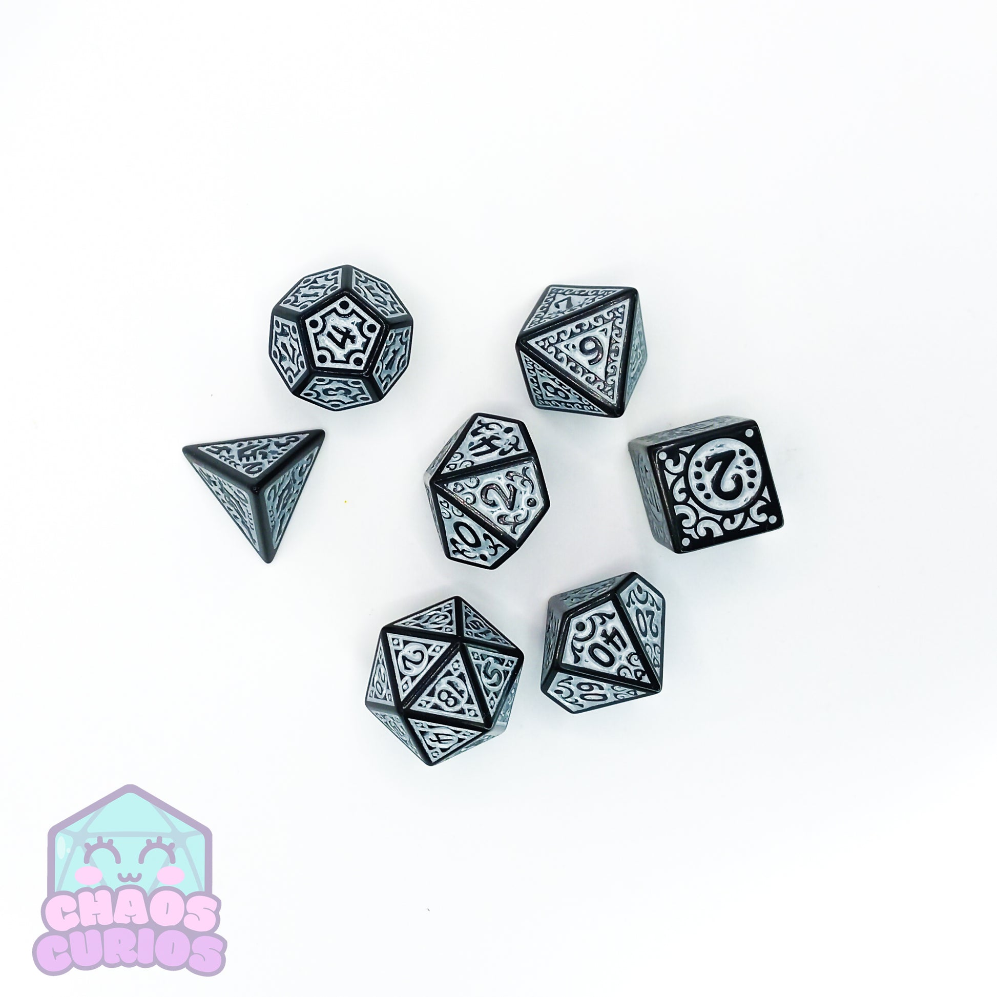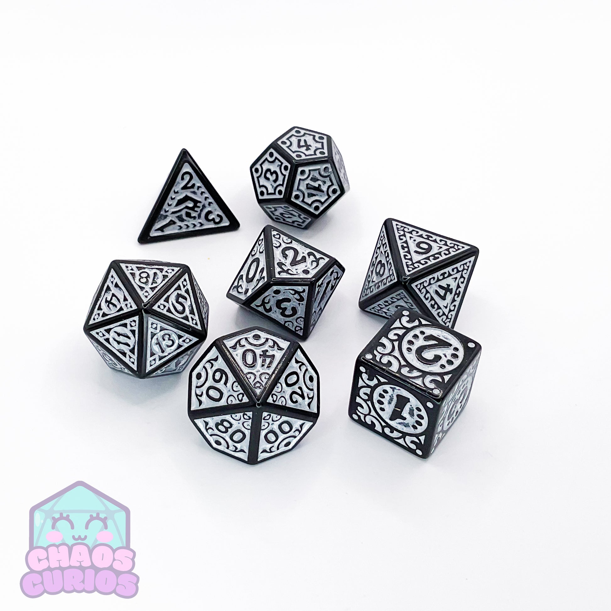 Roll the dice with style with this White Black Glyph 7-piece Dice Set! Lookin' sharp with its unique glyph window design, your gaming get-togethers will be elevated to a whole new level of extra. Get ready for the luckiest of throws! 🎲